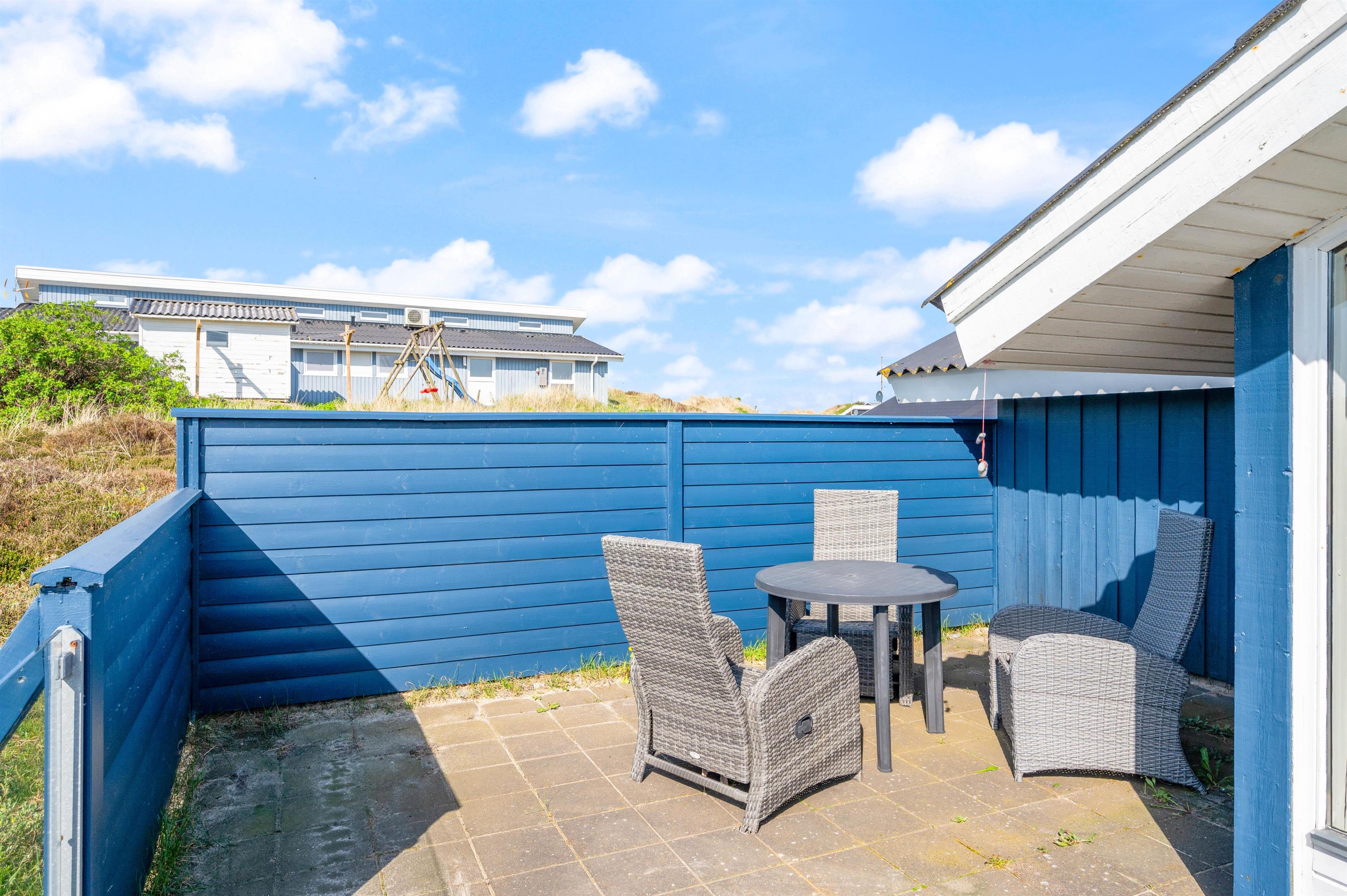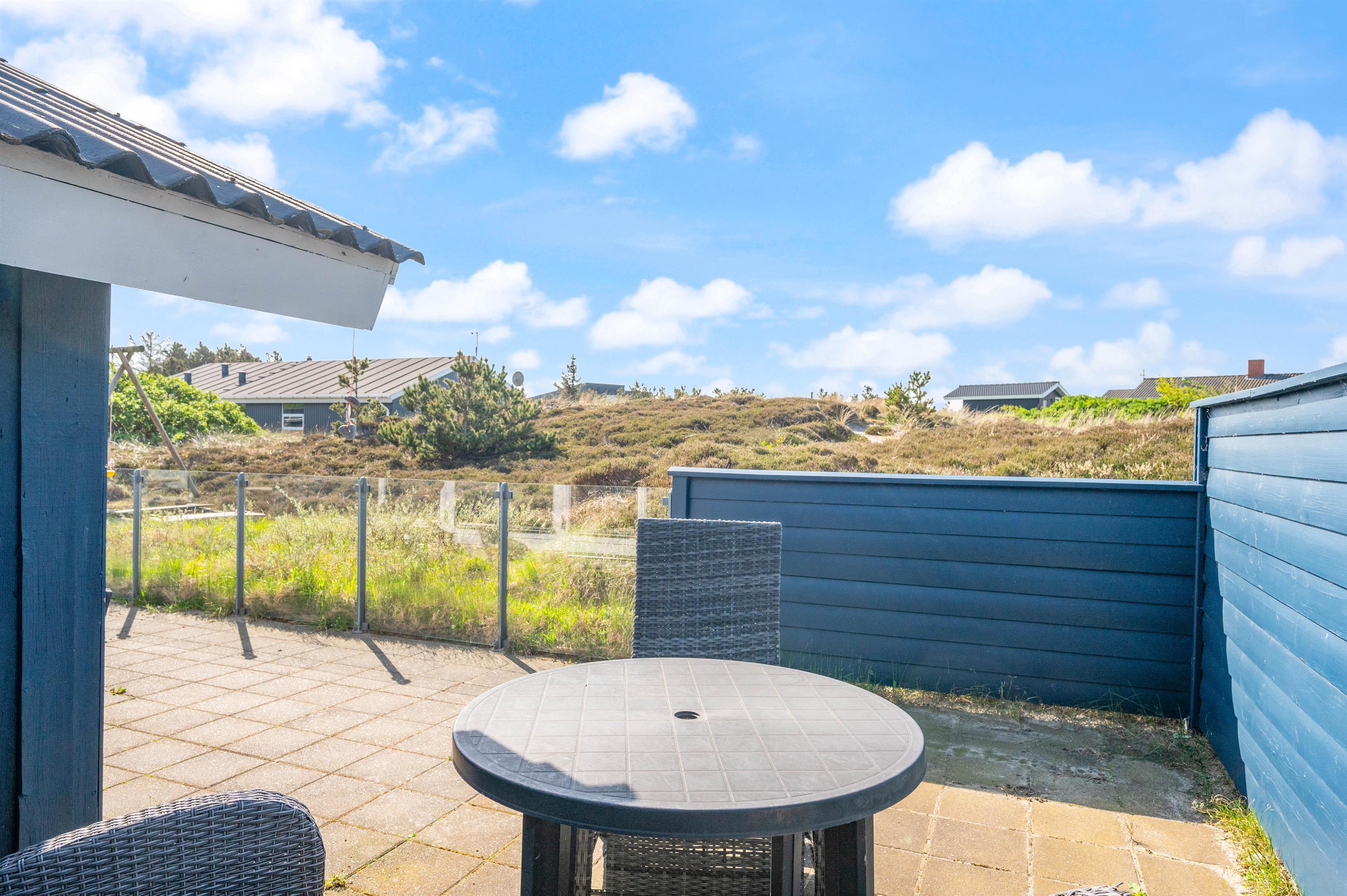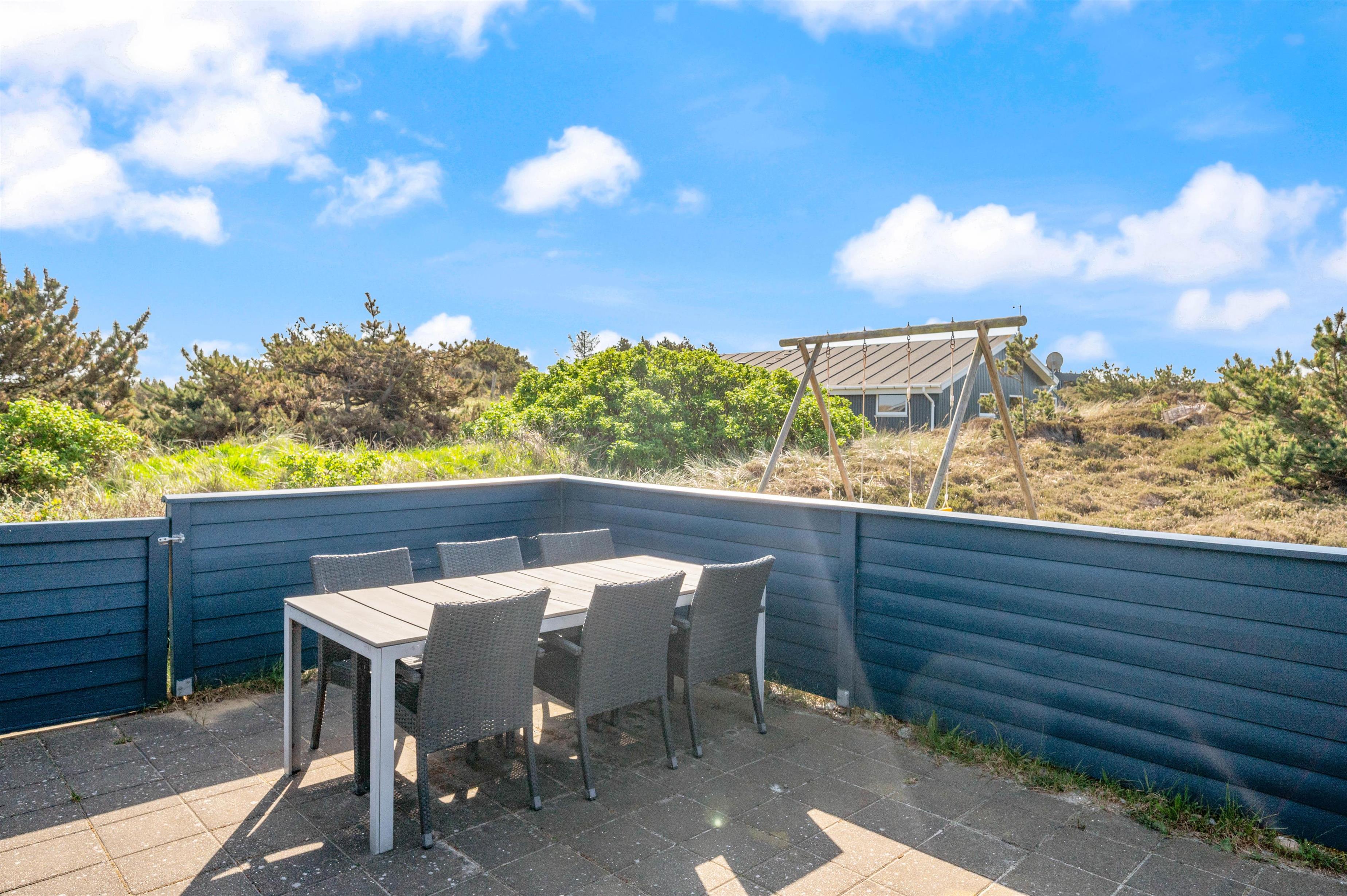 Udendørs finder I en lukket, flisebelagt terrasse, hvor I kan nyde udelivet. Her er gode muligheder for at tilbringe tid sammen, enten mens I slapper af og nyder solen, eller mens I laver en lækker middag på grillen til en hyggelig grillaften. For børnene er der også en gynge og en sandkasse på naturgrunden, så de kan lege og udfolde sig i trygge og hyggelige omgivelser, mens I nyder feriens ro.