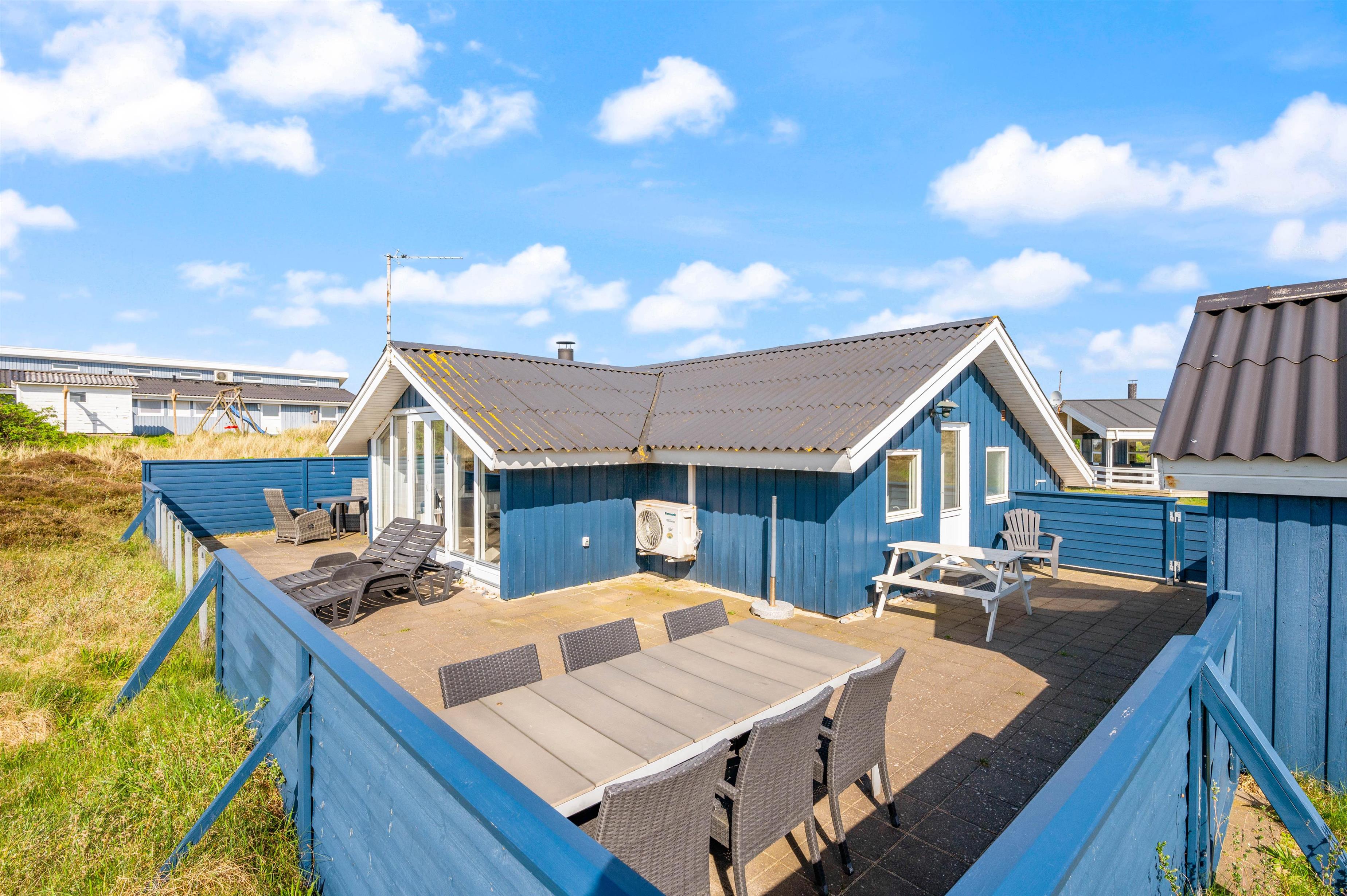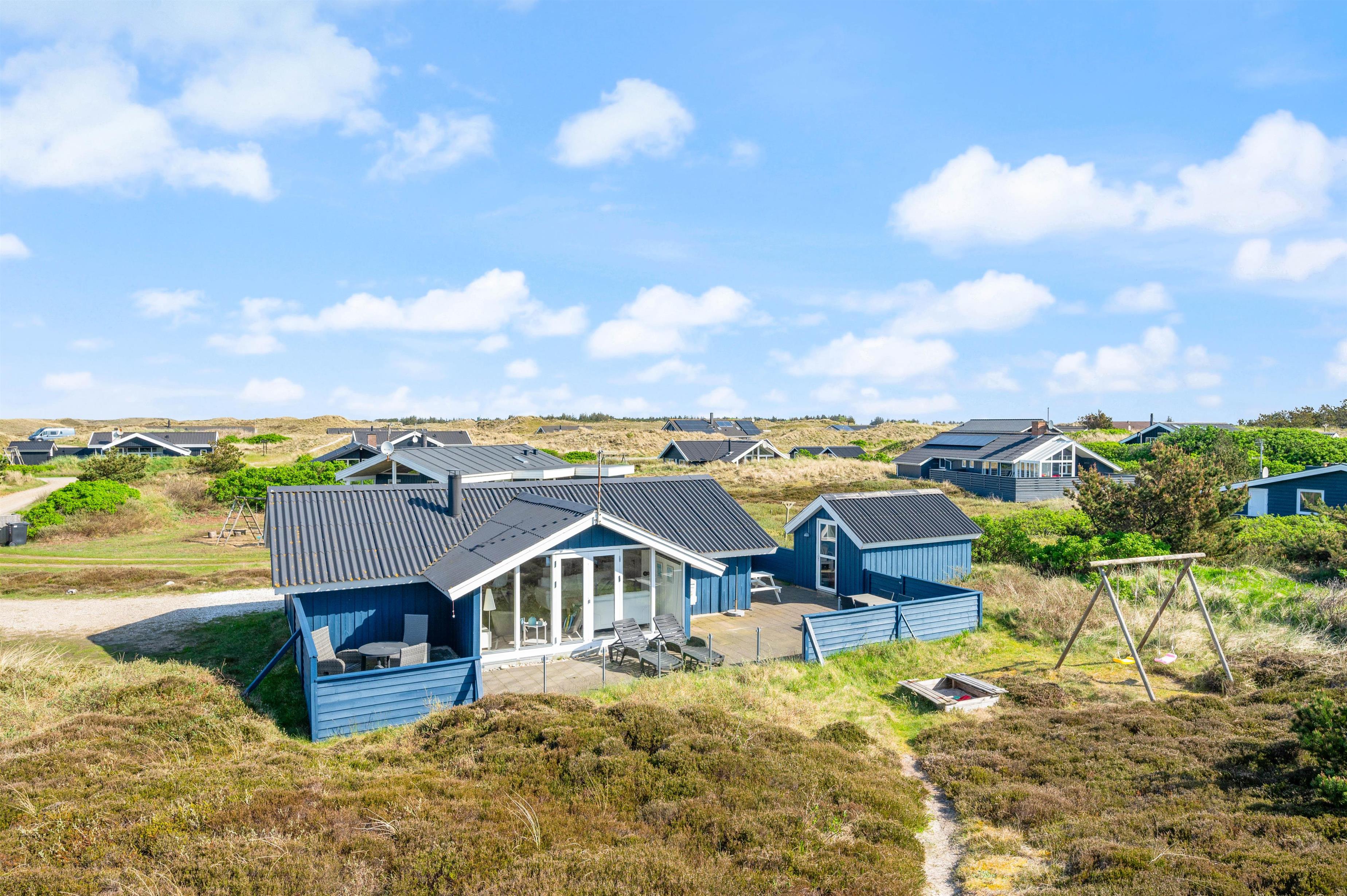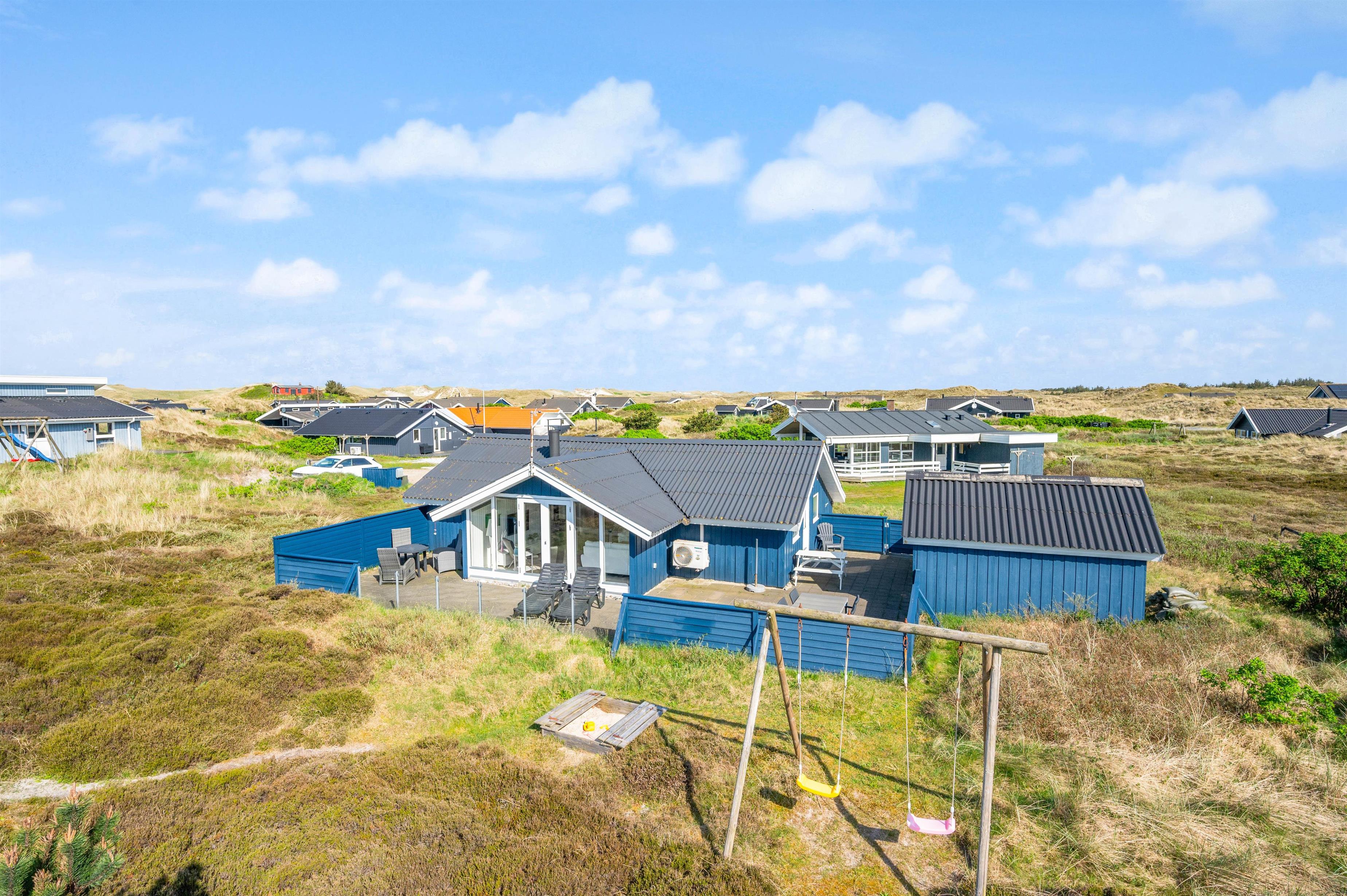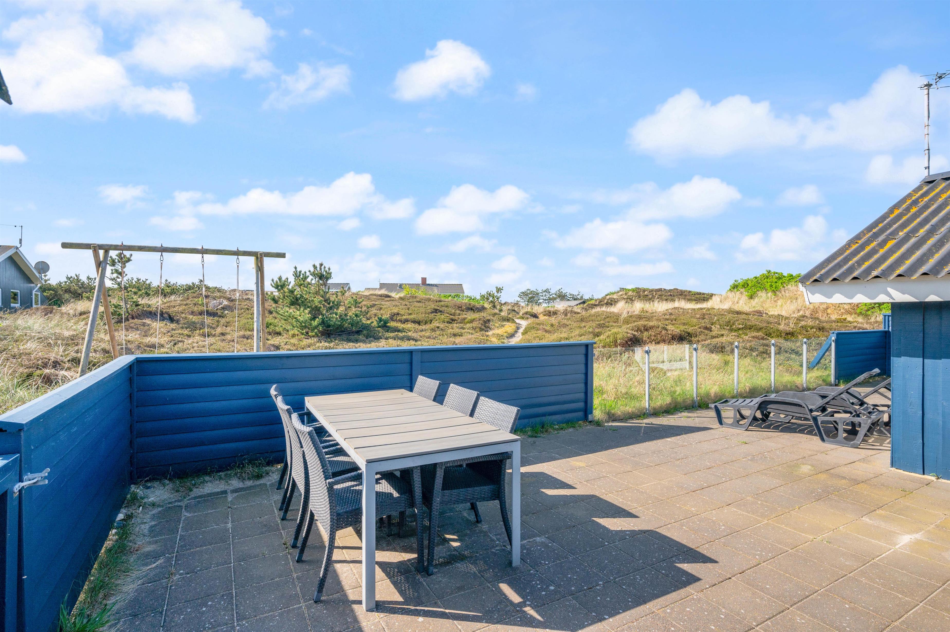 Udendørs finder I en lukket, flisebelagt terrasse, hvor I kan nyde udelivet. Her er gode muligheder for at tilbringe tid sammen, enten mens I slapper af og nyder solen, eller mens I laver en lækker middag på grillen til en hyggelig grillaften. For børnene er der også en gynge og en sandkasse på naturgrunden, så de kan lege og udfolde sig i trygge og hyggelige omgivelser, mens I nyder feriens ro.