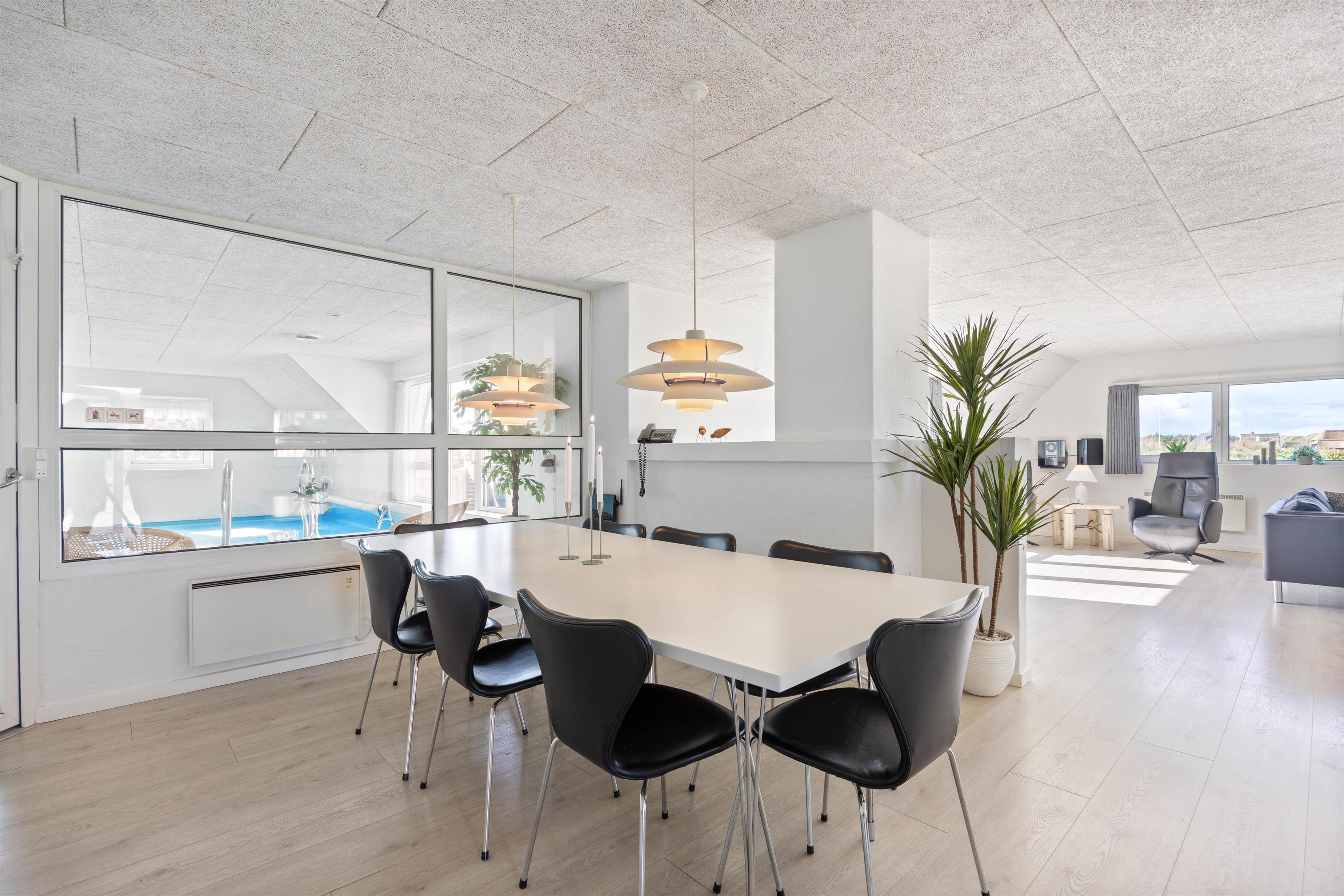 På Toppebjerg 2 i Bjerregård finder I dette fine sommerhus med sauna, spabad og swimmingpool med modstrømsanlæg. Her er plads til 10 feriegæster og 2 hunde, som kan nyde en skøn ferie i det hyggelige sommerhus. På den lukkede terrasse kan I hygge jer med gode venner og et lækkert grillmåltid på en lun sommeraften.
