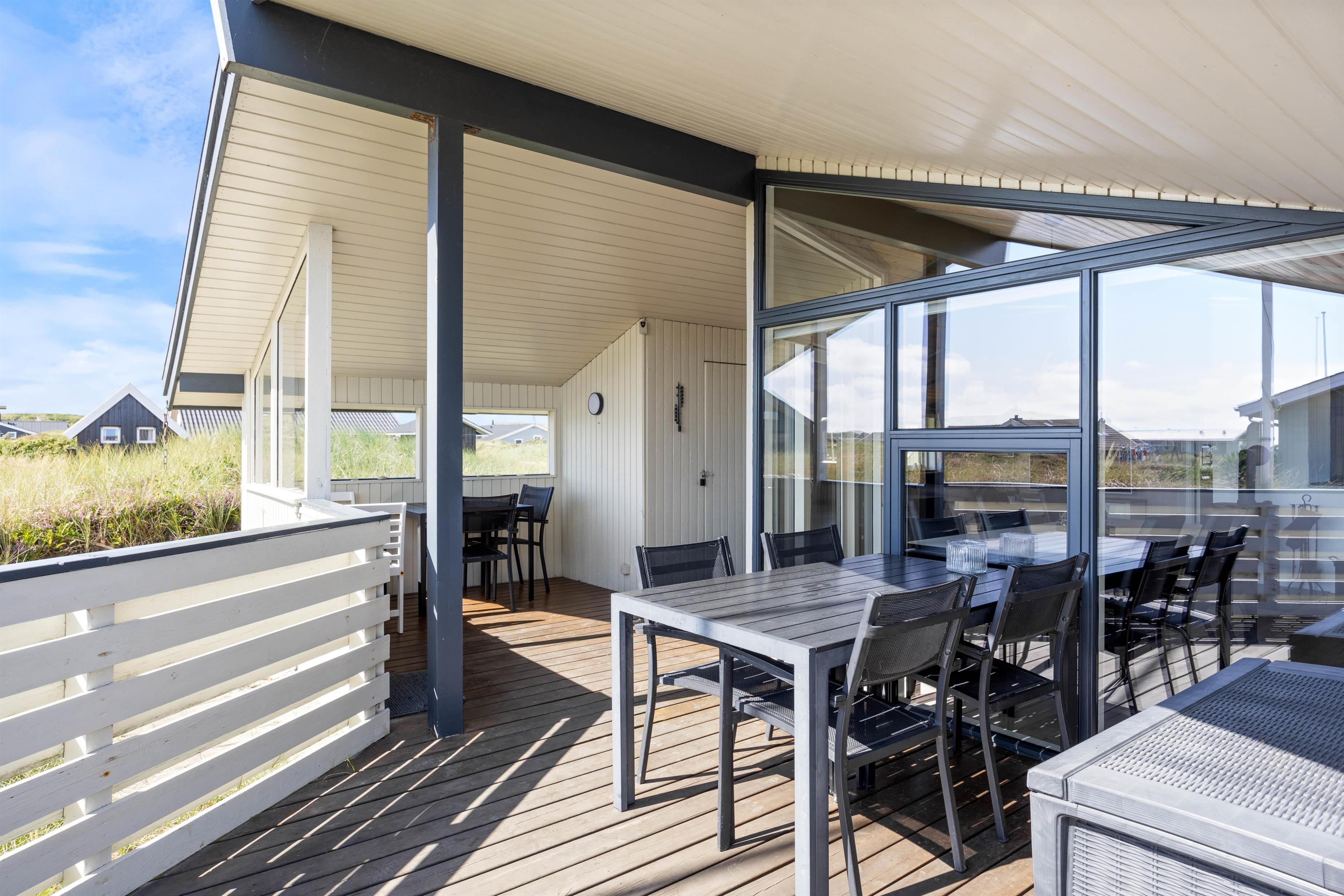 Fra alrummet har I udgang til en af sommerhusets 2 terrasser. Den største terrasse er både delvist overdækket, afskærmet og lukket. Her kan I altså sidde i læ for en lille regnbyge og også lade de små eller hunden gå frit.