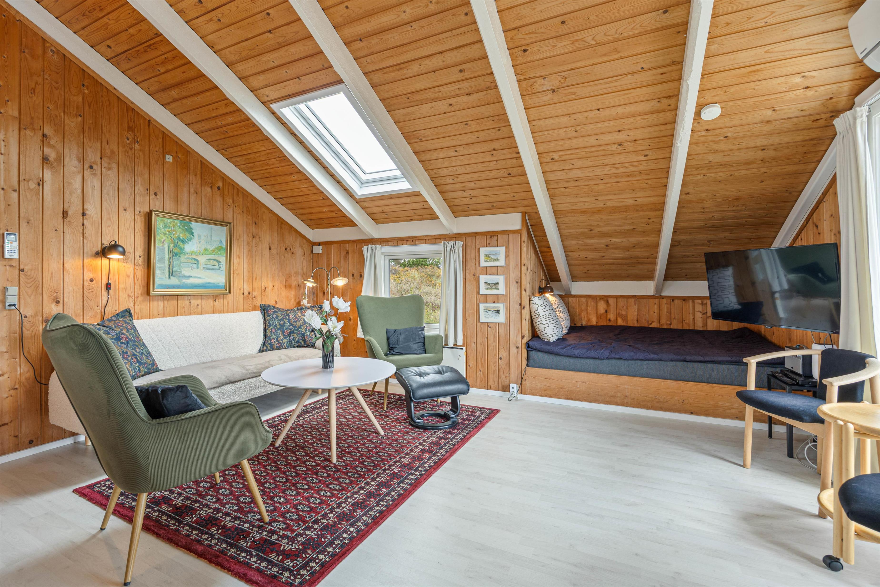 Indretningen af feriehuset er enkel, men praktisk. Stuen har en brændeovn, der skaber hygge på kølige dage, samt en varmepumpe, der sikrer et behageligt indeklima. Her er også en fin alkove, der er ideel til en lur efter en oplevelsesrig feriedag. Det lille køkken er åbent integreret i stuen og udstyret med opvaskemaskine, komfur, ovn og de vigtigste køkkenredskaber – ideelt til at tilberede måltider sammen.