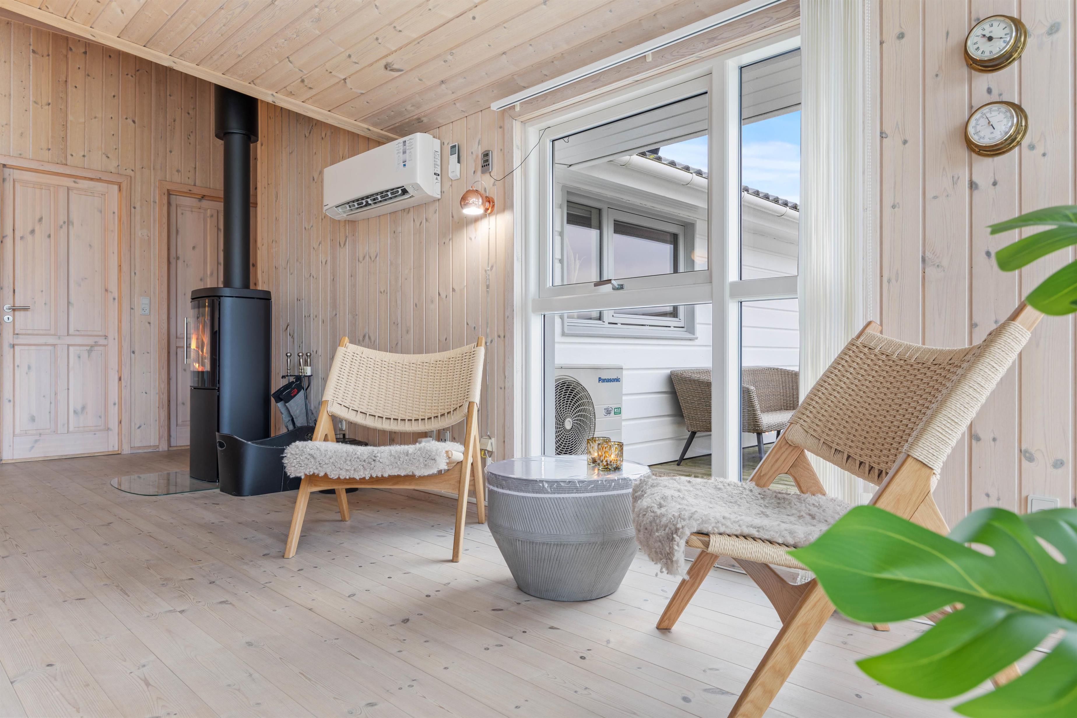 Så snart I træder ind i dette fine, klassiske sommerhus på Bjerregårdsvej 8, vil I hurtigt føle jer godt tilpas. Her bliver I nemlig mødt af den lyse, hyggelige indretning og de store vinduer, som inviterer dagslyset ind i stuen, feriehusets hjerte. Stuen, der ligger i åben forbindelse med spiseplads og det funktionelle køkken, er feriehusets samlingspunkt. Her kan I være fælles om madlavningen, spille brætspil og slappe af på sofaen med en god film, der streames via Chromecastet. Pop popcornene og tænd op i brændeovnen, der skaber den rette feriestemning. Praktisk er her også en energibesparende varmepumpe, der sørger for et behageligt indeklima.
