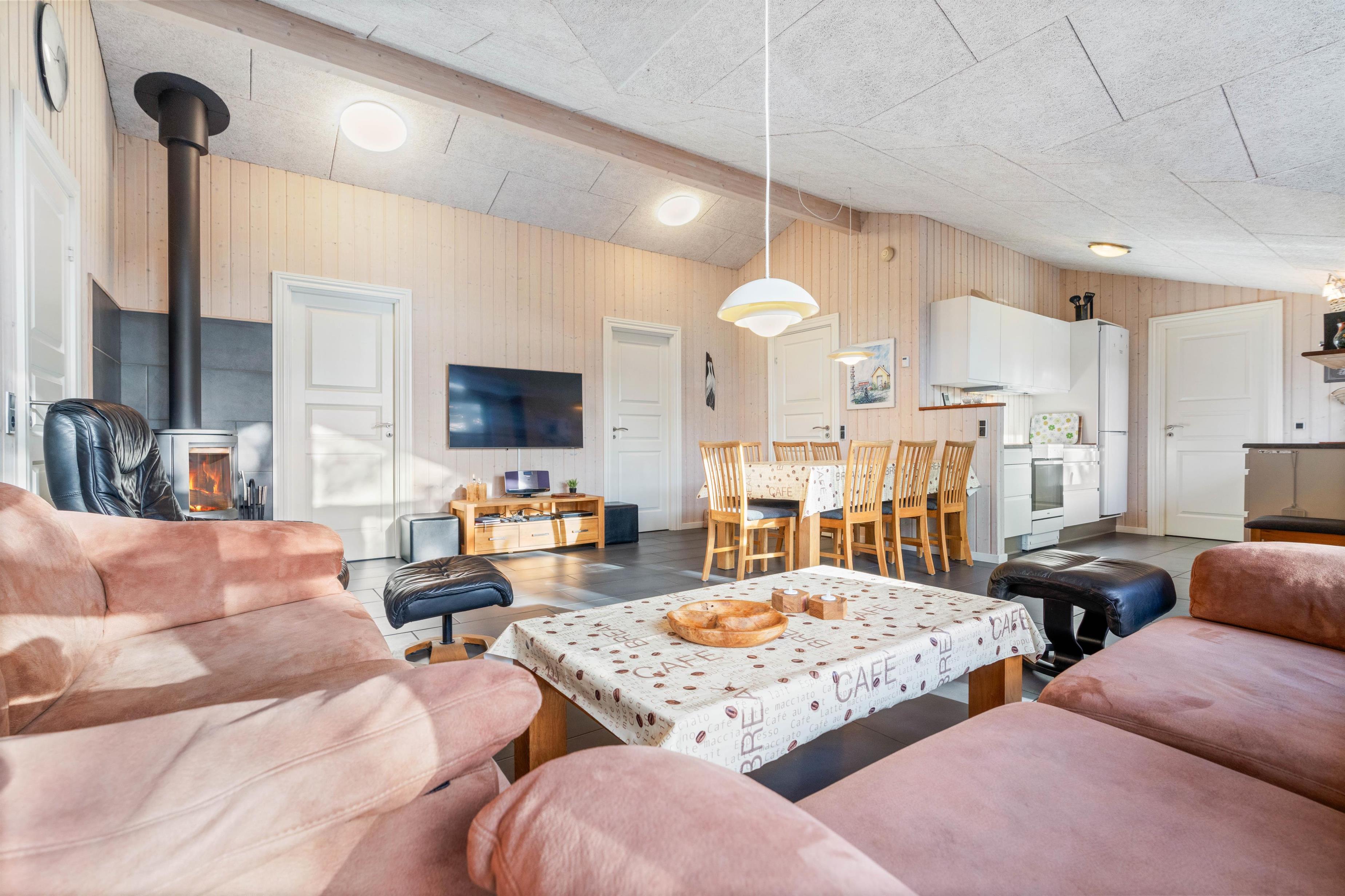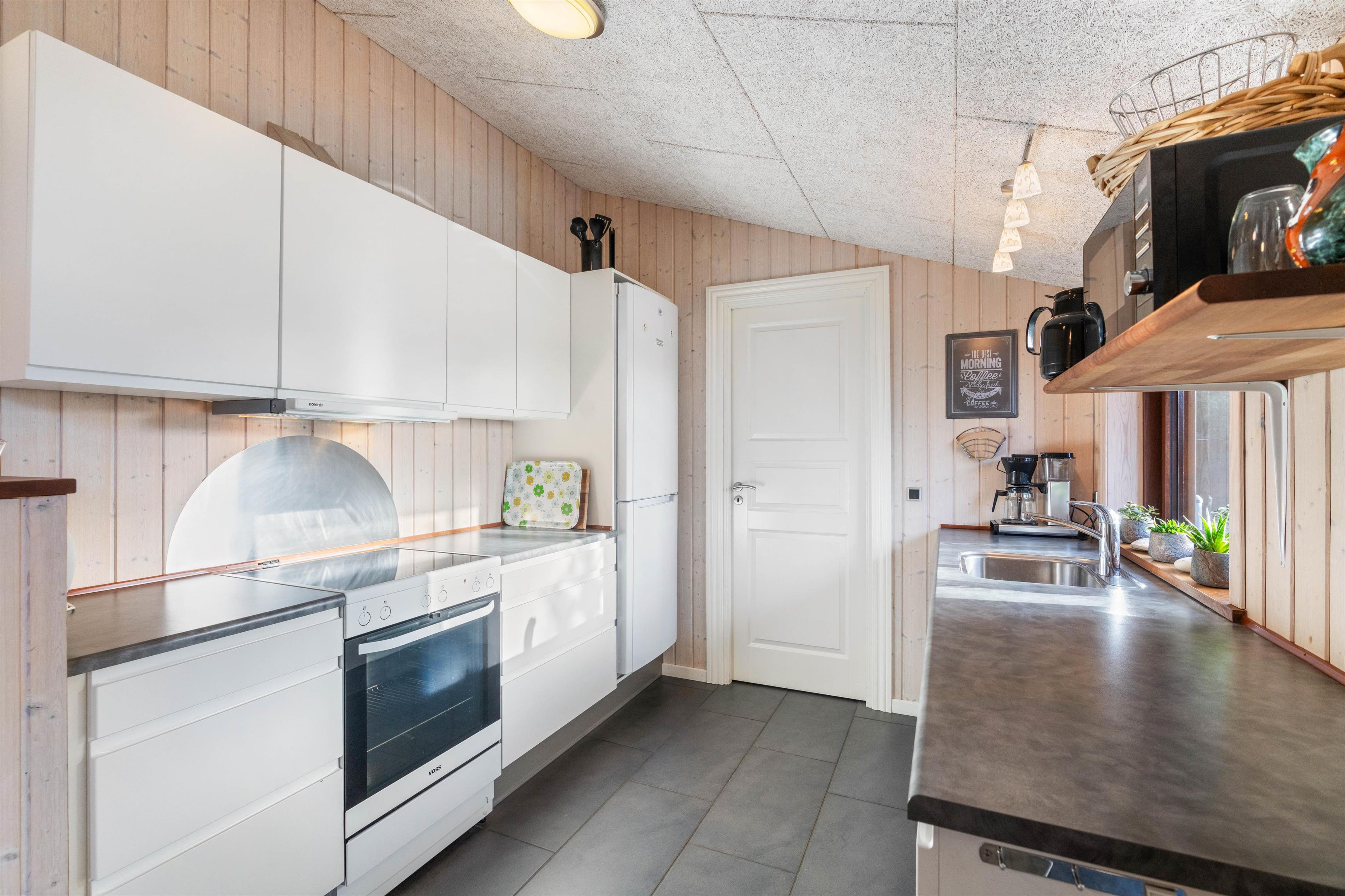 Køkkenet er veludstyret, der er en opvaskemaskine, en mikroovn og en fryser på 50 L. Der er loft til kip i stuen, hvor der er en flot brændeovn, der er fladskærms-TV og DVD. Alle fjernsyn i huset har egen signalindgang og danske betalingskanaler som f.eks. TV2. Fra stue er der udgang til den skønne og sydvendte lukkede terrasse.