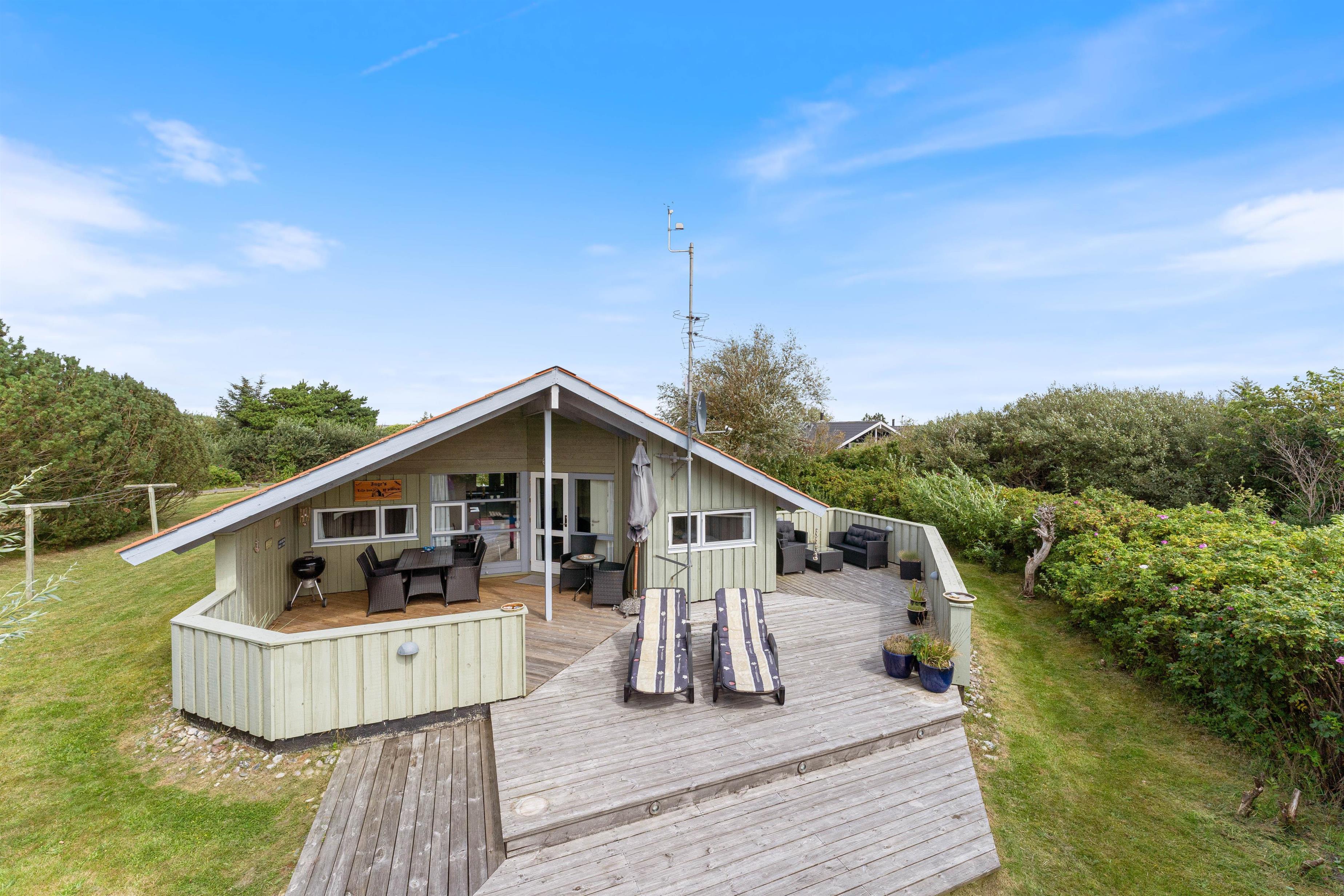 På den store terrasse, som er delvist afskærmet og delvist overdækket, kan I altid finde en god plads til afslapning. Tag solbad i de komfortable liggestole, slap af eller nyd en drink i havemøblerne, og slå parasollen op, hvis solen bliver for stærk. Børnene kan gå på opdagelse på naturgrunden, lege i sandkassen, gynge eller hoppe i trampolin. Slut dagen af med at tænde op i grillen og nyd et lækkert grillmåltid på terrassen, imens skyggerne bliver lange. Som afslutning på en dejlig dag, kan I tage hunden med på en frisk gåtur til Vesterhavet, hvor I samme kan nyde solnedgangen.