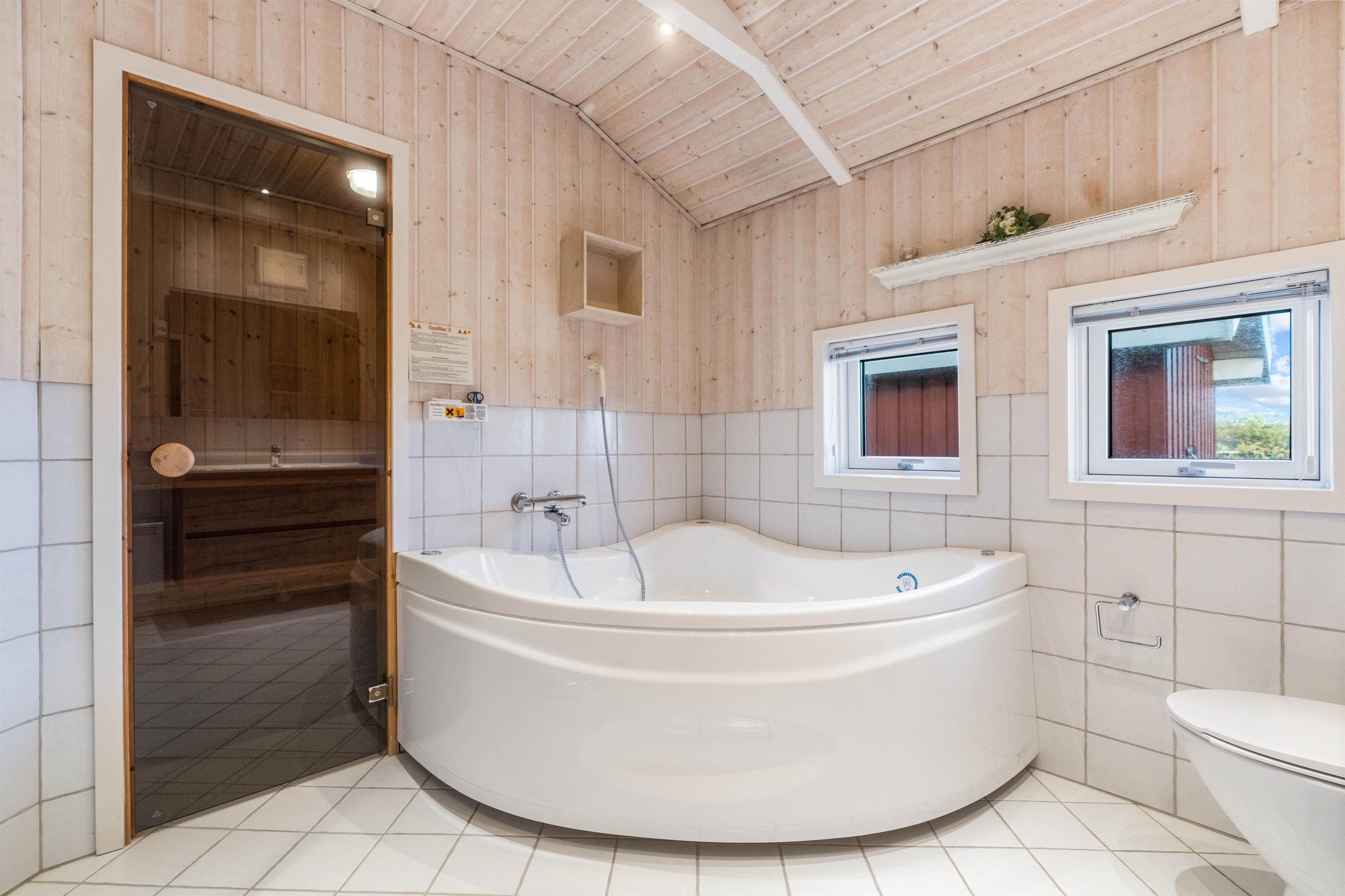 Der er 3 soveværelser i sommerhuset – 2 af dem med fladskærme og DVD-afspiller, hvor I kan tilslutte en medbragt spillekonsol eller se egne film. Badeværelset har både spa og sauna, så I kan slappe af efter en dag i den friske luft.
