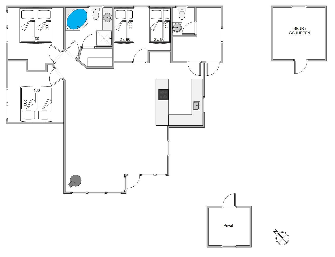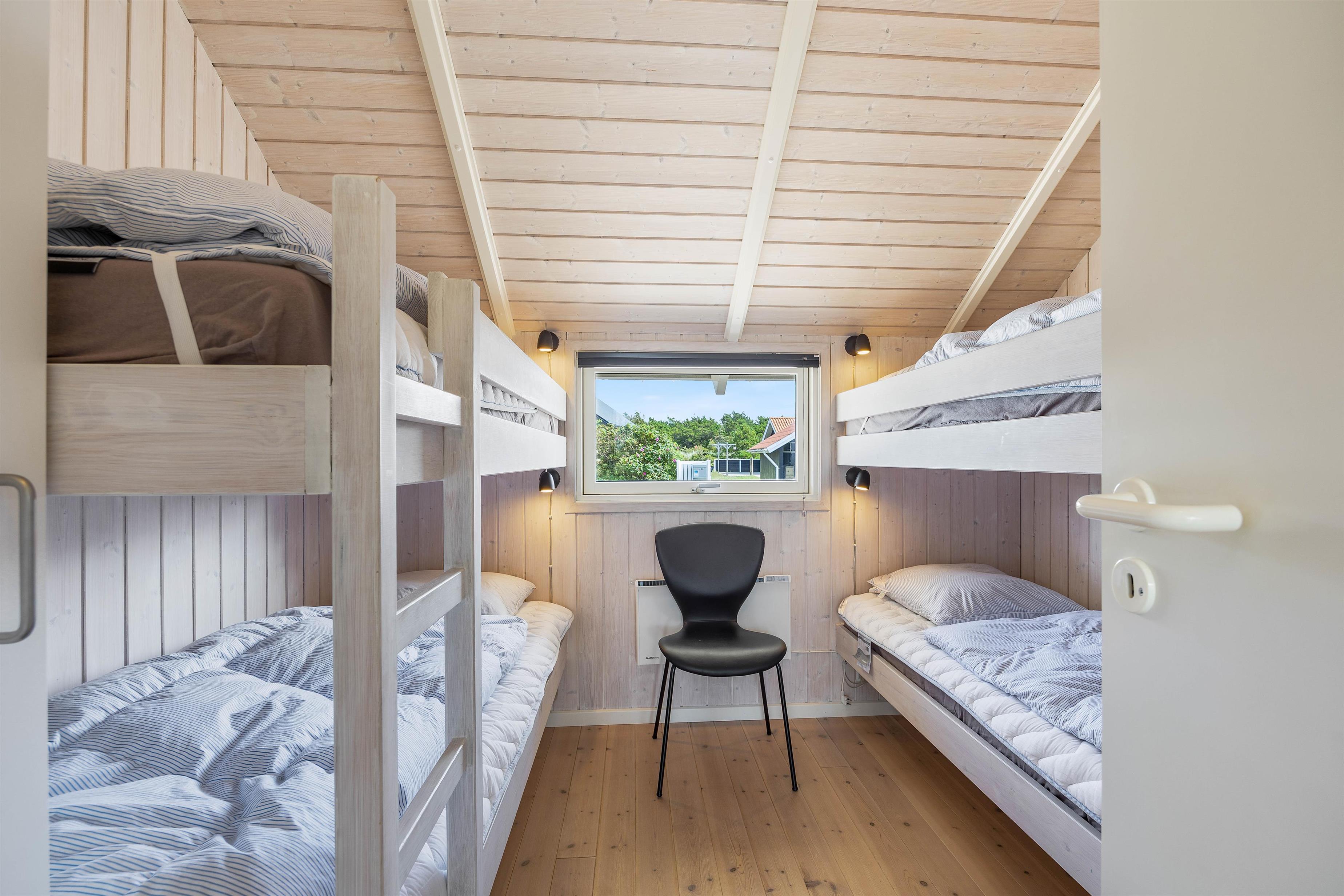 Der er både badeværelse med gulvvarme og gæstetoilet, så I kan undgå ventetider her. I forbindelse med badeværelset er også wellnessafdelingen med spa og sauna. Her kan i blive gennemafslappede før sengetid, så I kan lade op for energien i de komfortable senge, og få udsovet i den friske vesterhavsluft. Der er 2 soveværelser med dobbeltsenge og 1 soveværelser med 2 køjesenge, så der er rigelig plads til de unge også.