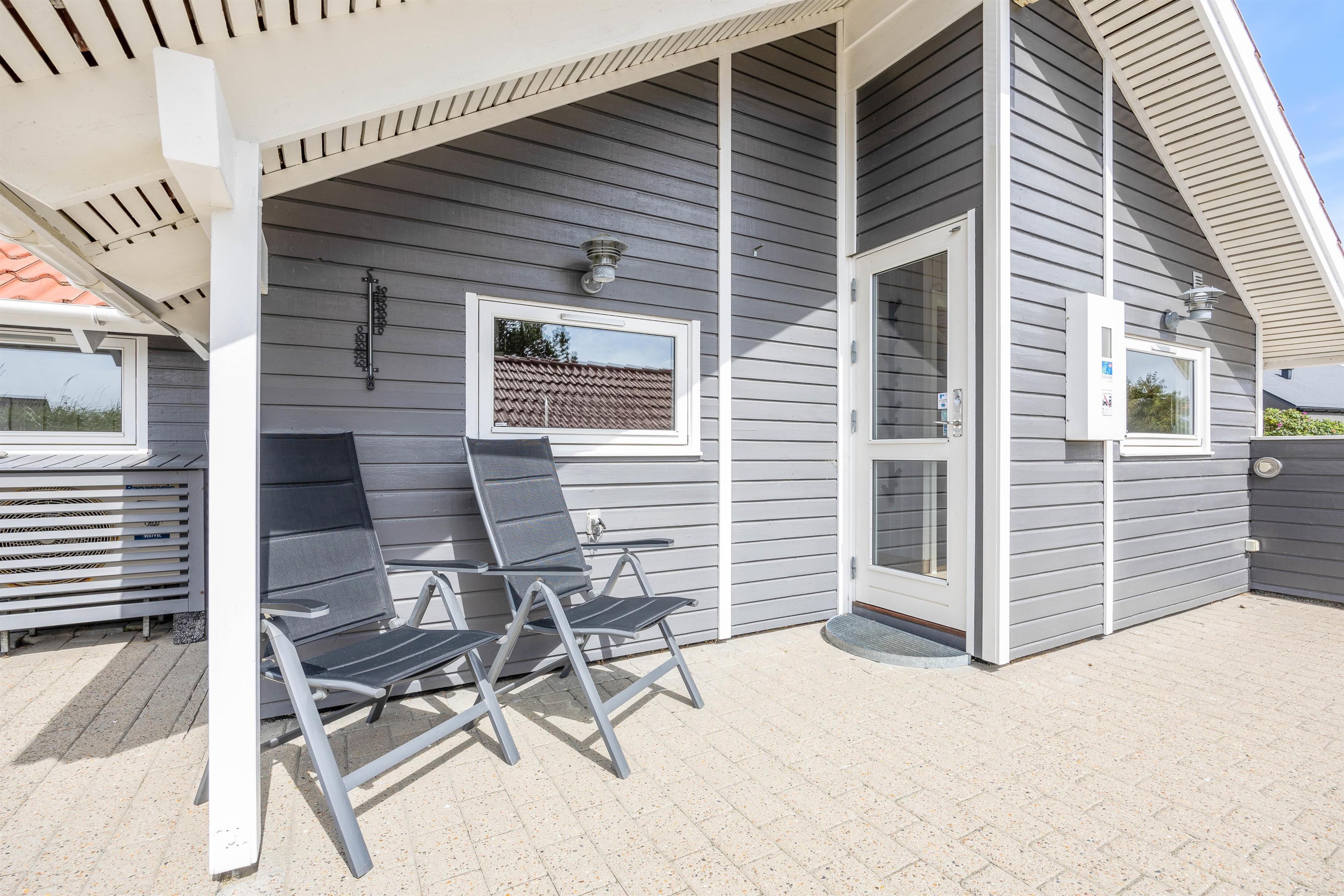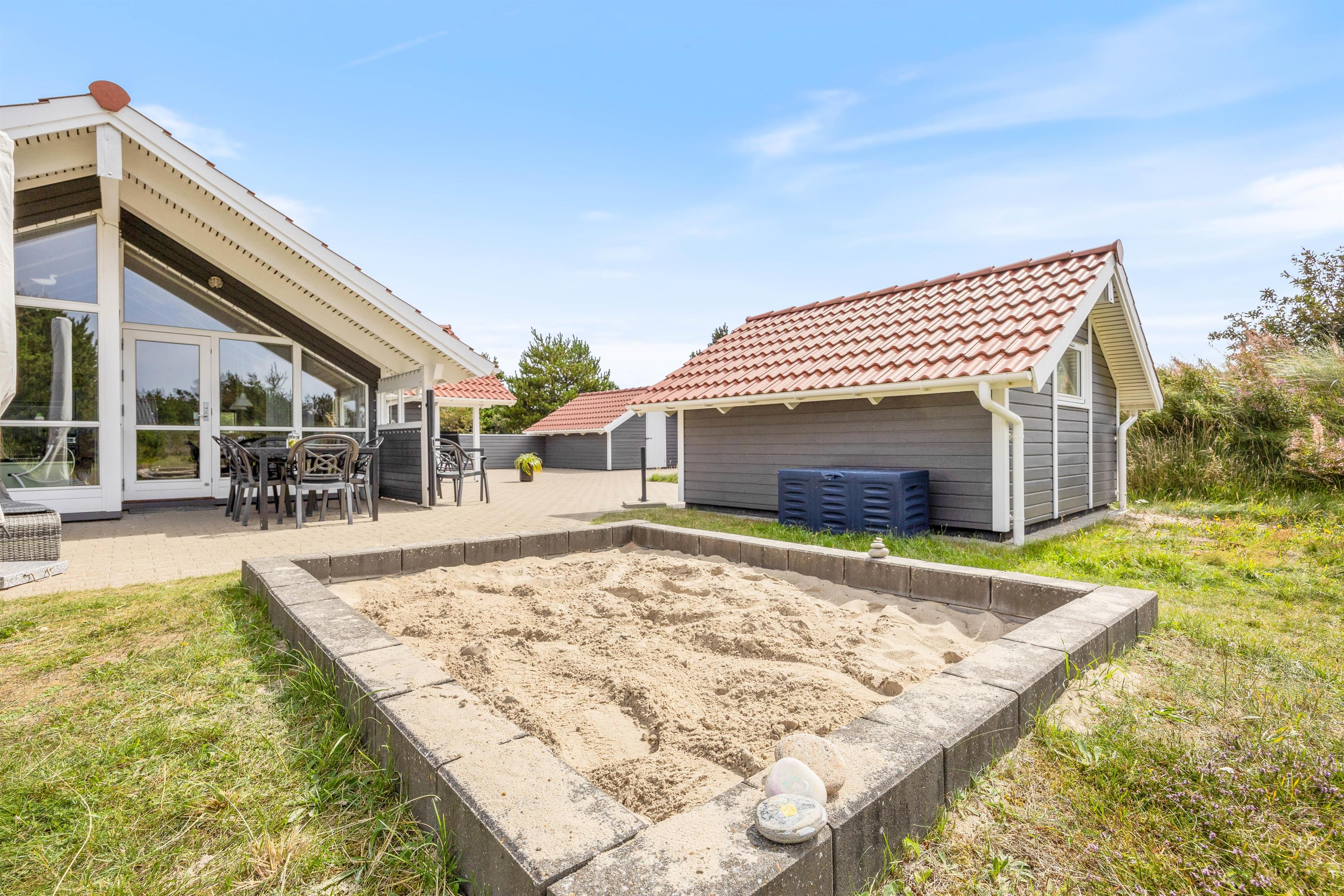 På den rummelige terrasse finder du komfortable havemøbler, hvor du kan slappe af med din yndlingsbog. Terrassen er delvist overdækket, så I kan finde læ for sol og regn. Imens kan jeres børn udforske den store naturgrund, lege i sandkassen eller på gyngerne og rutsjebanen. I kan slutte dagen af med en fælles grillaften, hvor I kan nyde udelivet imens solen går ned.