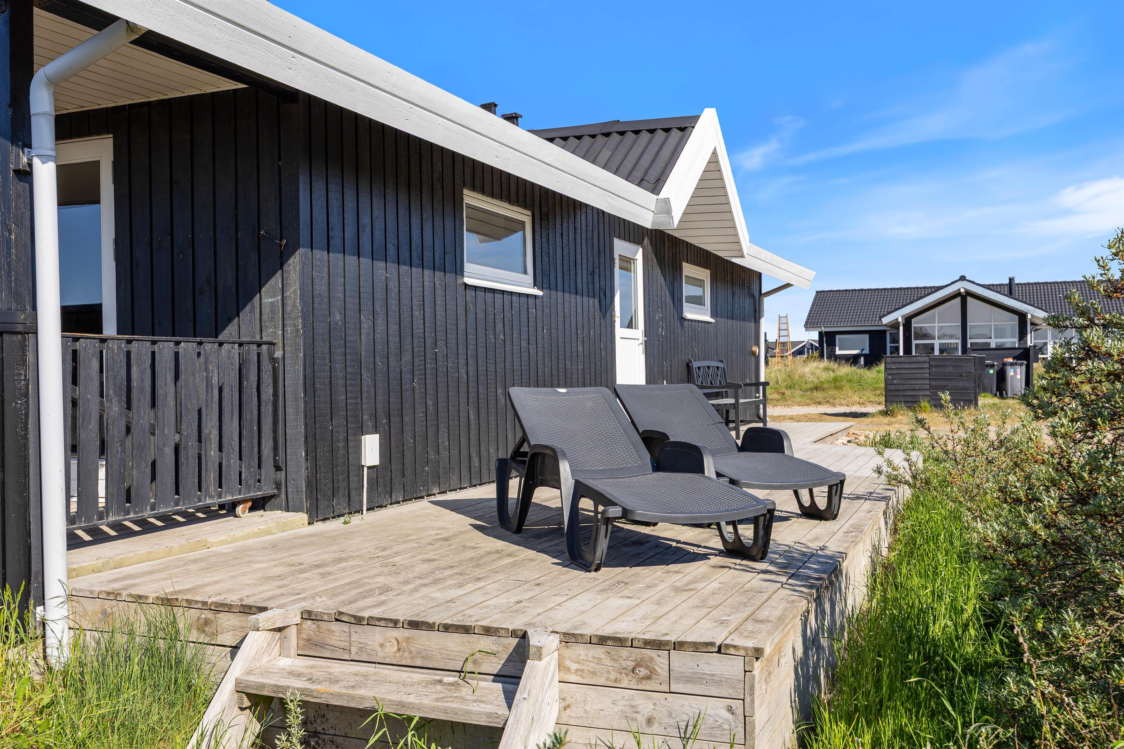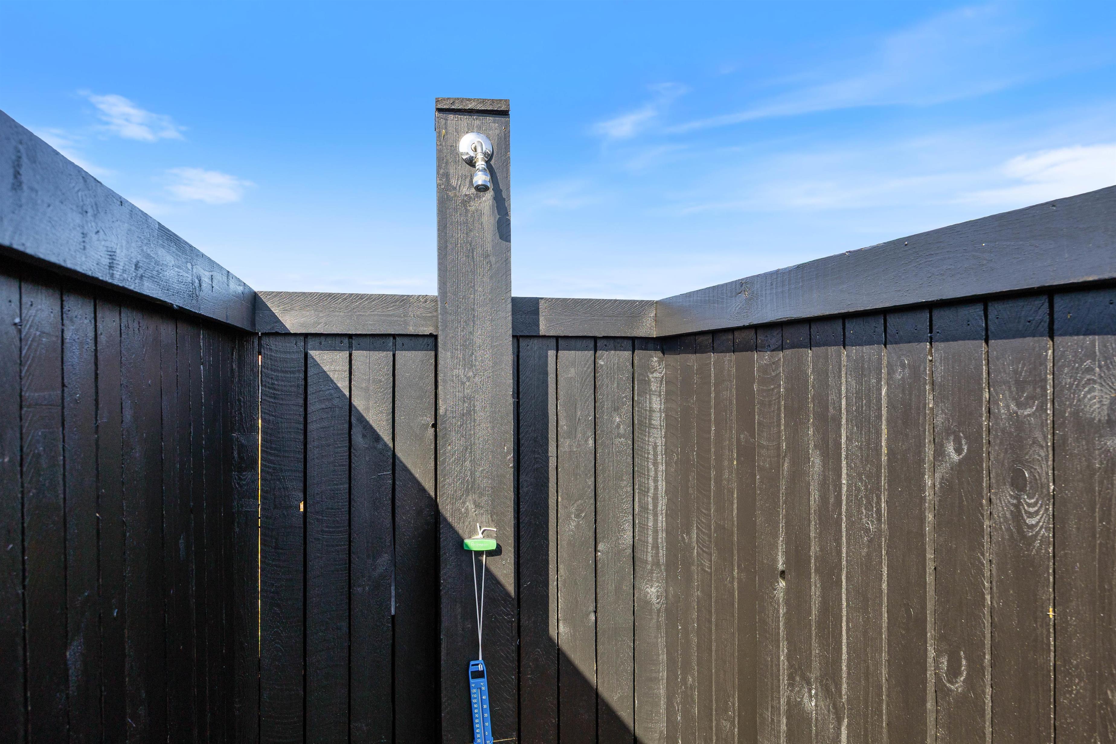 Terrassen indbyder både til solbadning på liggestolene og langstrakte grillaftner. De moderne havemøbler sørger for god komfort, mens overdækningen gør det muligt at nyde aftnerne udendørs lidt længere end ellers. Et af sommerhusets højdepunkter er vildmarksbadet og udebruseren. Udebruseren kan benyttes fra april til november.