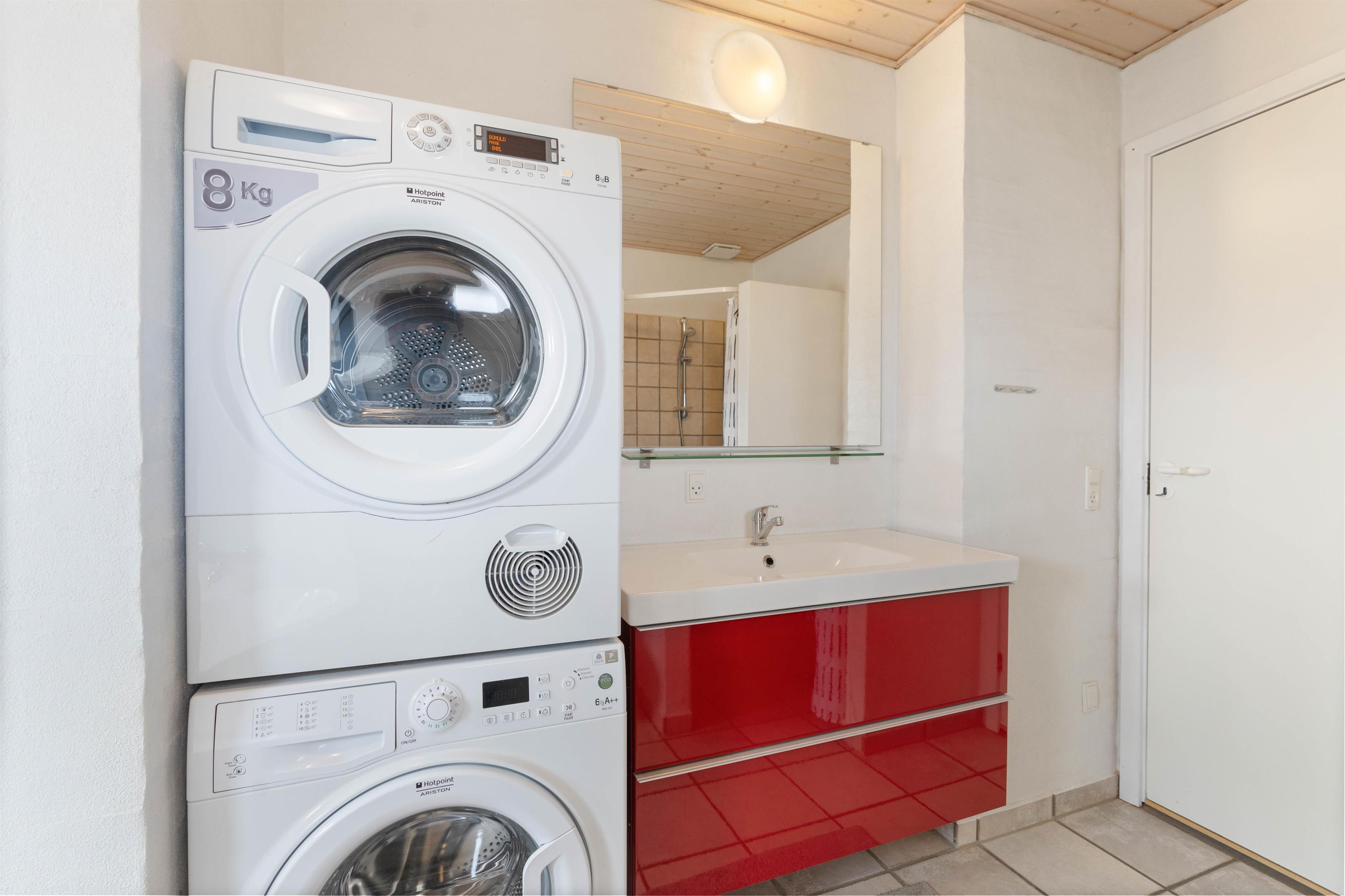 I feriehuset finder i to badeværelser. Det ene er med sauna og det andet med lækkert spa, vaskemaskine og tørretumbler. Efter en skøn dag på stranden, er det nemt at få rene og tørre håndklæder til næste dags strabadser.