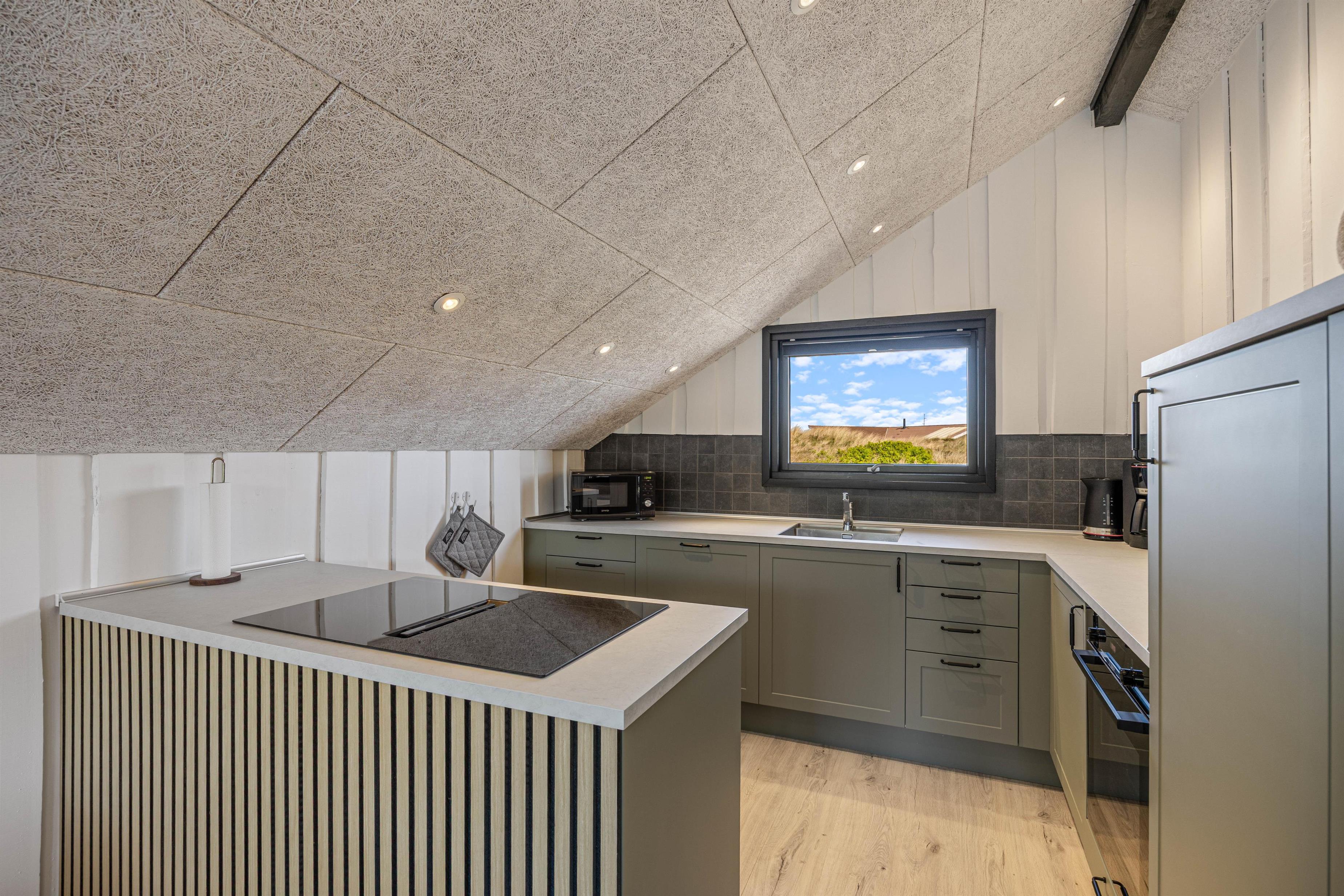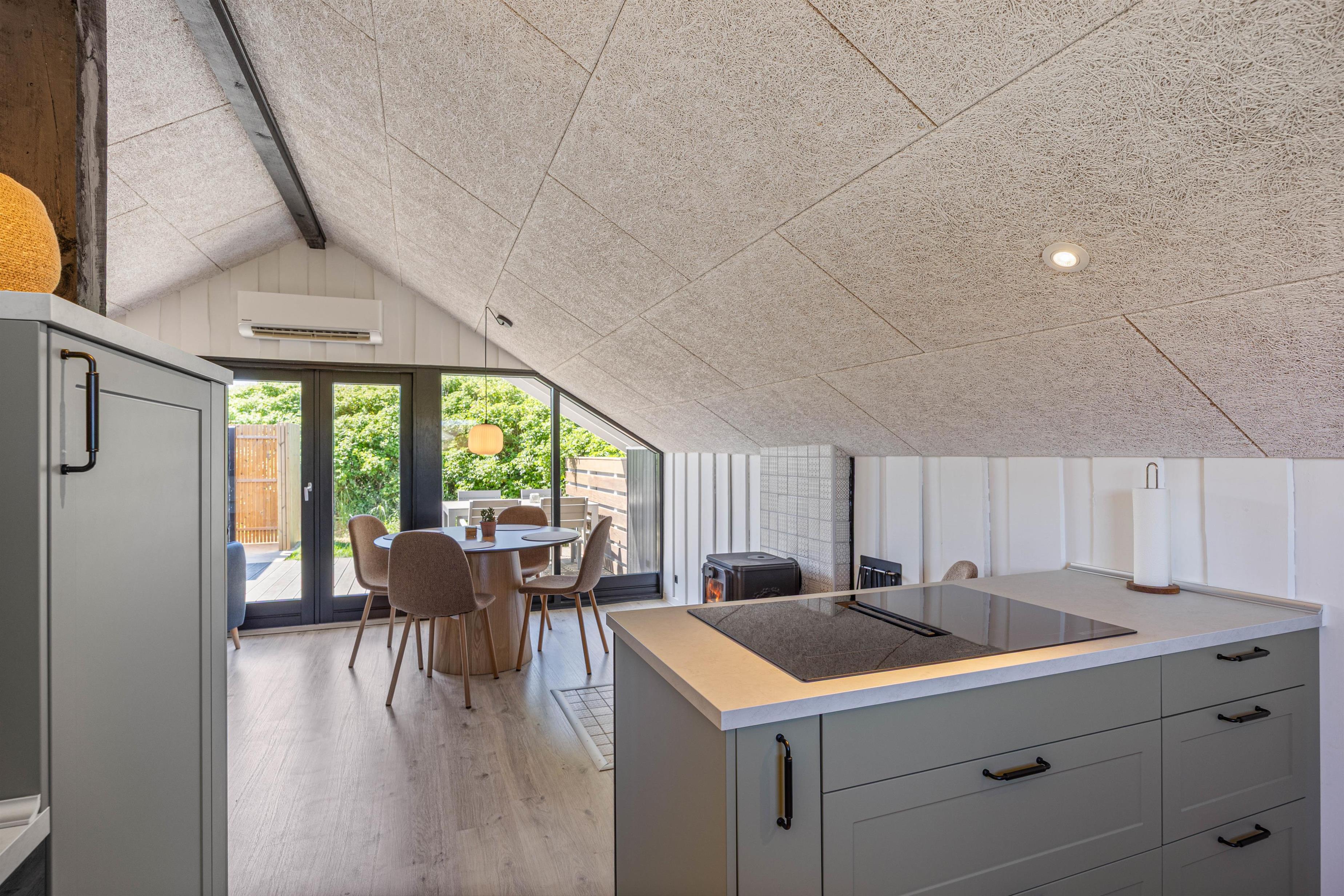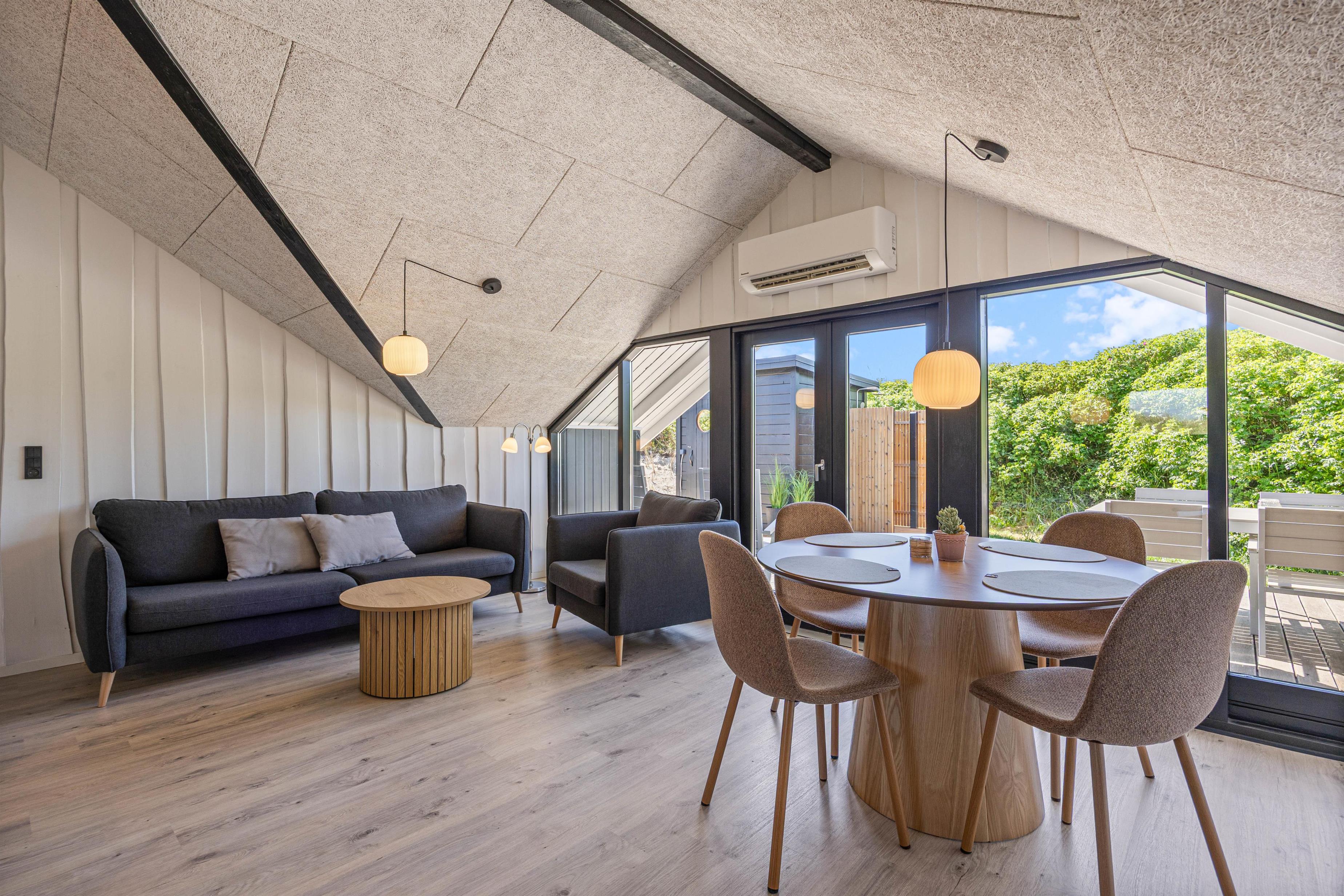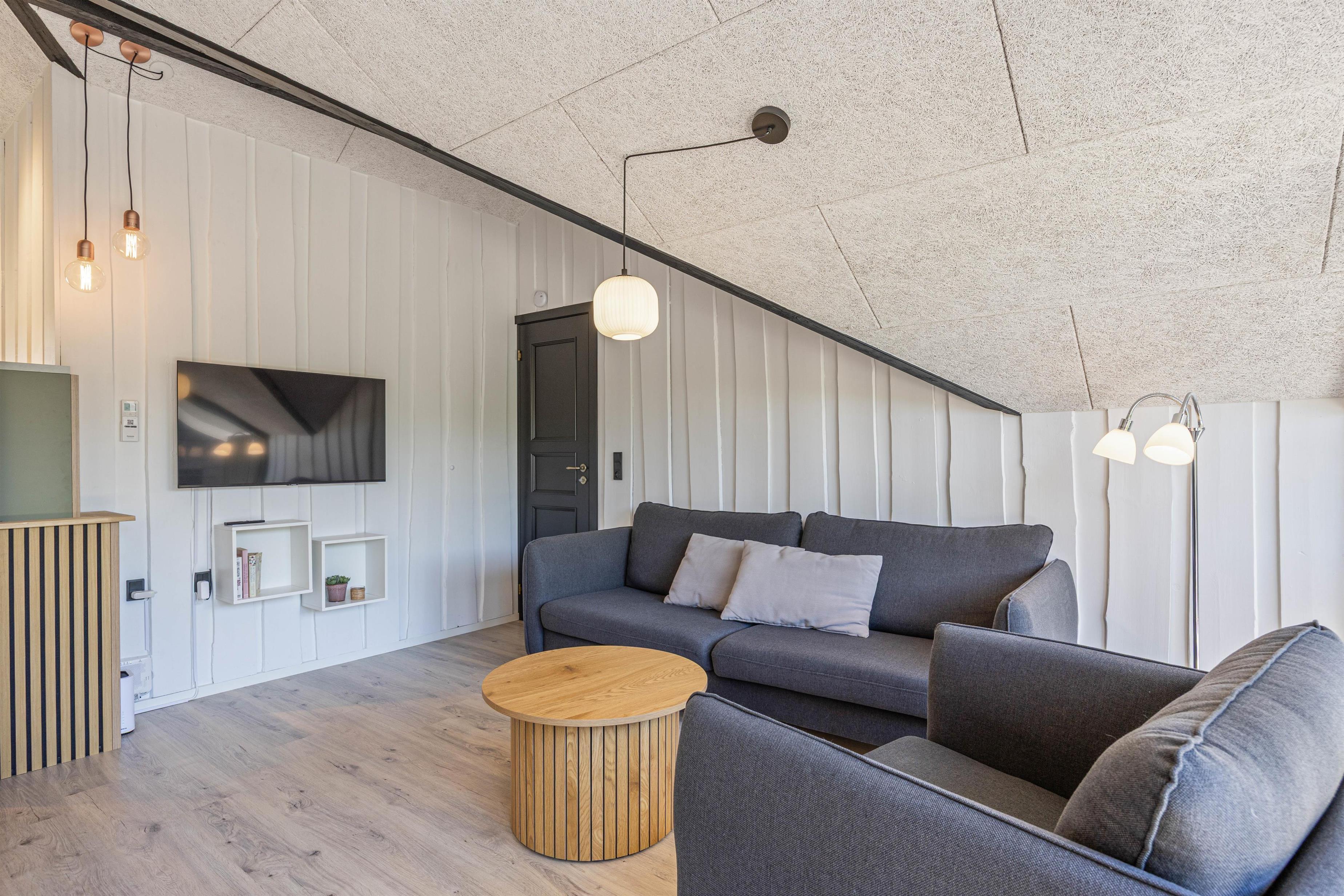 Stuen og det moderne køkken udgør sommerhusets naturlige samlingspunkt. Her er der skabt en afslappet og indbydende ramme for jeres ferie, hvor alt er tænkt med henblik på samvær og hygge. Uanset om I laver mad sammen i det åbne køkken eller slapper af i sofaen med en god bog foran den knitrende brændeovn, vil I hurtigt føle jer hjemme. Det moderne interiør og de træbeklædte vægge bidrager til en skøn atmosfære med ægte sommerhusstemning.