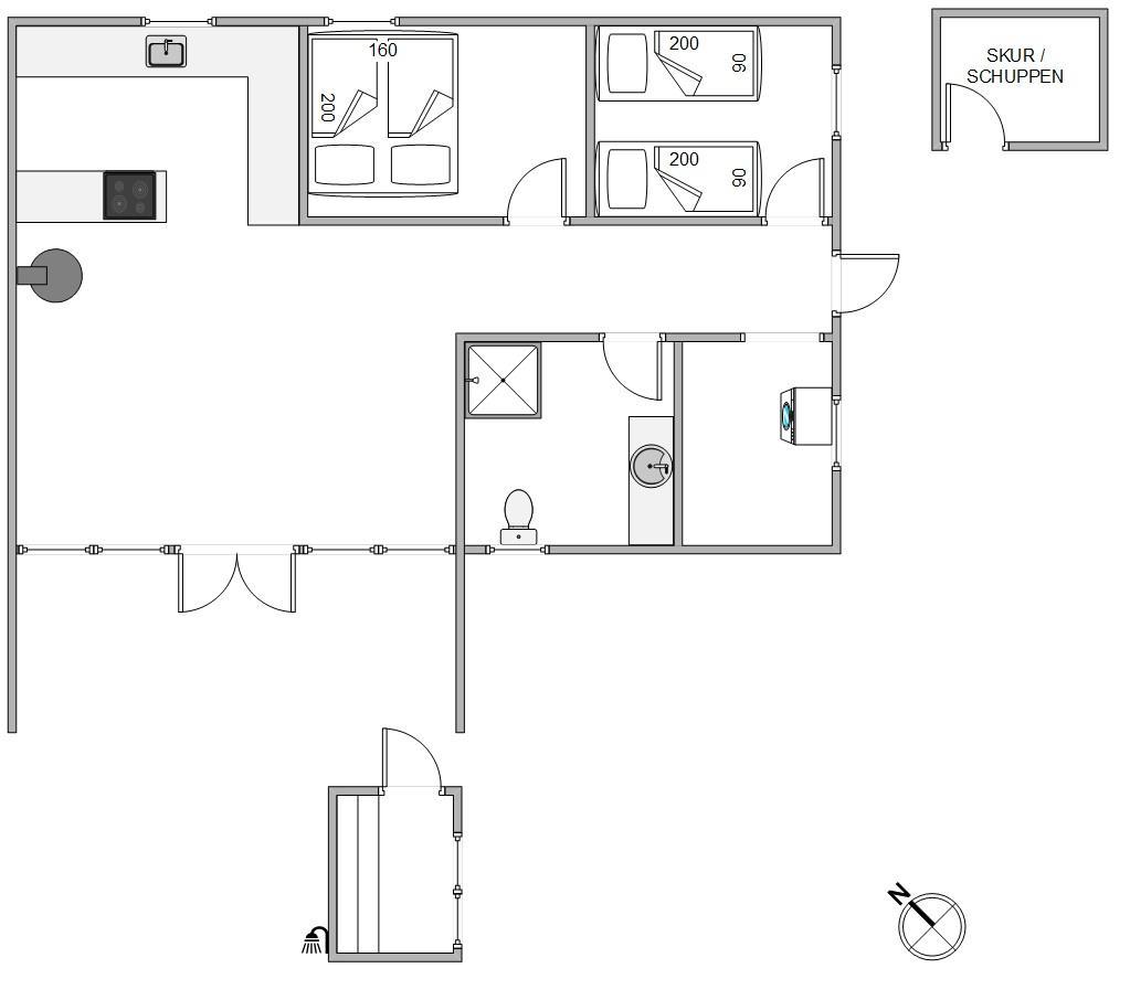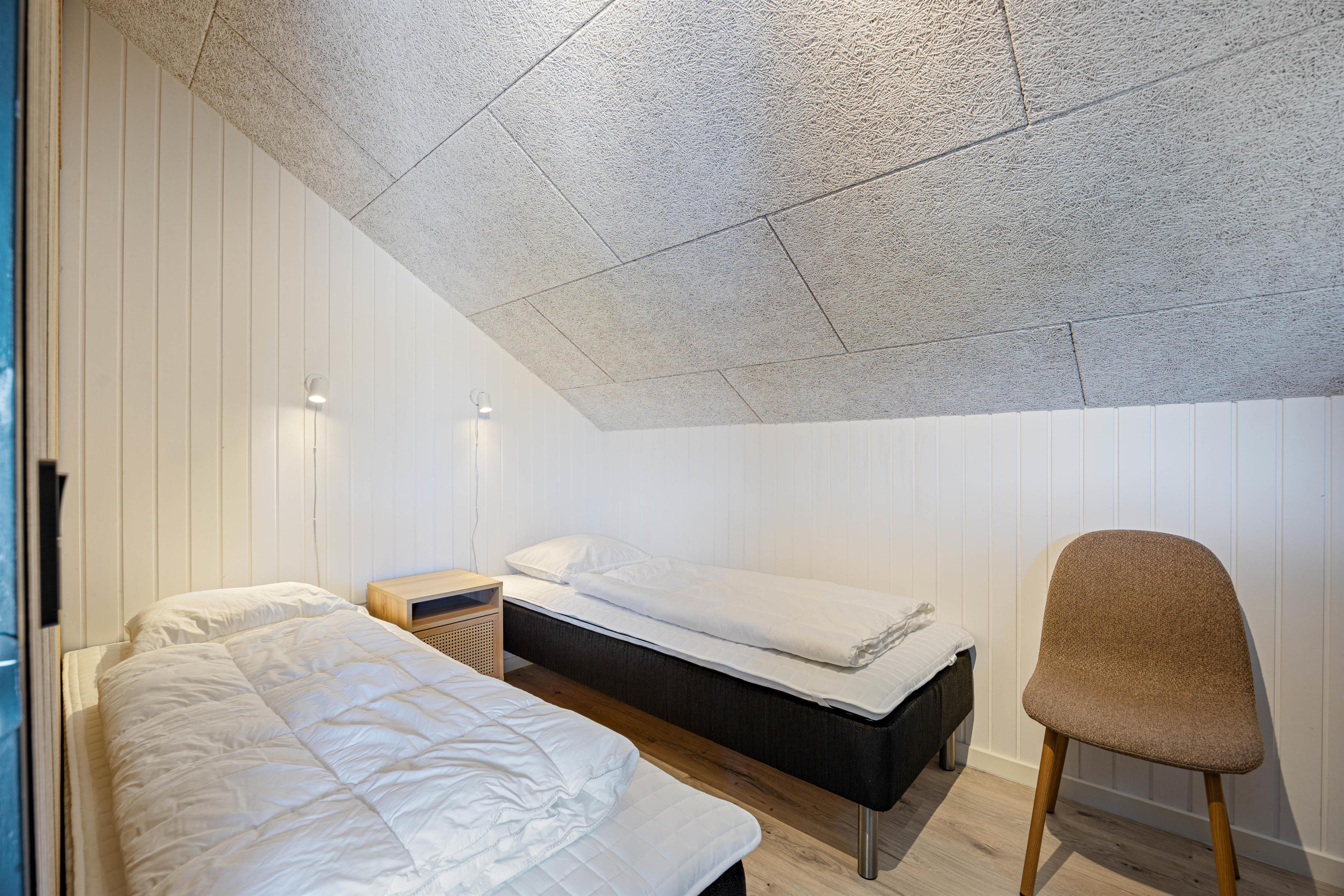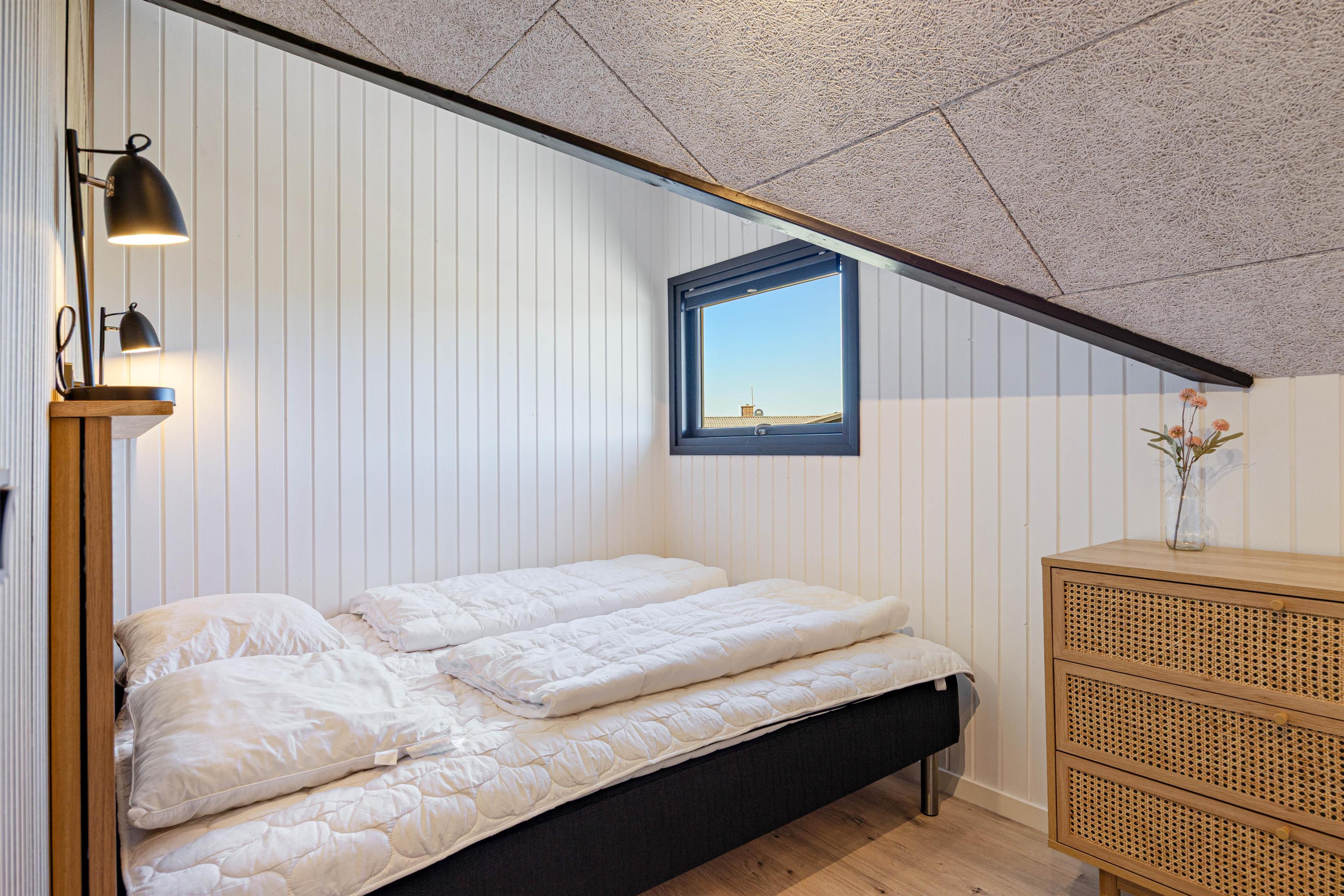 Sommerhuset rummer 2 lyse og velindrettede soveværelser – det ene med dobbeltseng og det andet med 2 enkeltsenge. Hertil kommer et lækkert badeværelse med gulvvarme og vaskemaskine, så komforten er i top under hele jeres ophold.