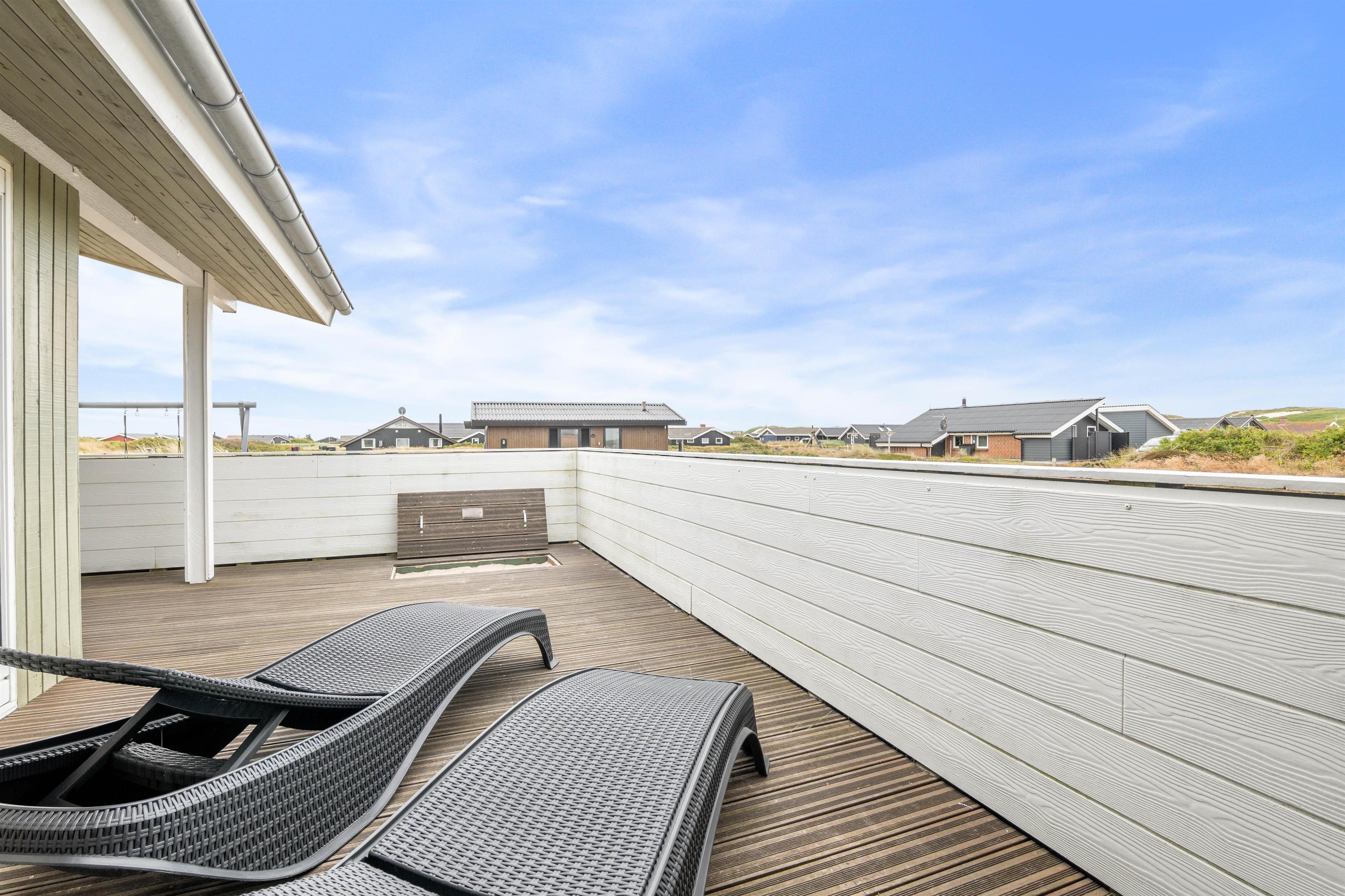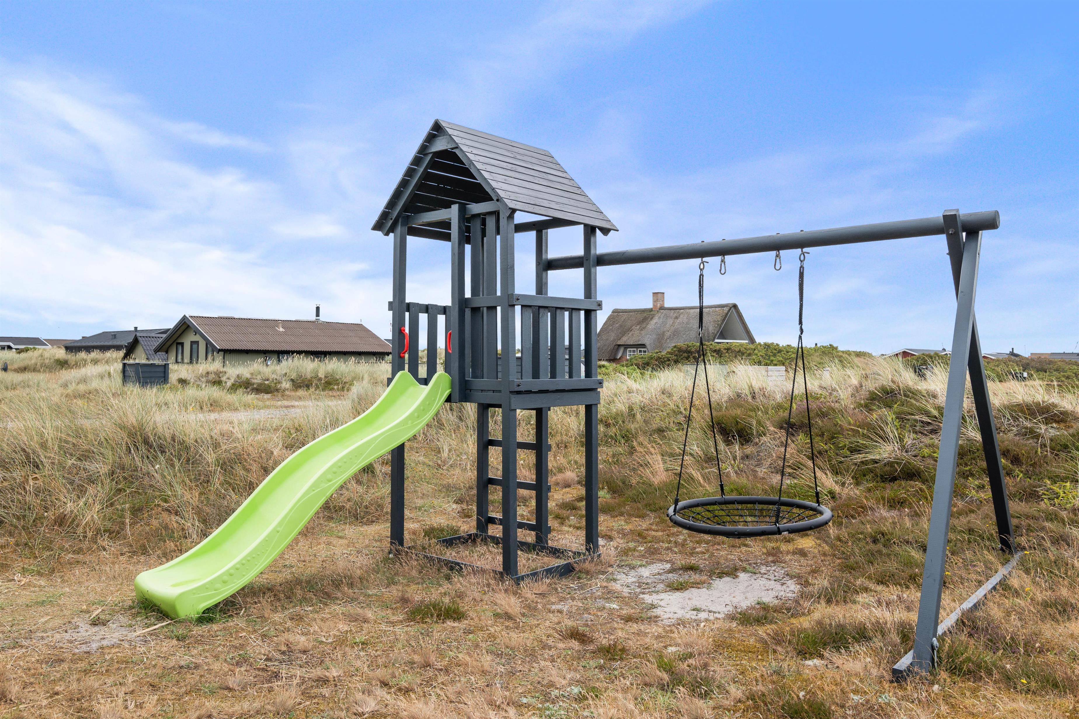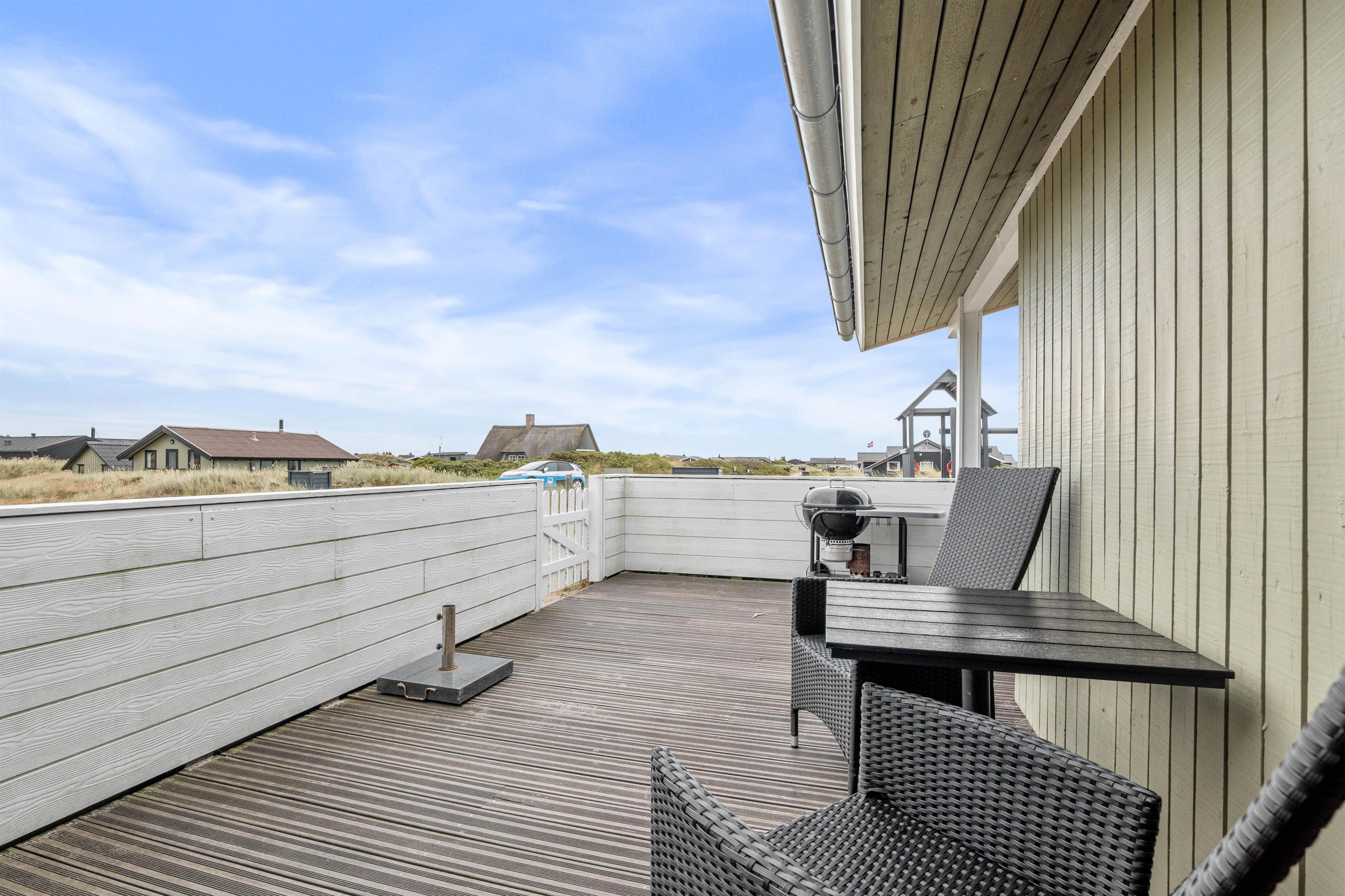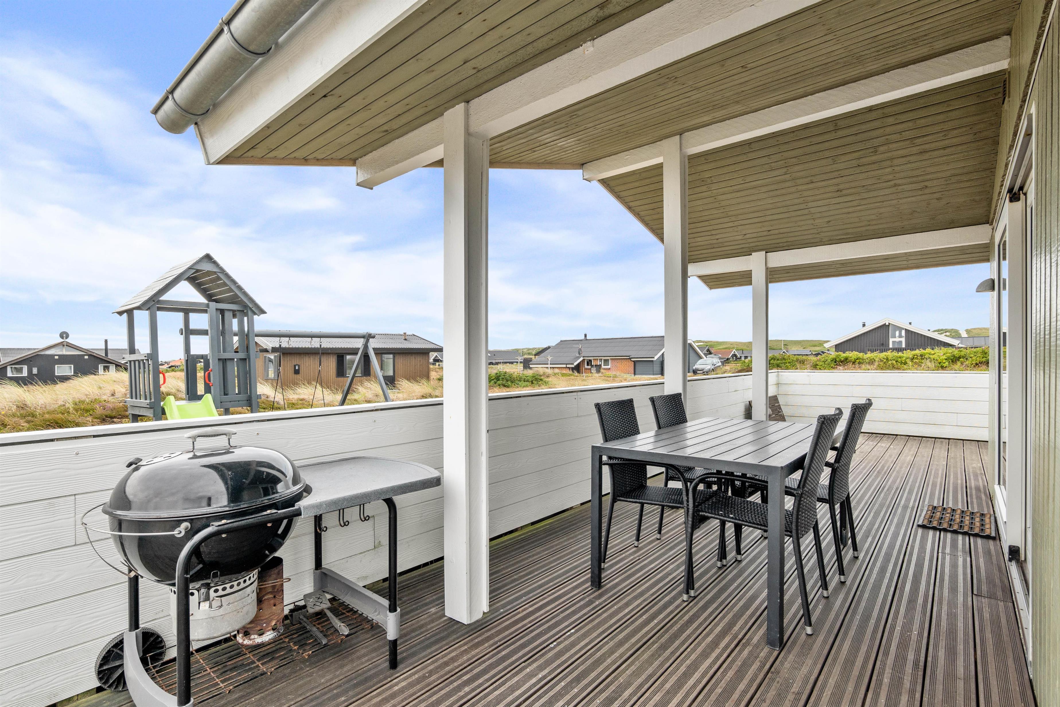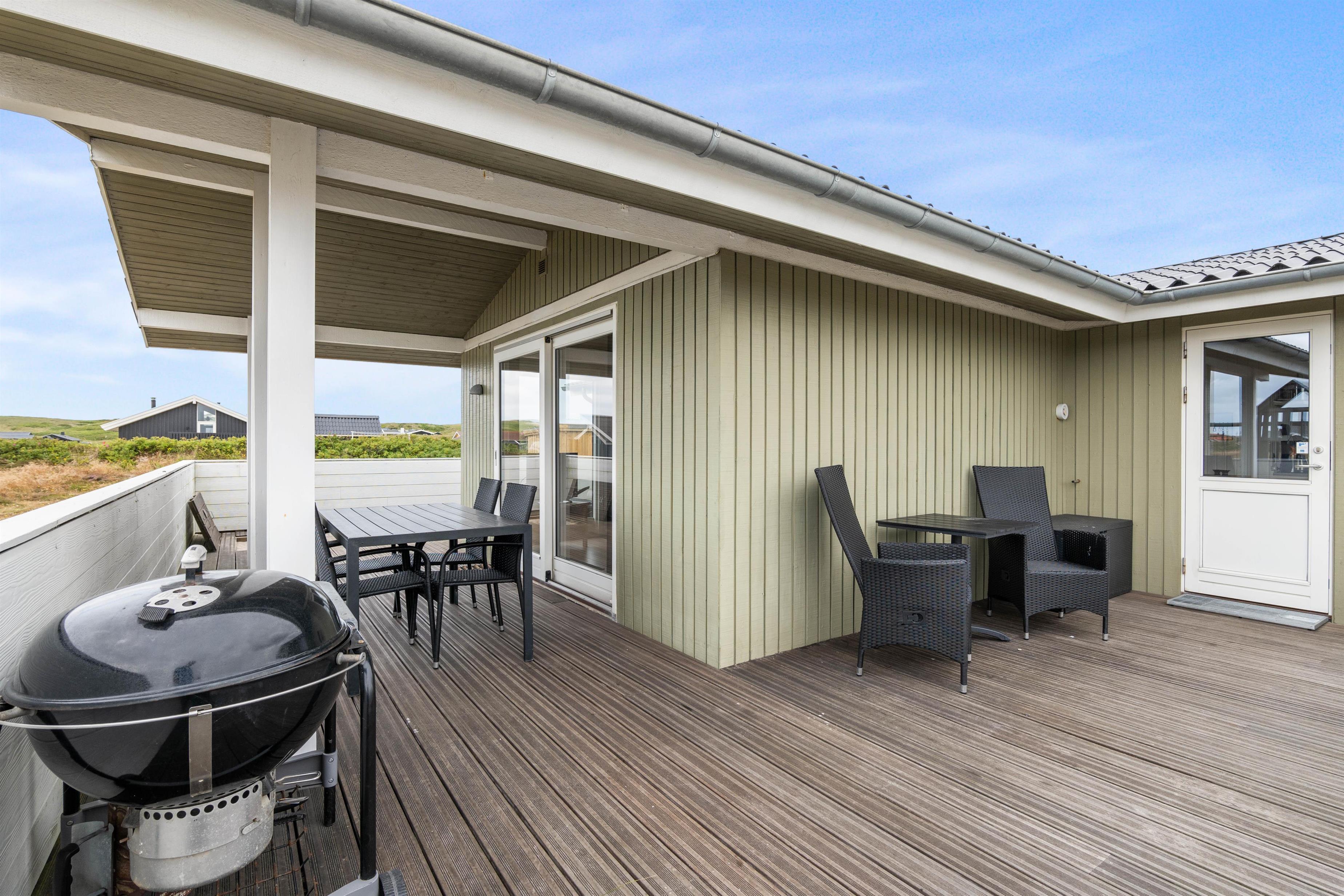 Sommerhusets store velafskærmede terrasse mod både øst, syd og vest er udstyret med gode havemøbler, liggestole og grill, hvor måltidet kan tilberedes, mens børnene leger i sandkassen. Her er også et legetårn med rutsjebane og gynge – et hit blandt de yngste i familien. Fra terrassen er der en skøn udsigt over de store hedearealer og klitterne ved Vesterhavet ligger kun få minutters gang fra feriehuset.