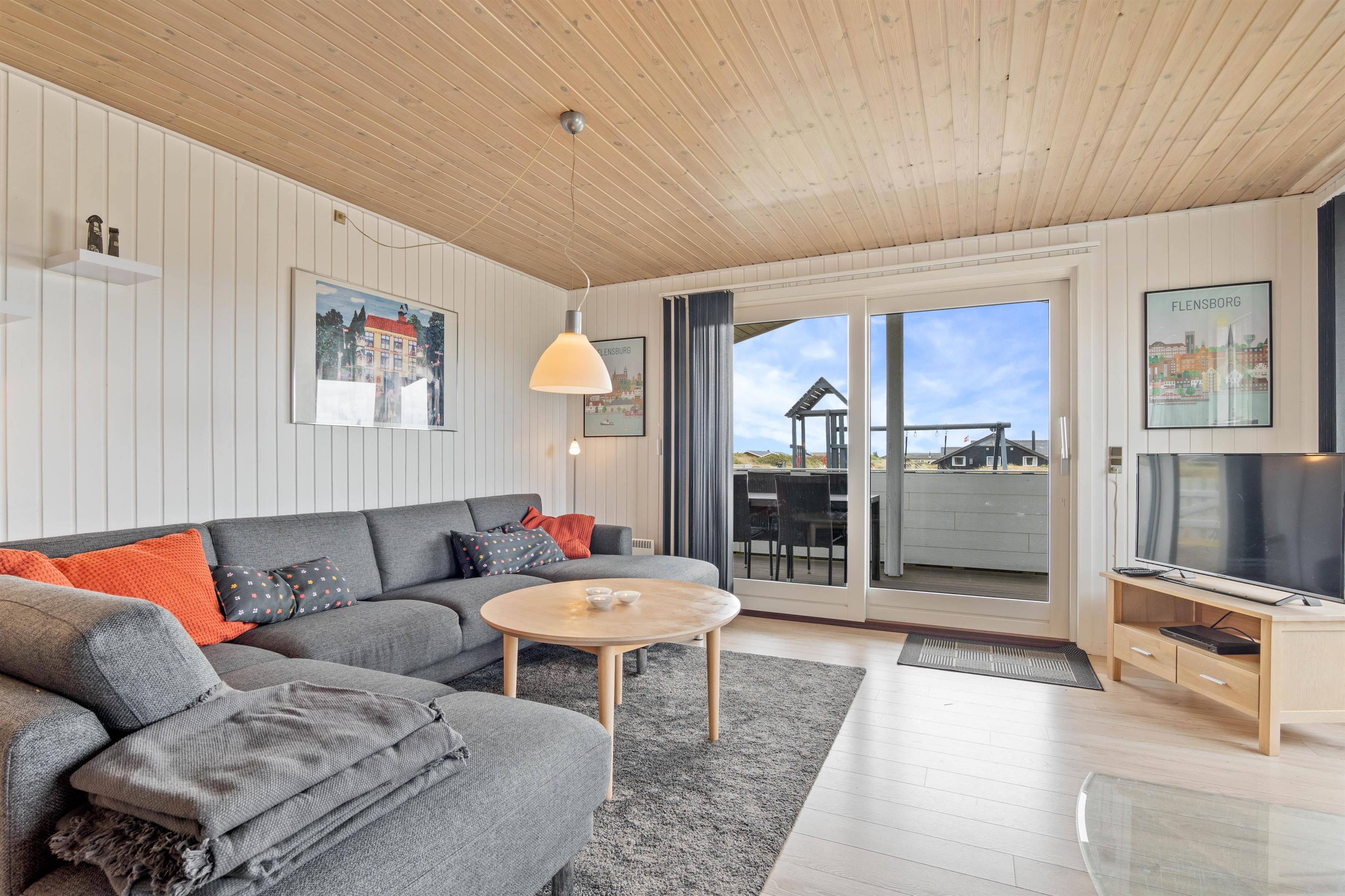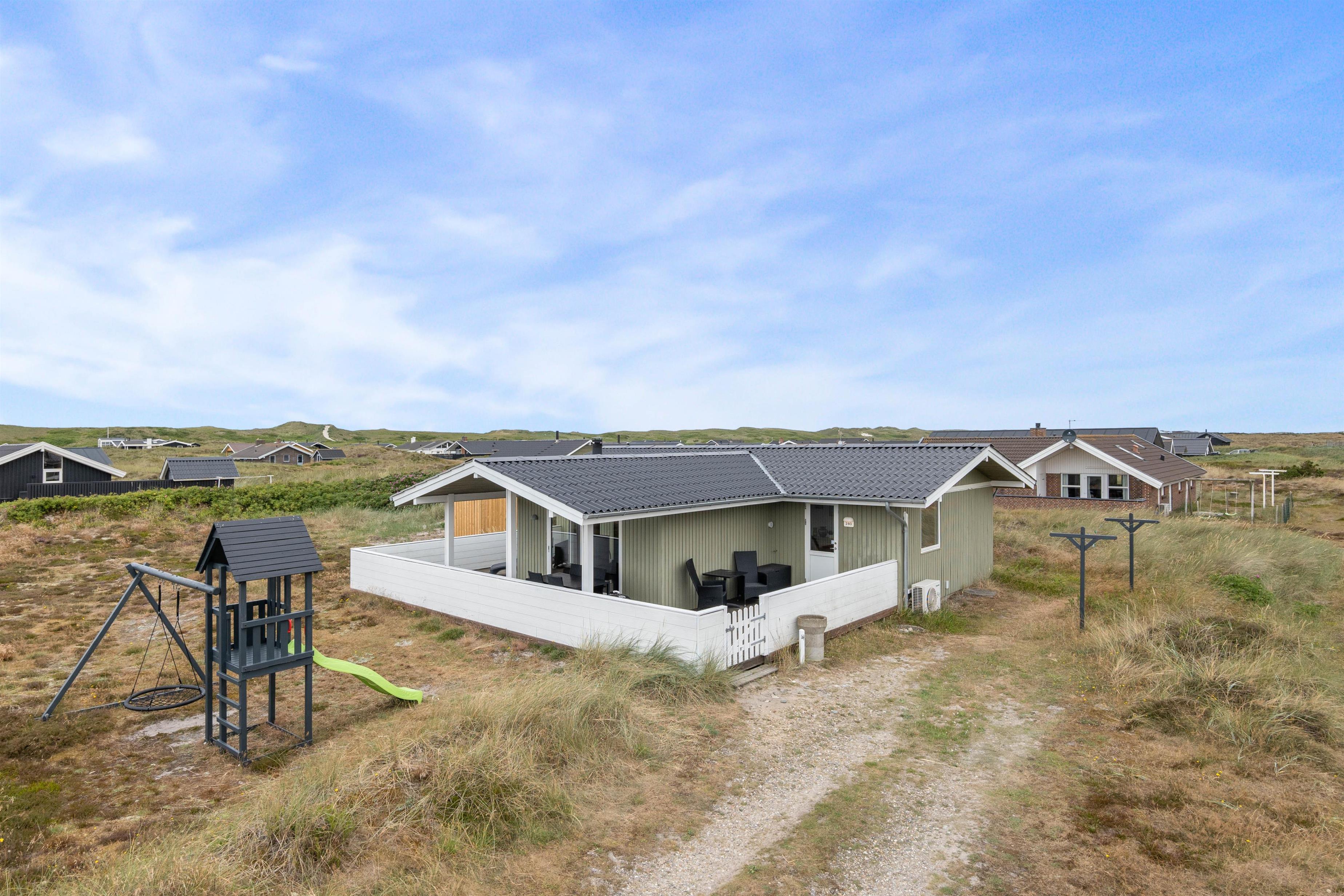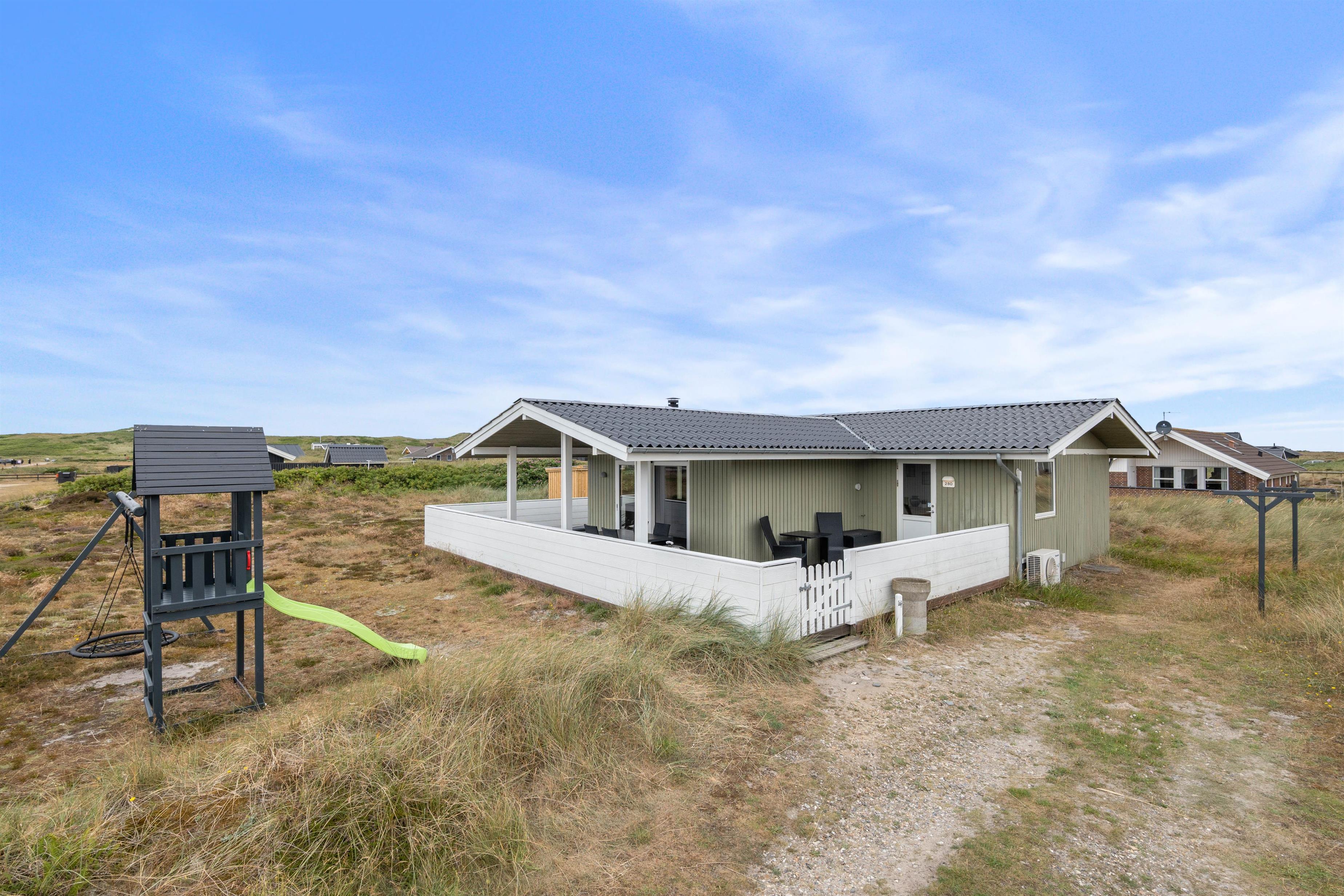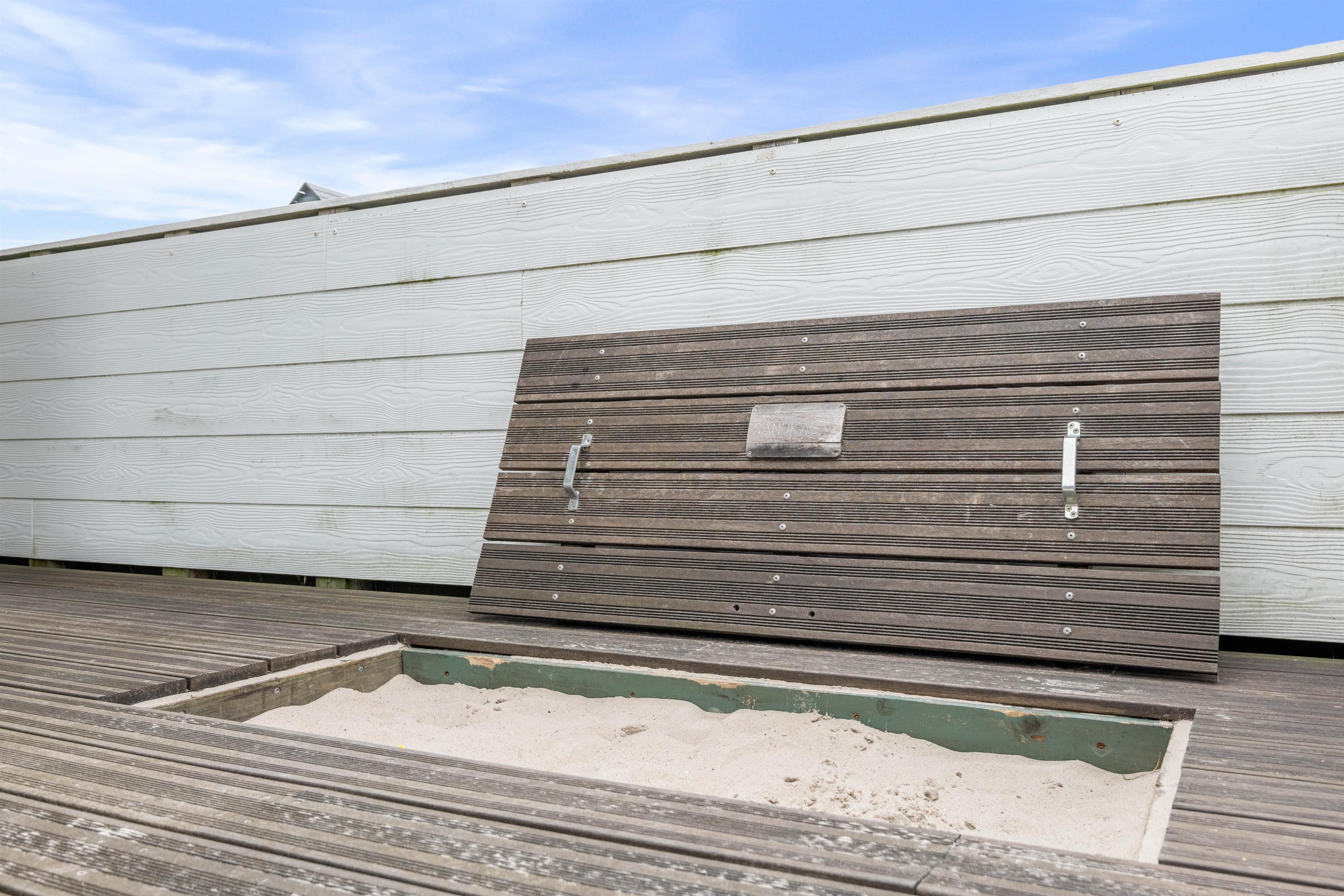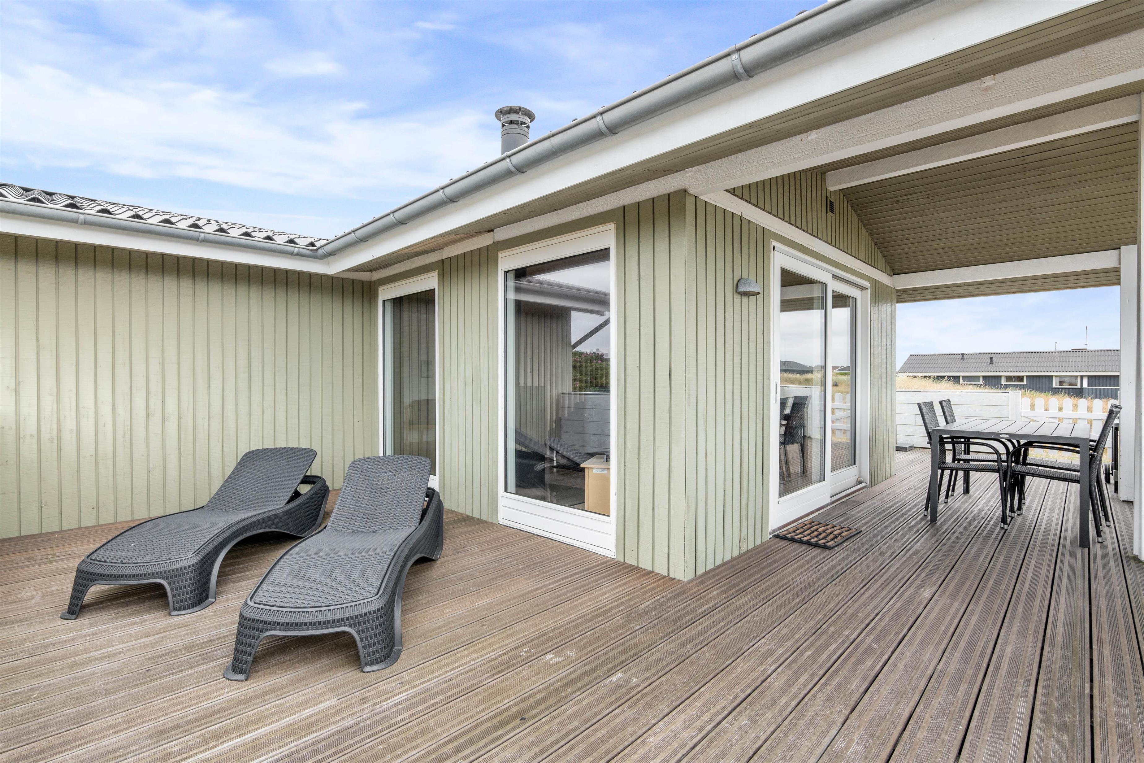 Sommerhusets store velafskærmede terrasse mod både øst, syd og vest er udstyret med gode havemøbler, liggestole og grill, hvor måltidet kan tilberedes, mens børnene leger i sandkassen. Her er også et legetårn med rutsjebane og gynge – et hit blandt de yngste i familien. Fra terrassen er der en skøn udsigt over de store hedearealer og klitterne ved Vesterhavet ligger kun få minutters gang fra feriehuset.
