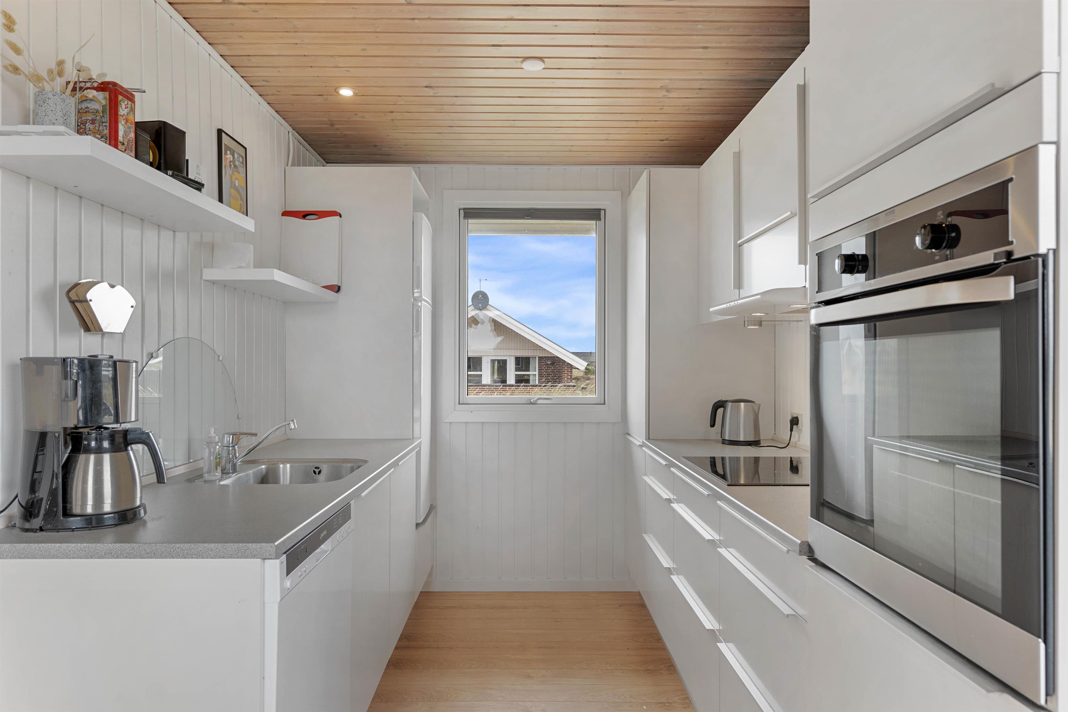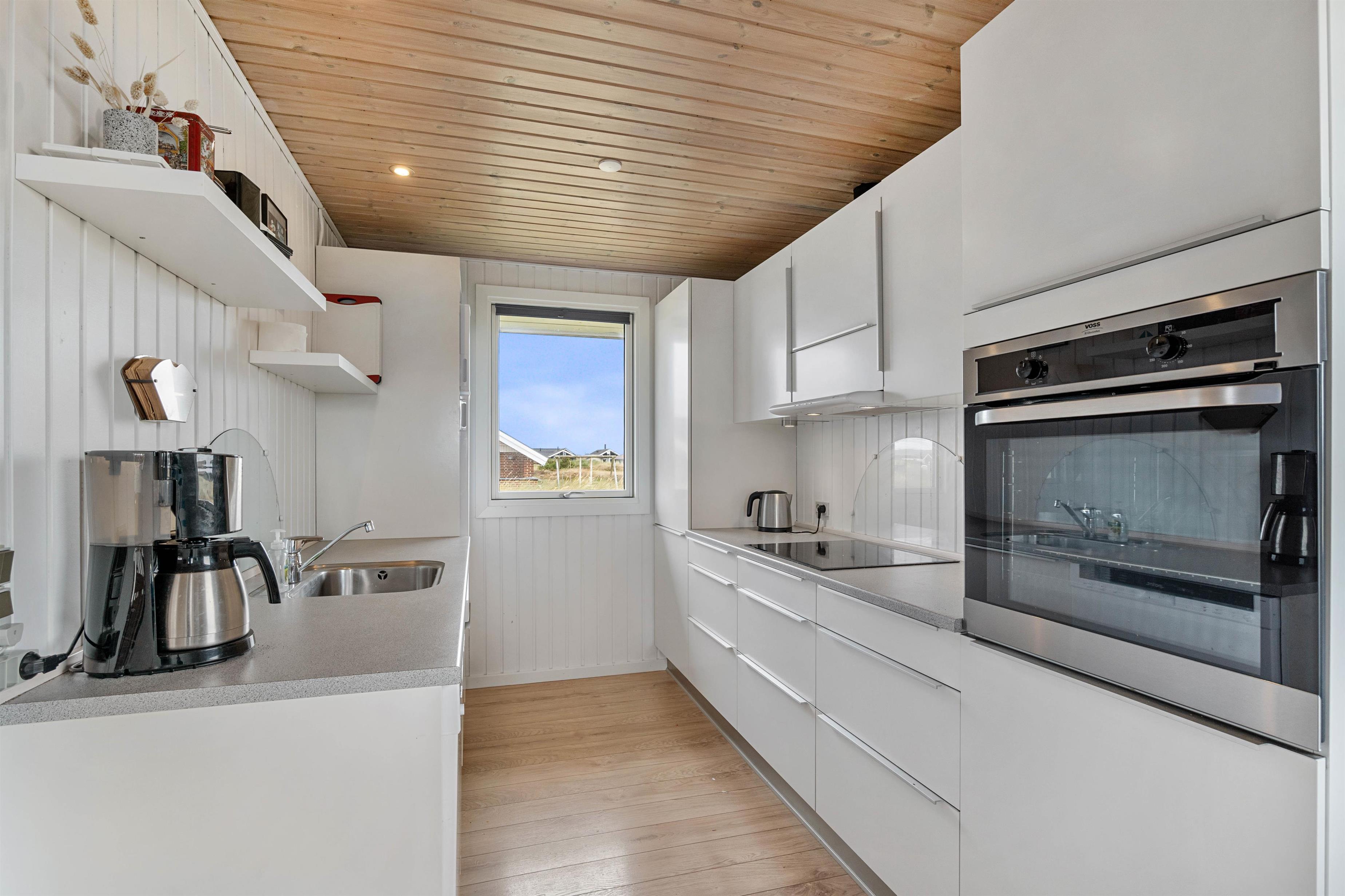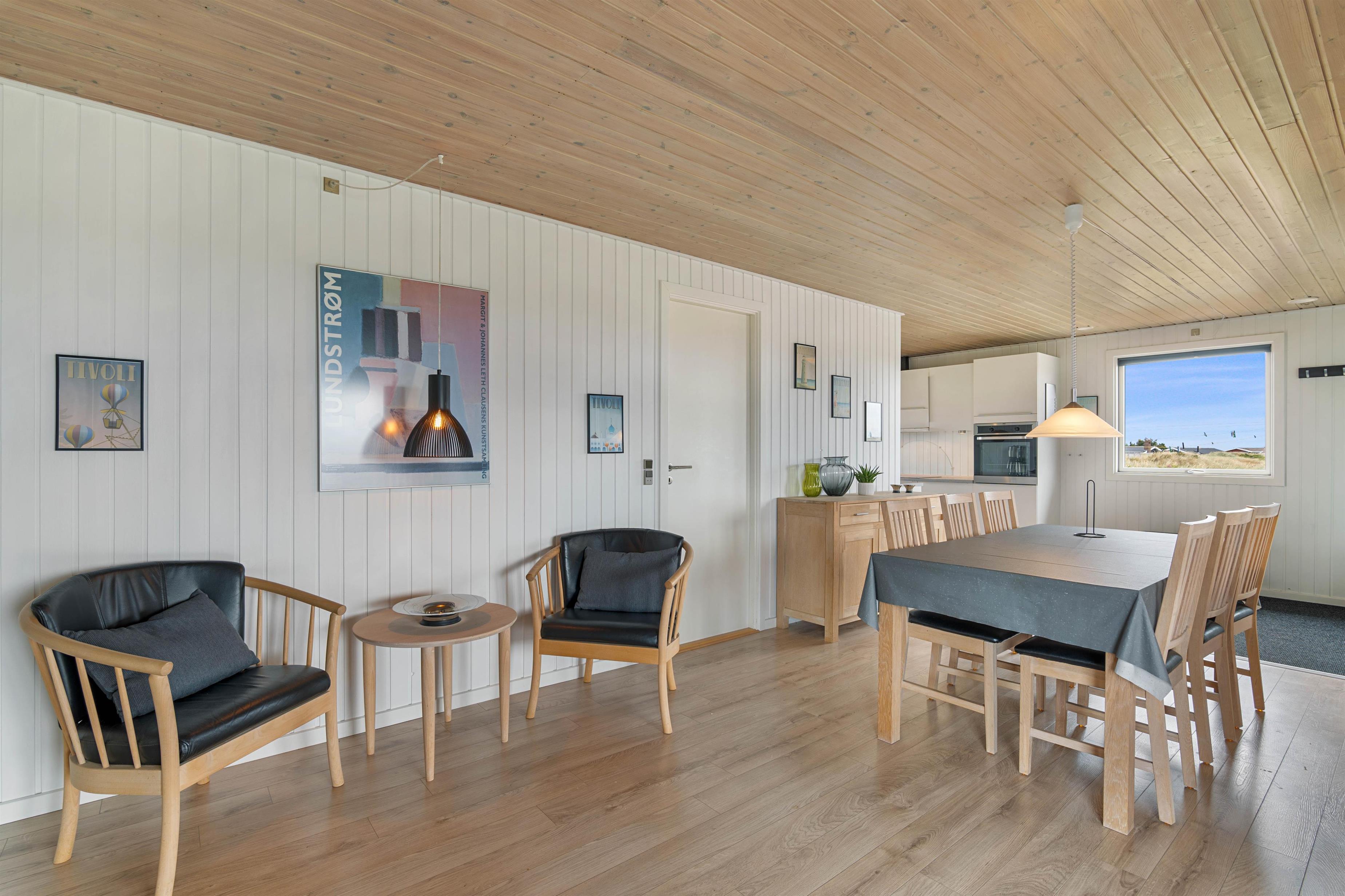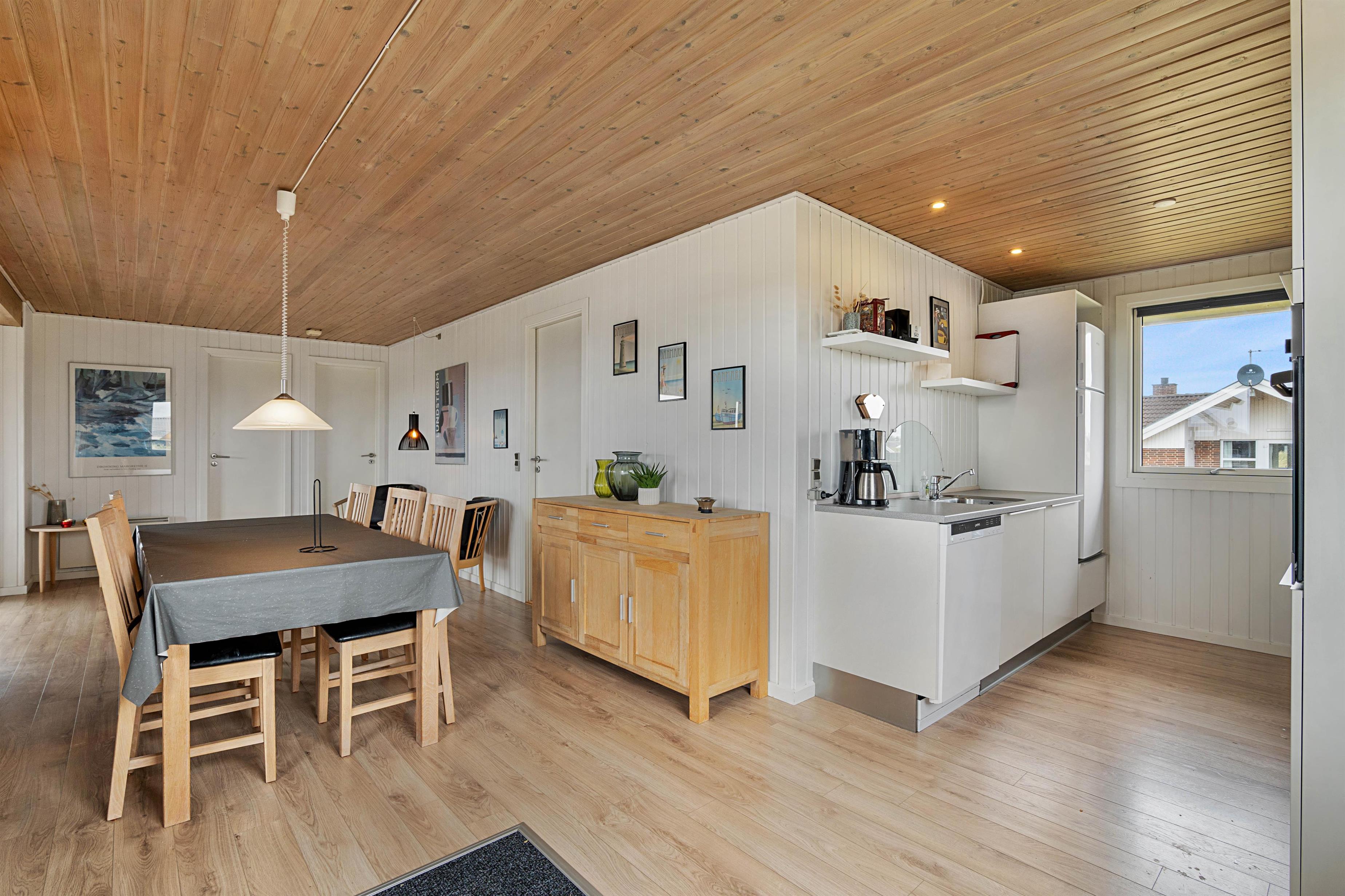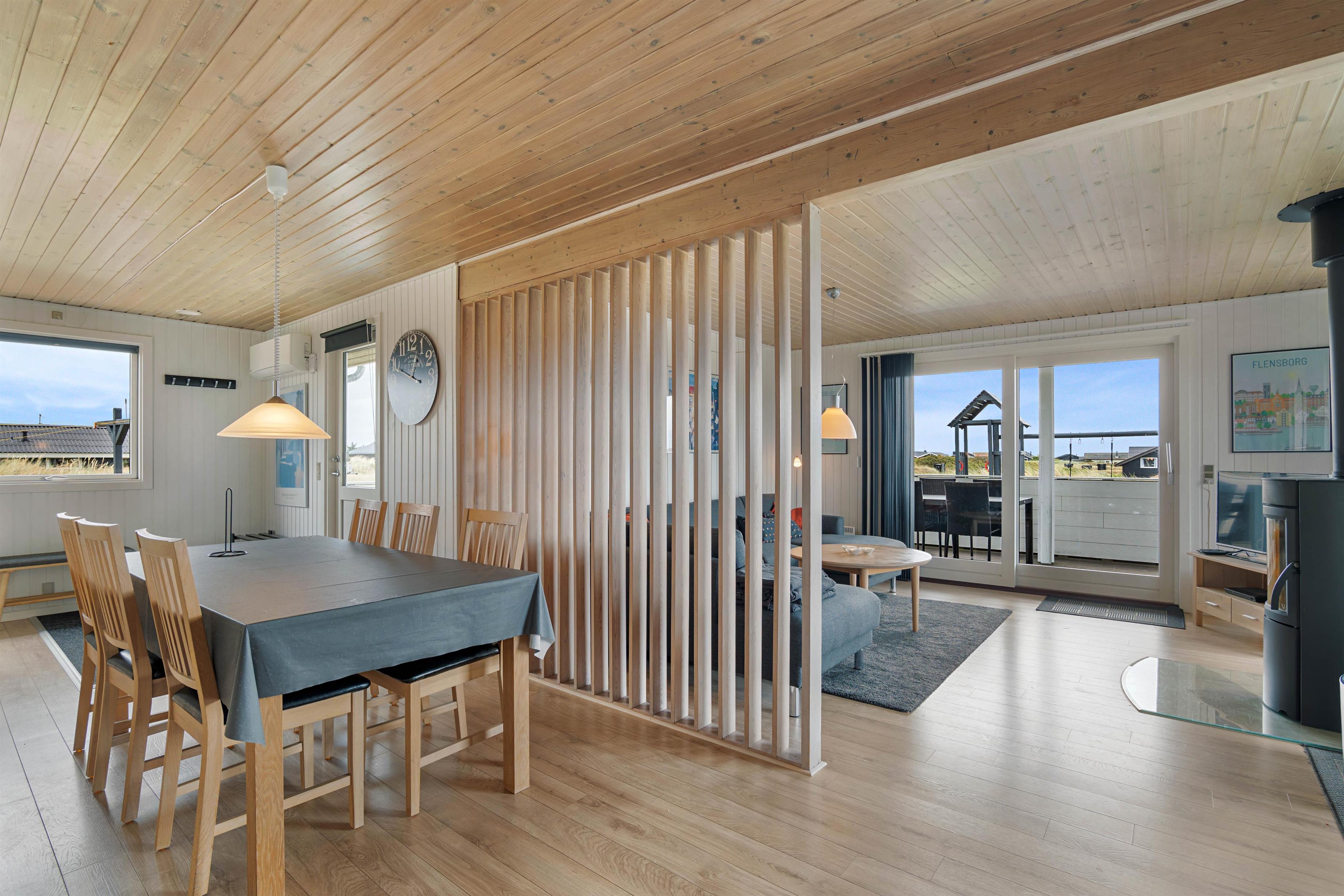 Dette hyggelige feriehus på den store naturgrund er særdeles velindrettet med lyse rum og møbleret med sans for kvalitet. Den store lyse stue i forbindelse med det veludstyrede køkken fra 2014 har brændeovnen som det naturlige midtpunkt for familiens hyggestunder.