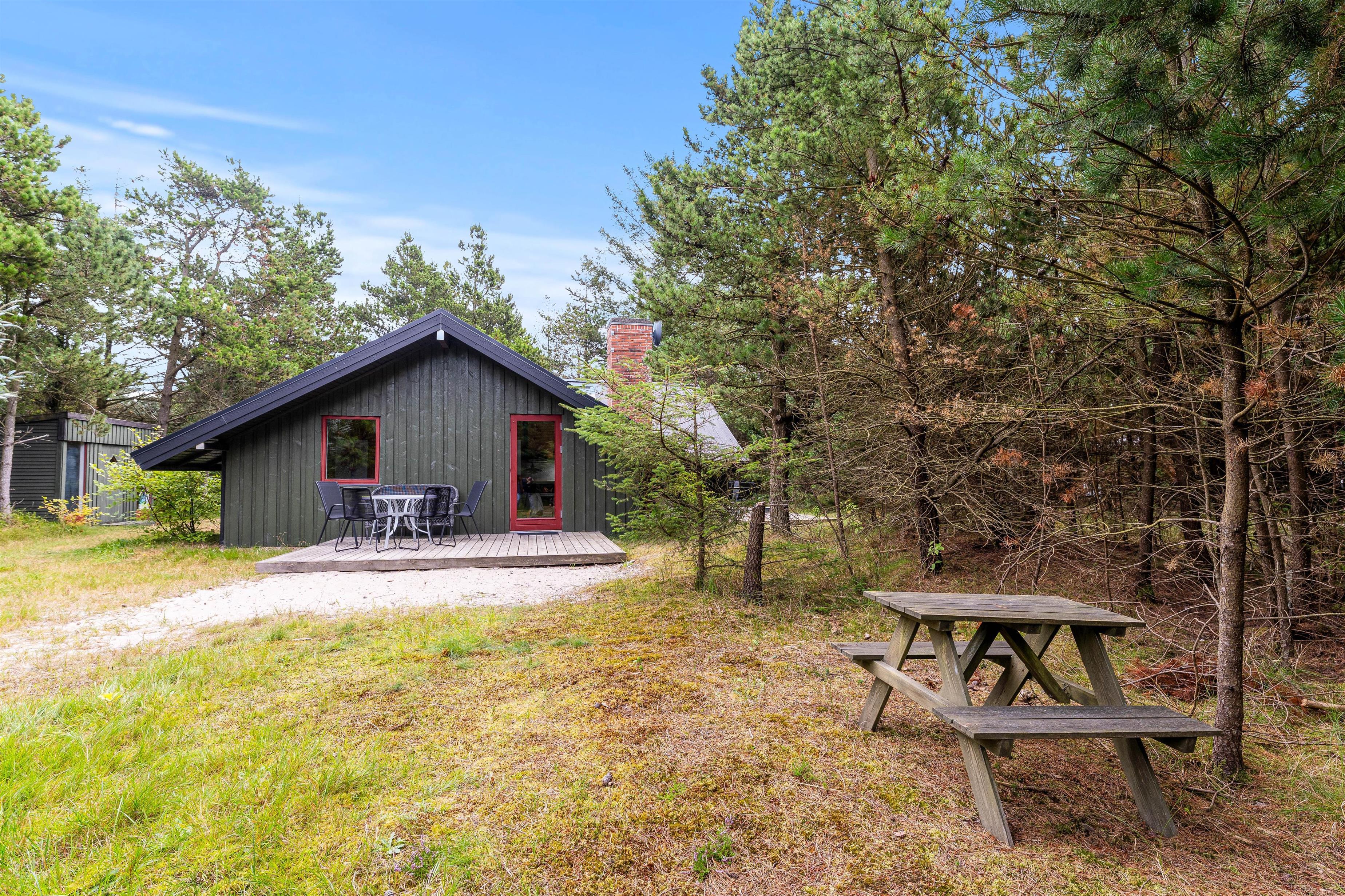 Sommerhuset ligger på en mere end 2.000 kvadratmeter stor grund spækket med smuk natur. Høje grantræer sørger for læ for vestenvinden og ugenerede dage i solen, og på den store græsplæne kan børnene og hunden få fri leg og gå på opdagelse blandt skovens træer. Der er også et fodboldmål.