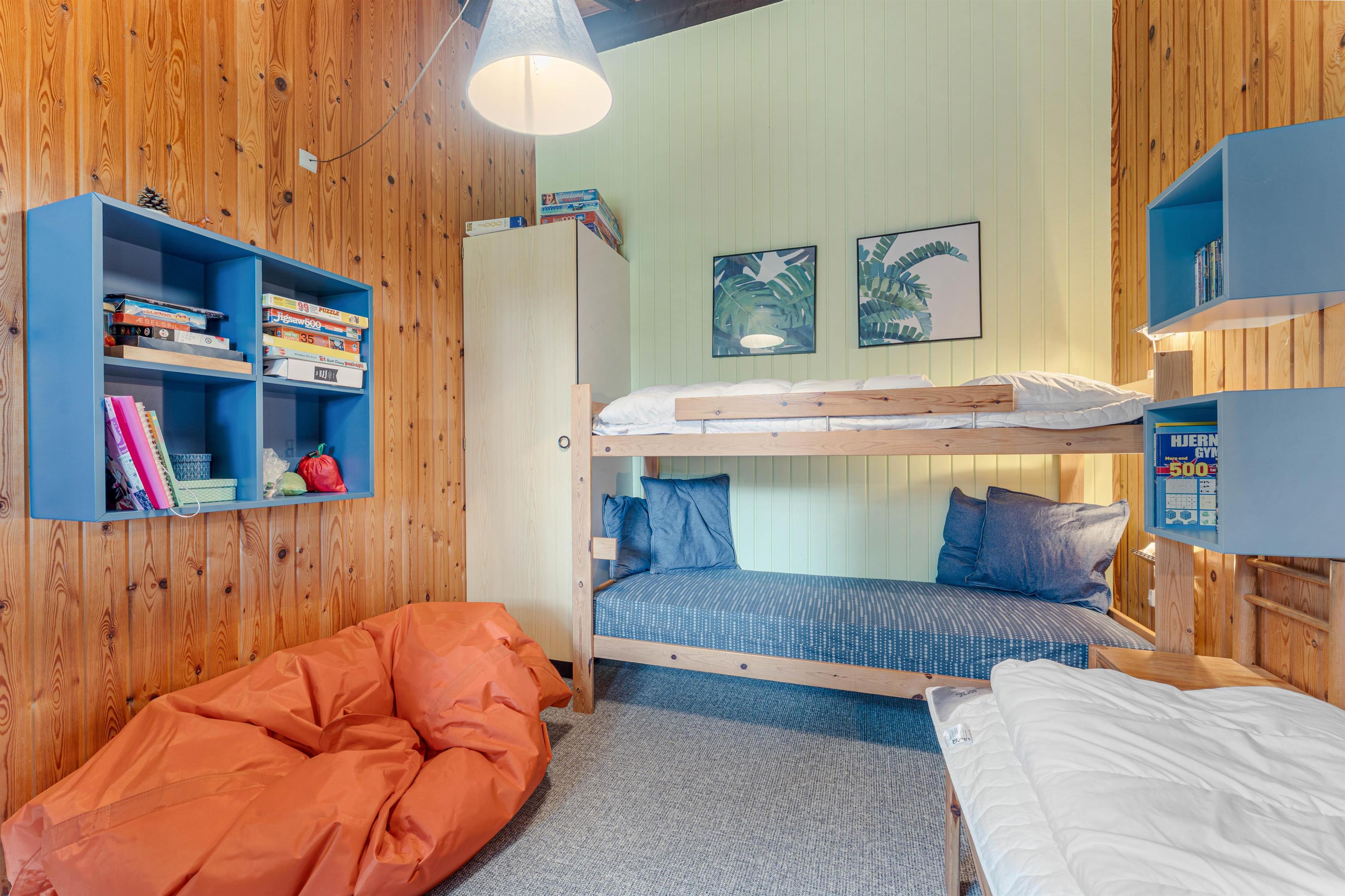 Sommerhuset har 3 værelser, hvor I kan fordele jer til natten. I det ene værelse står der 2 enkeltsenge ovenpå hinanden. Her kan den øverste seng tages ned, så der står 2 senge ved siden af hinanden.