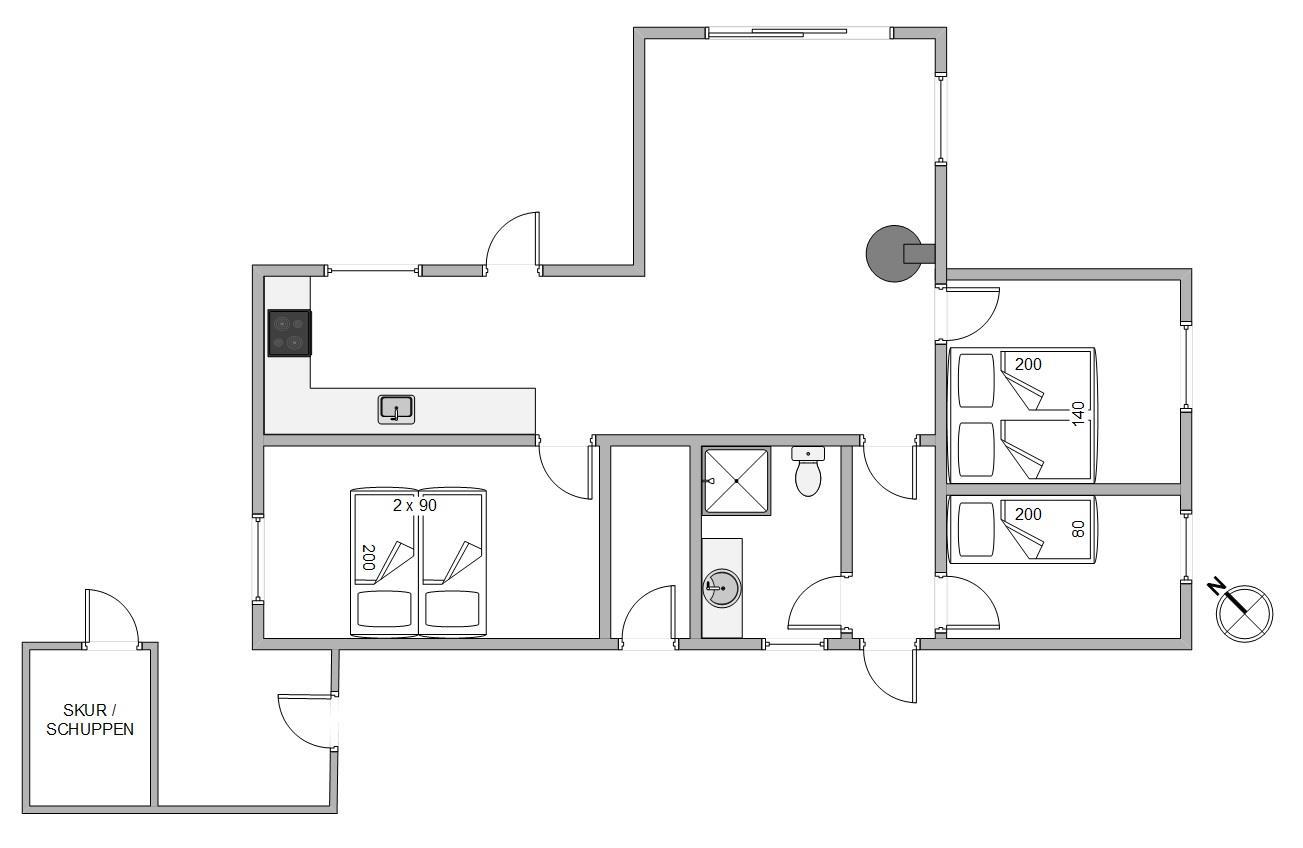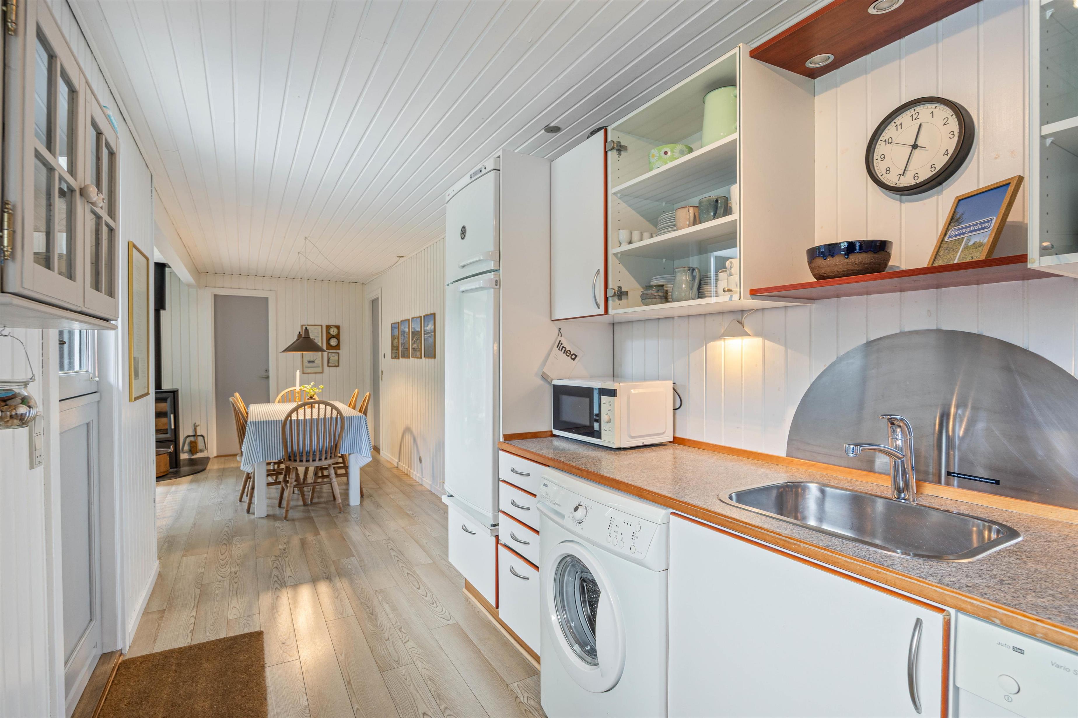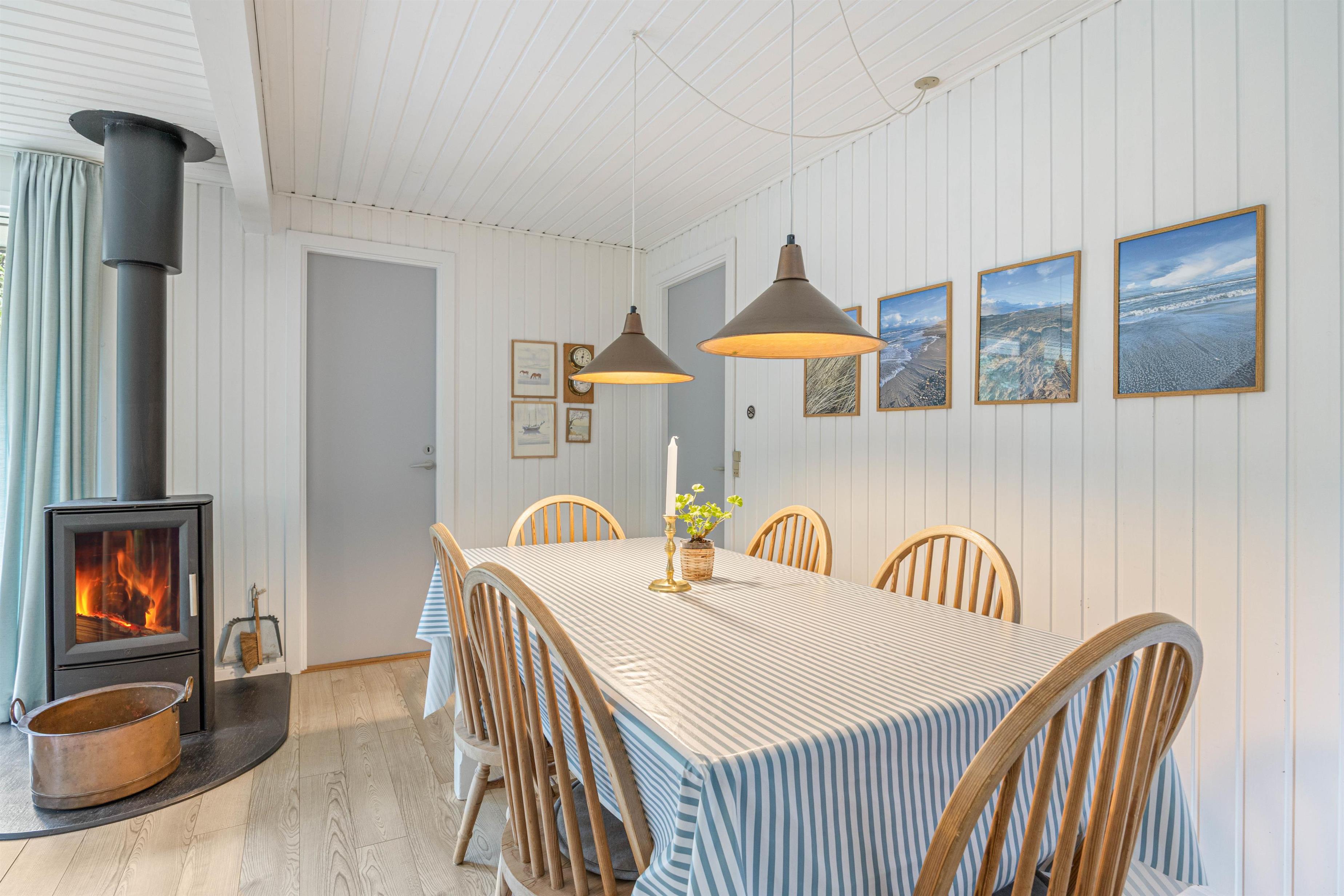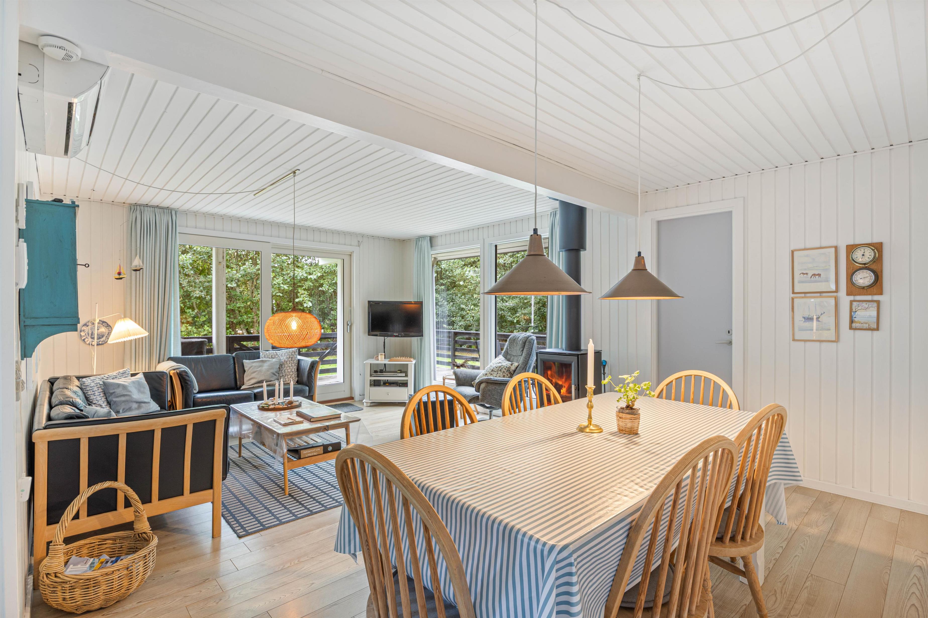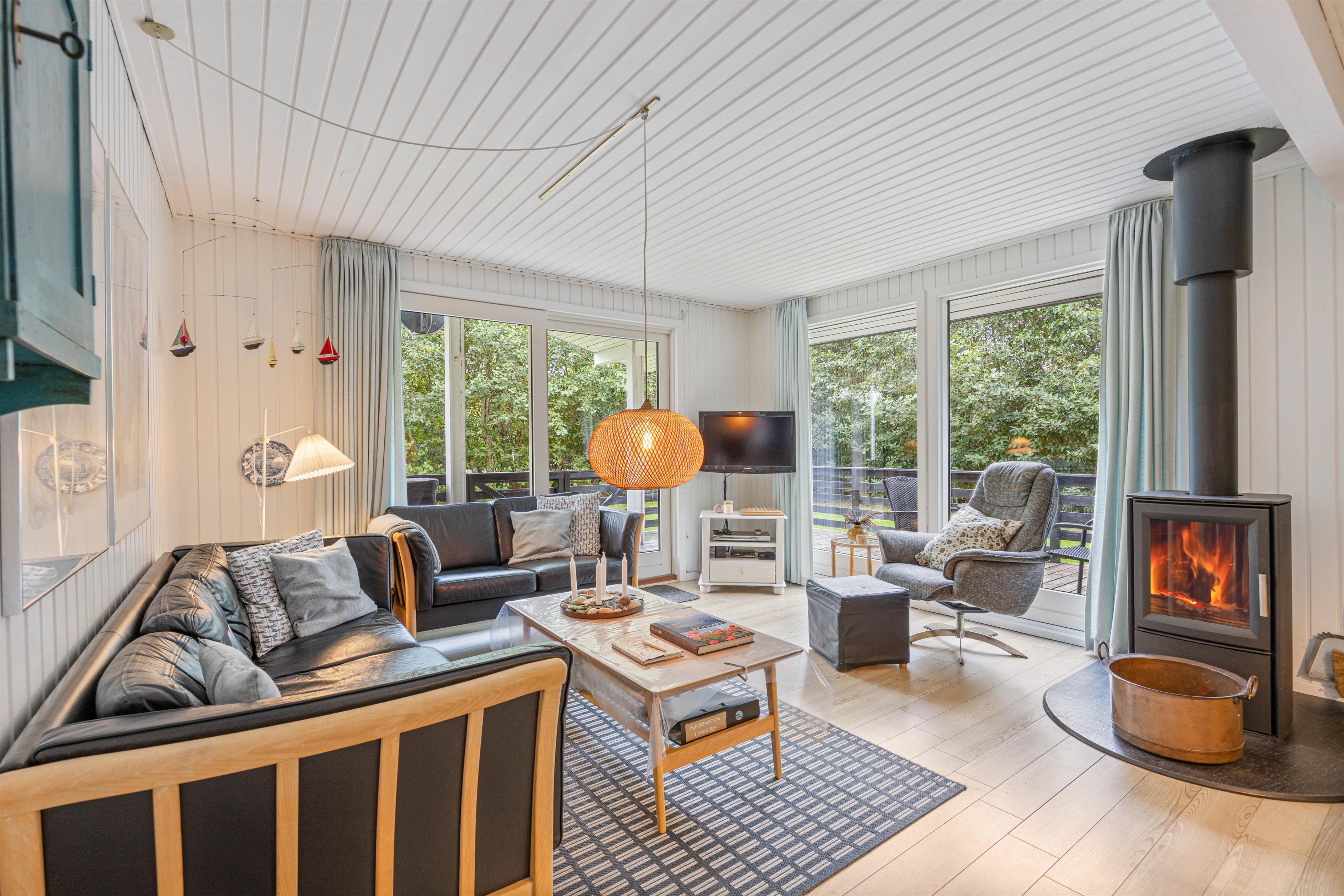 Køkkenet er veludstyret, så I sagtens kan tilberede lækre måltider under ferien, badeværelset er pænt og indbydende med god skabsplads, og stuen med brændeovnen er dejlig rummelig og et godt samlingspunkt, hvor I kan dele dagens ferieoplevelser med hinanden.