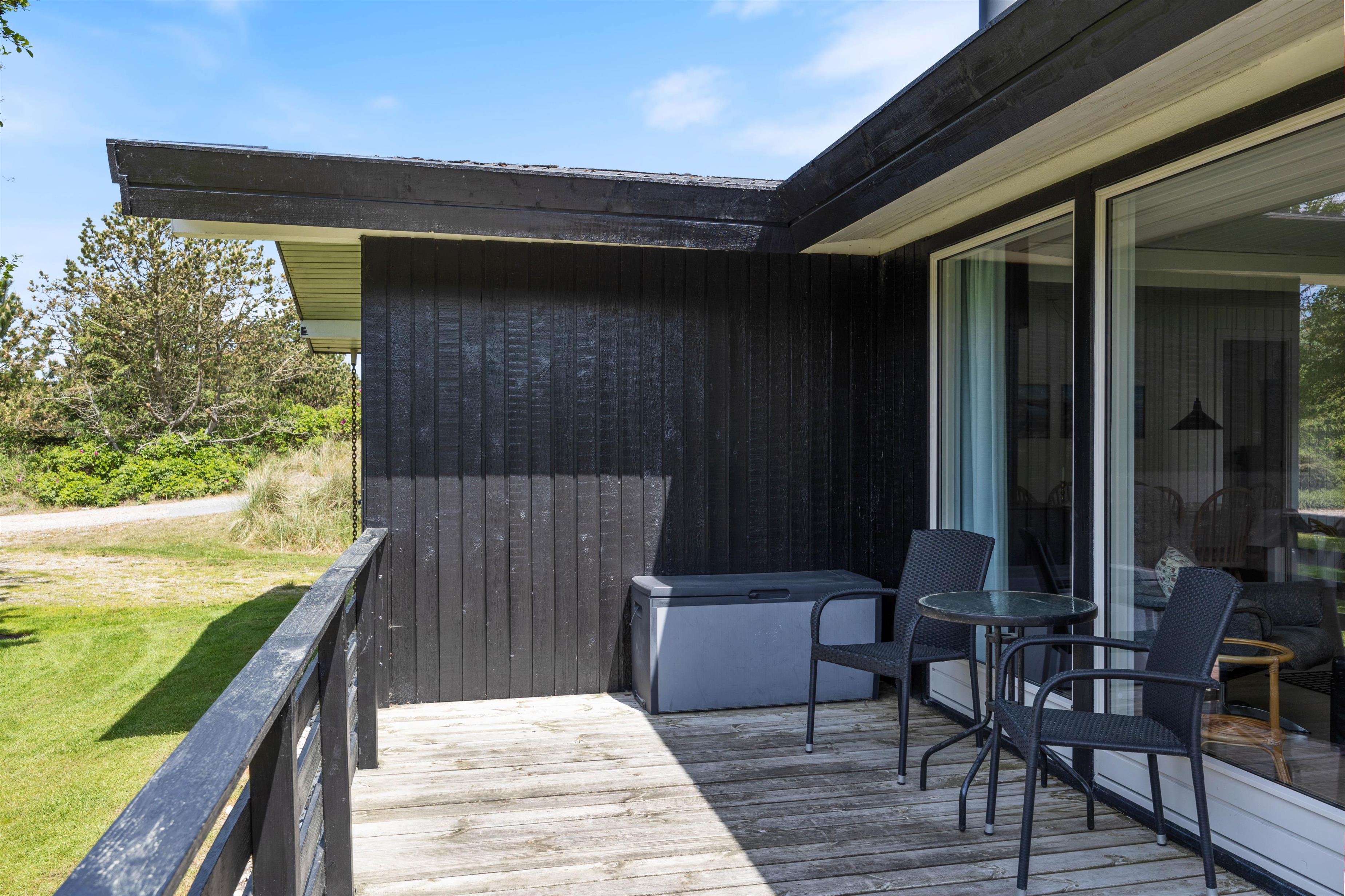 Feriehuset har en lukket, rigtig dejlig og flot terrasse, der ligger både øst, syd og vest for feriehuset. Herfra kan I nyde solen fra morgen til aften. Og I kan let finde læ, hvis sommerbrisen bliver for kølig, eller søge ly under halvtaget, hvis der skulle komme lidt sommerregn. Og der er selvfølgelig havemøbler og en grill på terrassen, så I kan sidde ude og nyde måltiderne i det fri.