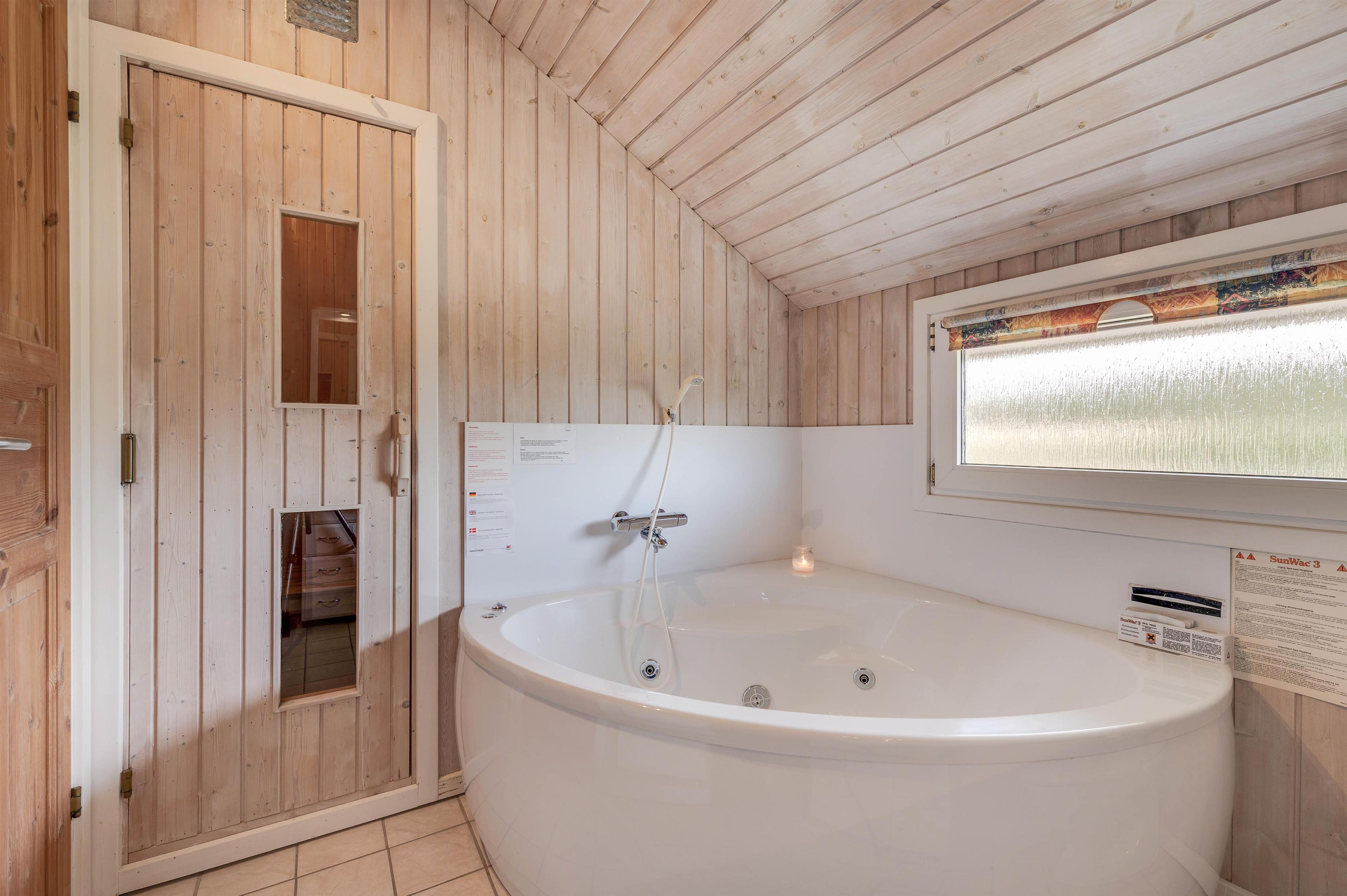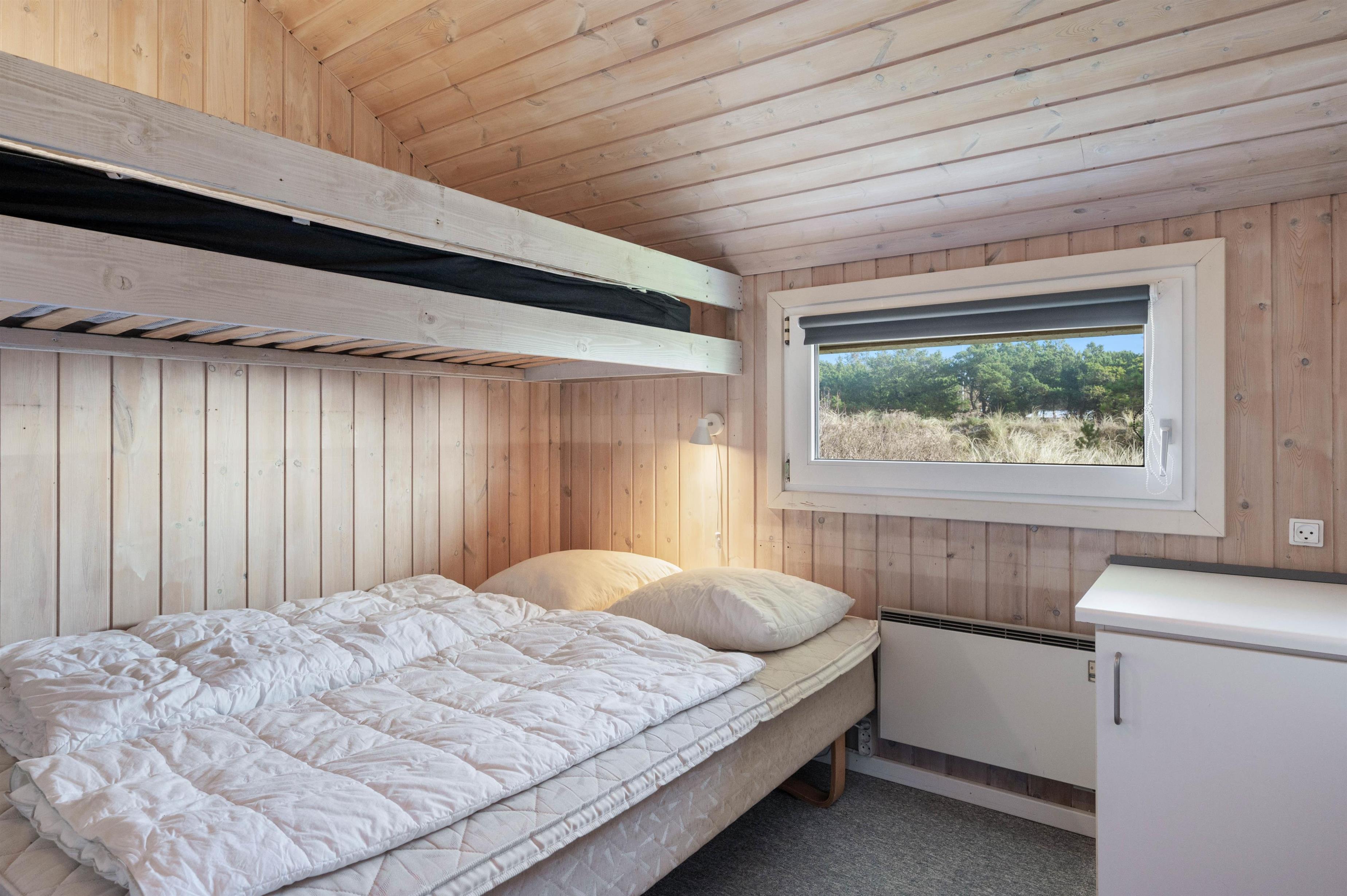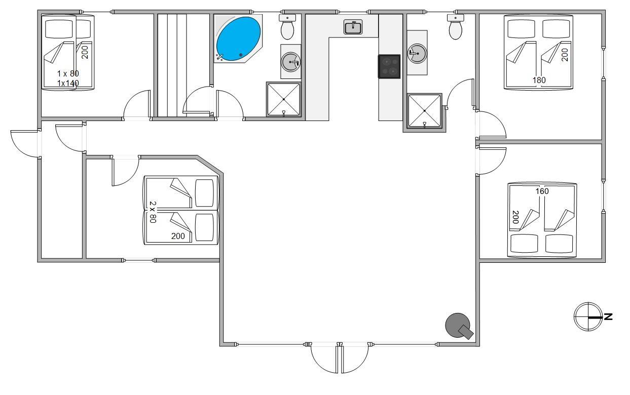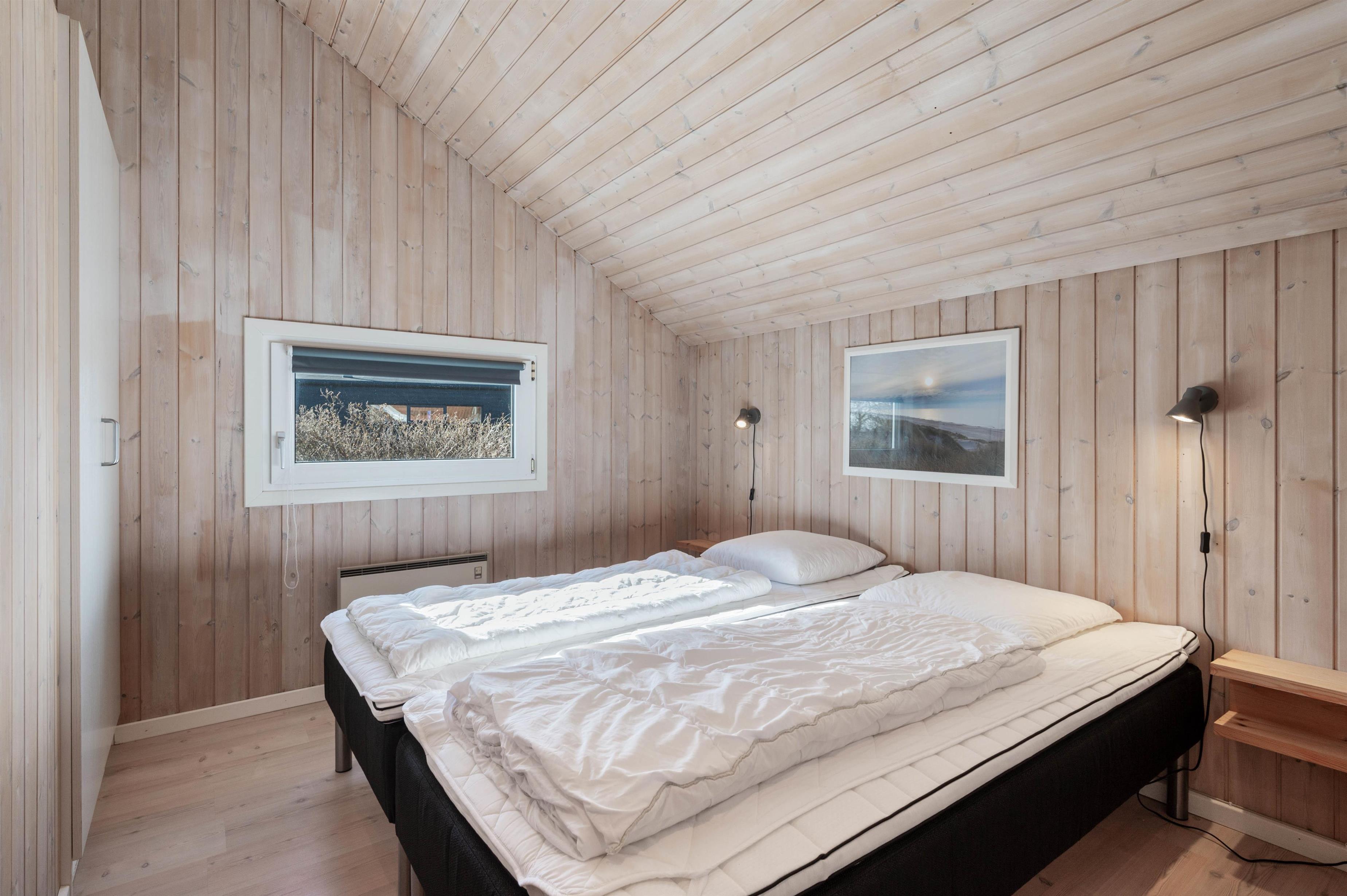 Sommerhusets 8 feriegæster kan fordele sig på de 4 soveværelser, som er indrettet med komfortable senge. Der er 2 dobbeltsenge, 2 enkeltsenge og et værelse med køjeseng – et hit blandt børnene. Feriehuset har desuden 2 badeværelser – begge med gulvvarme -, så der ikke opstår kø om morgenen. På det ene badeværelse er der sauna og spabad, som er rigtig afslappende efter en lang gåtur ved vandet.