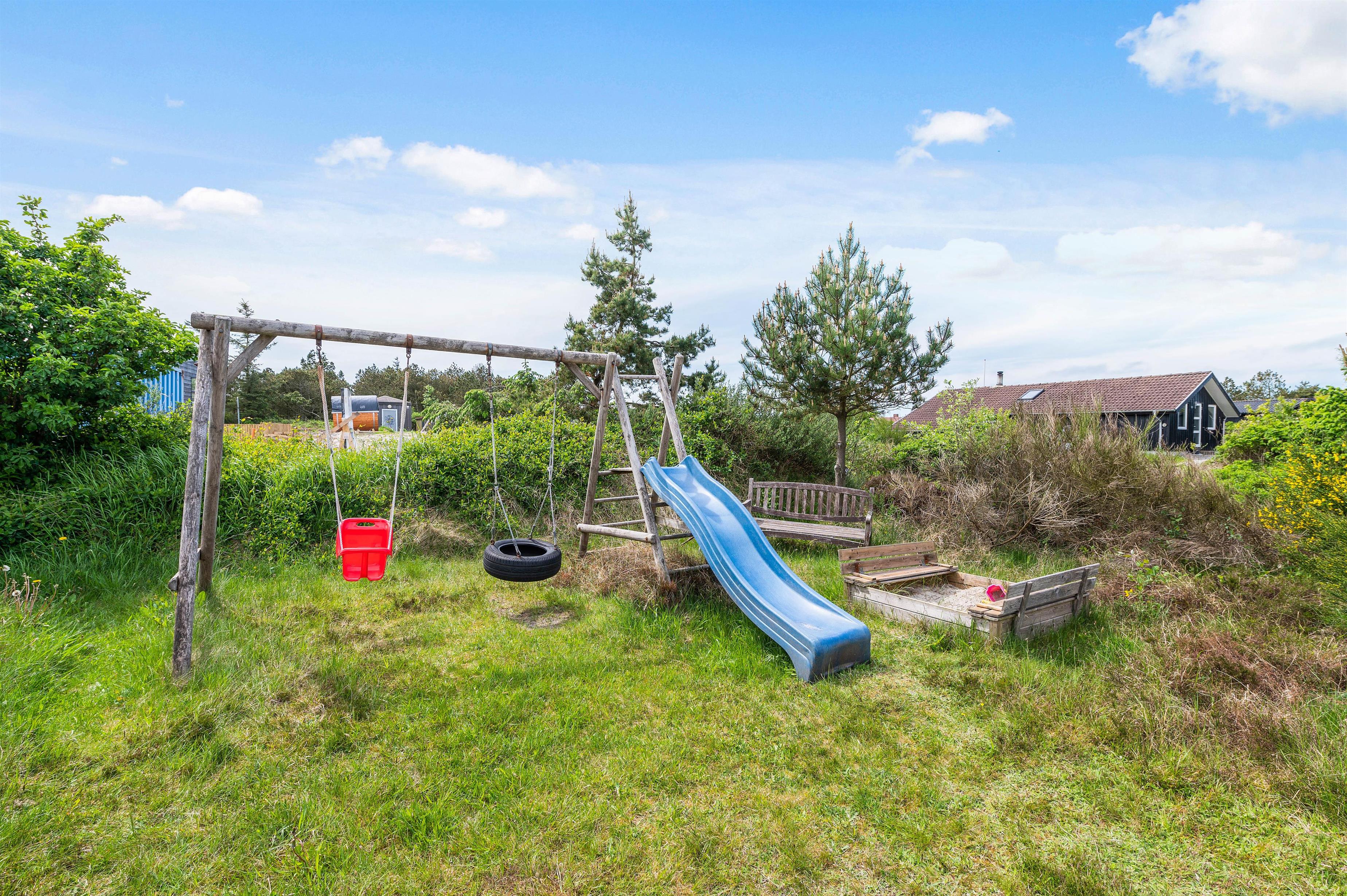 De yngste i familien kan lege ved sandkassen eller gyngestativet med rutsjebane, imens forældrene nyder et køligt glas vin eller tilbereder aftenens grillmåltid.