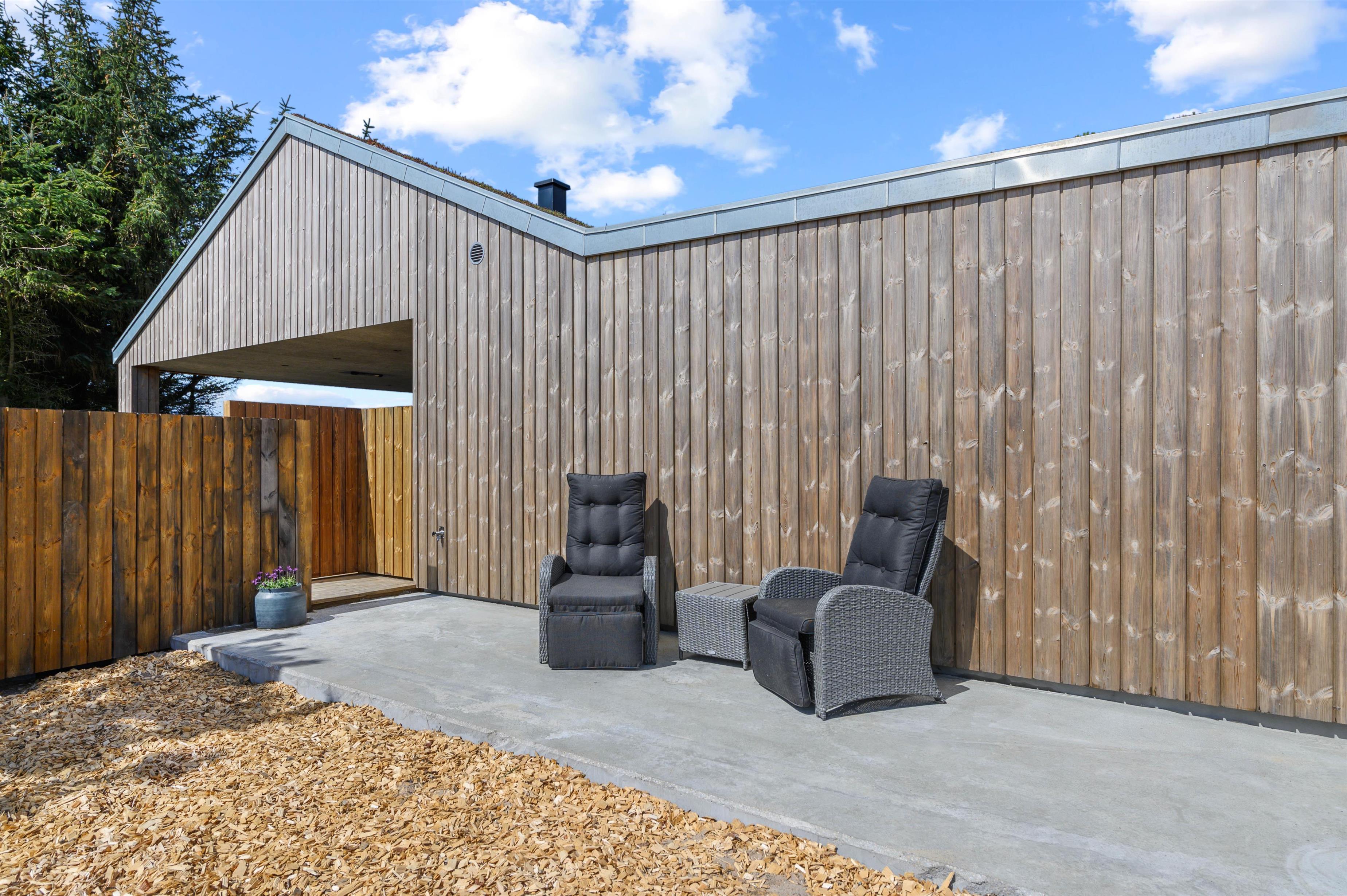 De lune sommerdage kan I nyde på den delvist afskærmede og overdækkede terrasse. Her er der lagt op til masser af afslapning og velvære efter en lang gåtur på stranden. Skyl sandet af fødderne under den udendørs bruser om sommeren og hop i det varme, boblende vand i udespaen. Udebruseren kan benyttes fra april til november.