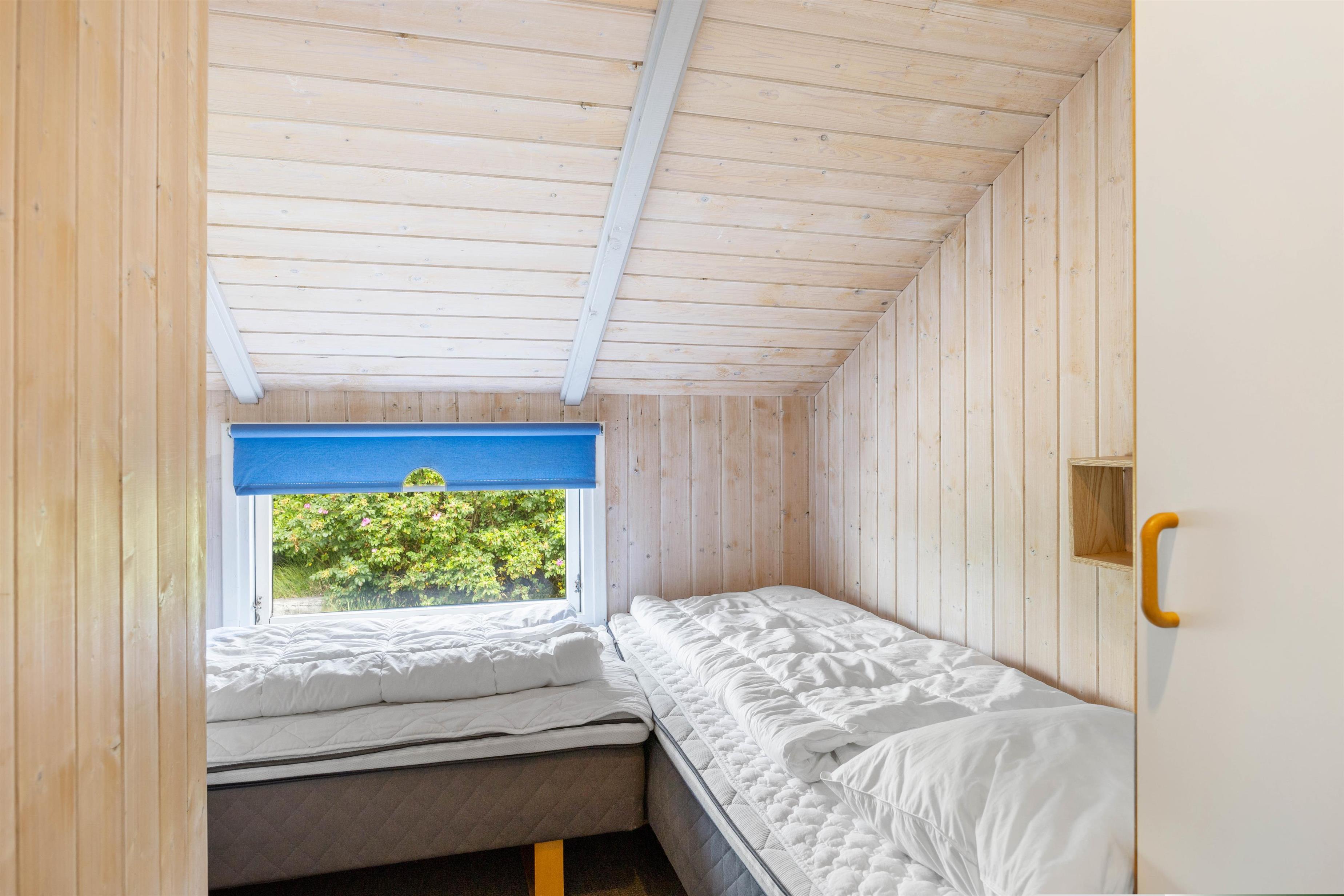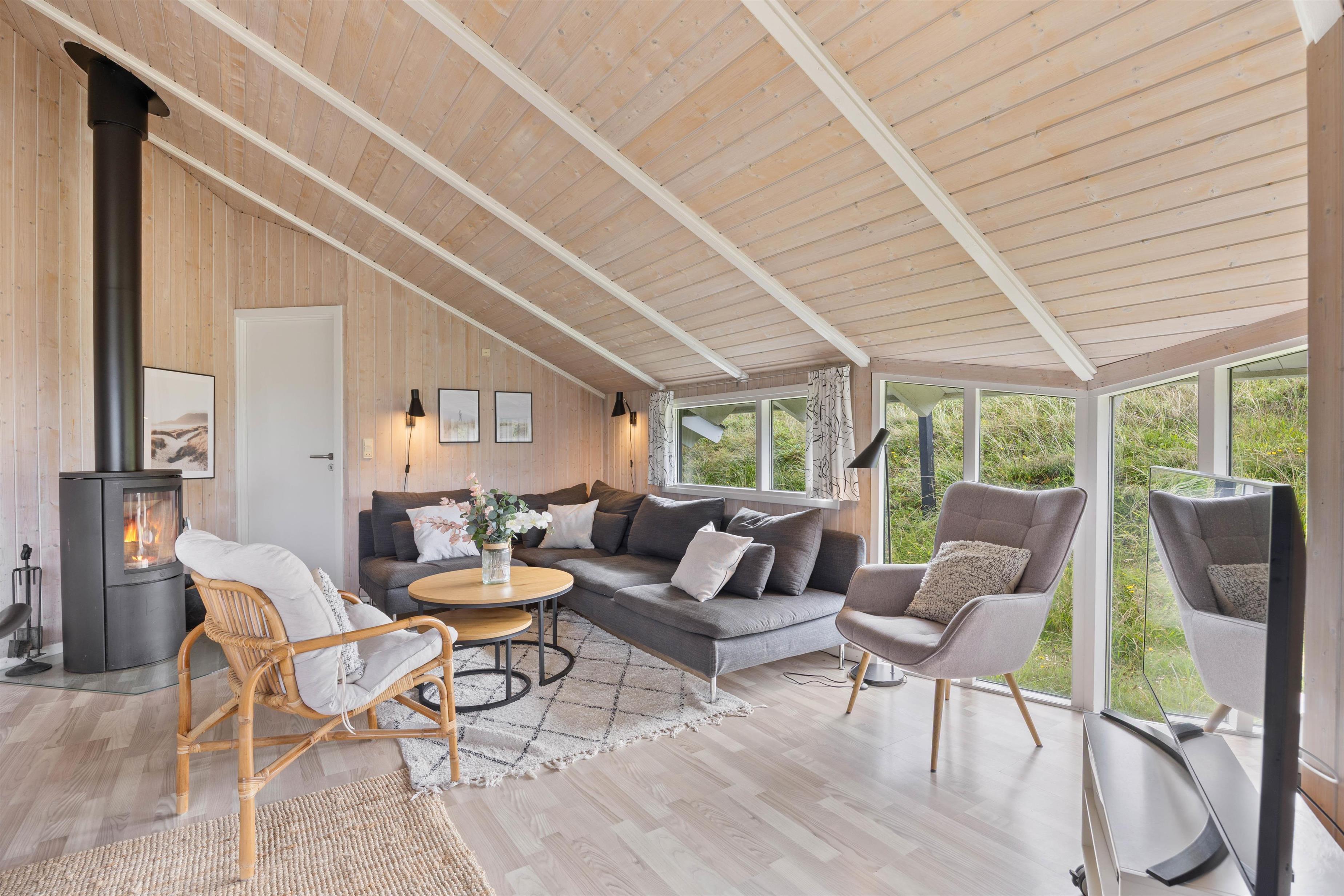De lyse, træbeklædte lofter og vægge giver et indbydende indtryk af feriehuset, hvor køkkenet i lyse venlige farver er udstyret med køleskab, fryser(50L), mikrobølgeovn og opvaskemaskine. Stuen er indrettet med komfortable møbler i både spise- og opholdsafdeling, hvor brændeovnens flammer understreger feriens hyggestemning. Her kan også slappes af med TV, parabol, DVD og CD-radio. - I finder også et cromcast i sommerhuset, så yndlingsserien kan streames. Det trådløse internet kan benyttes gratis.
