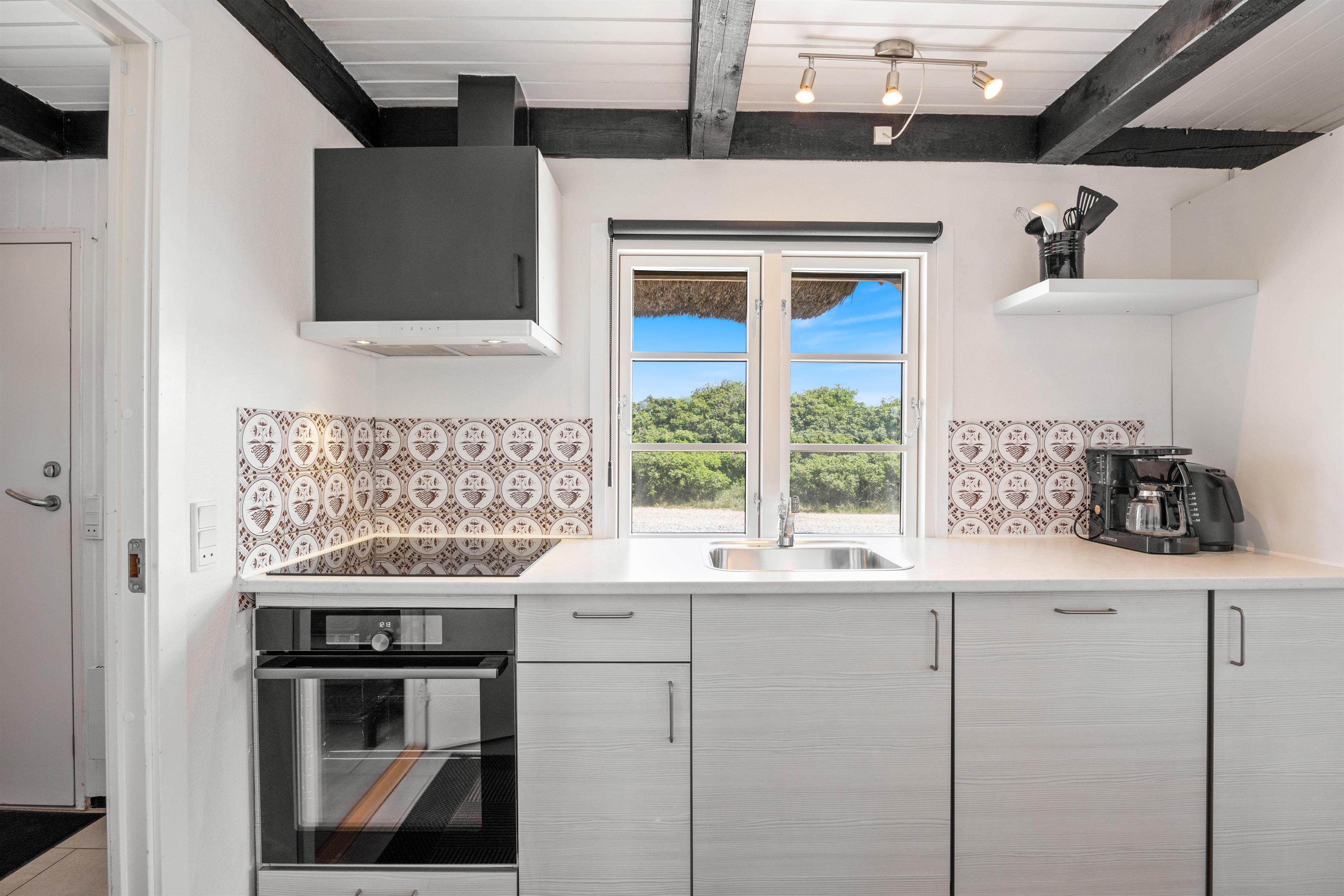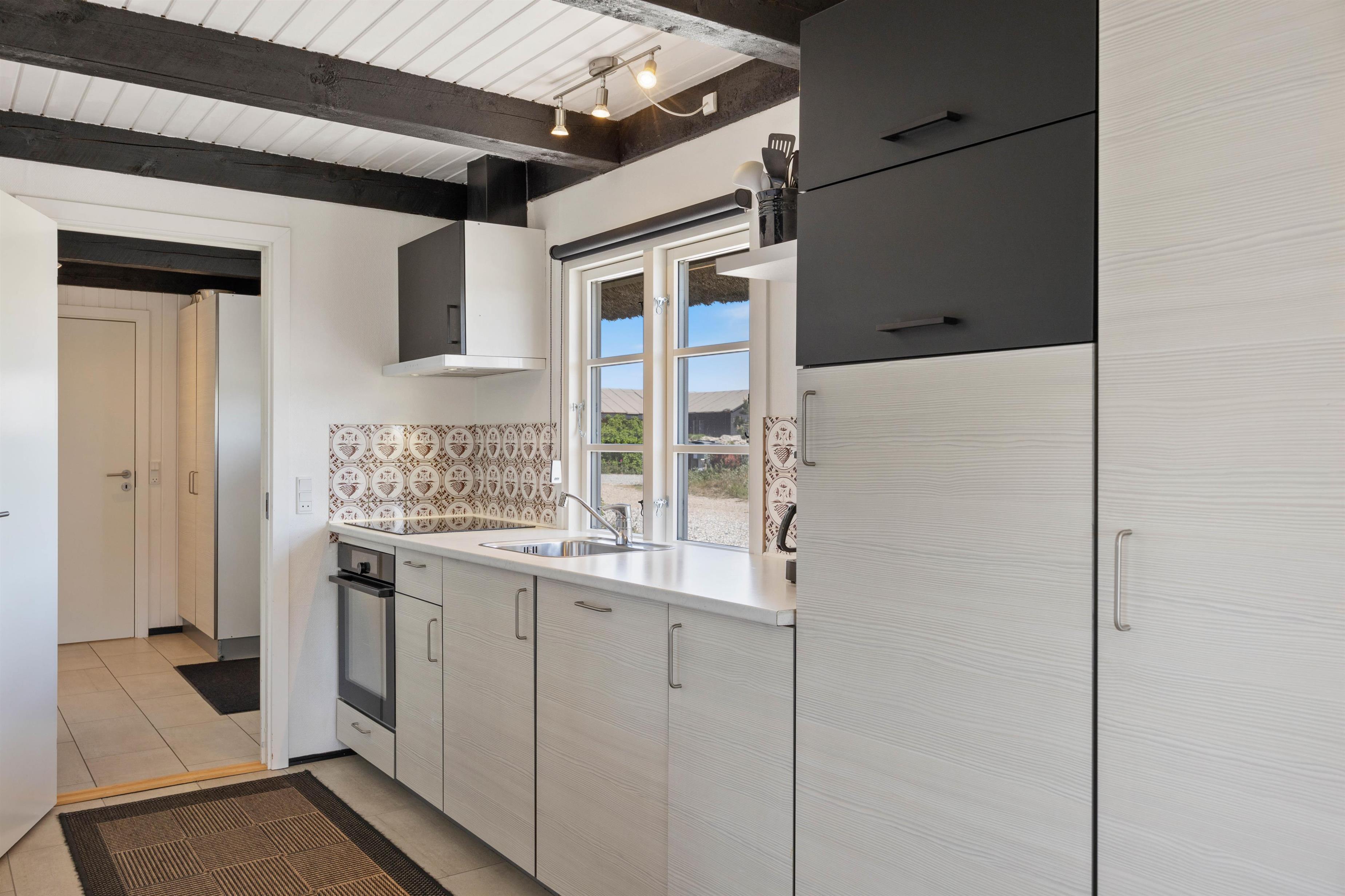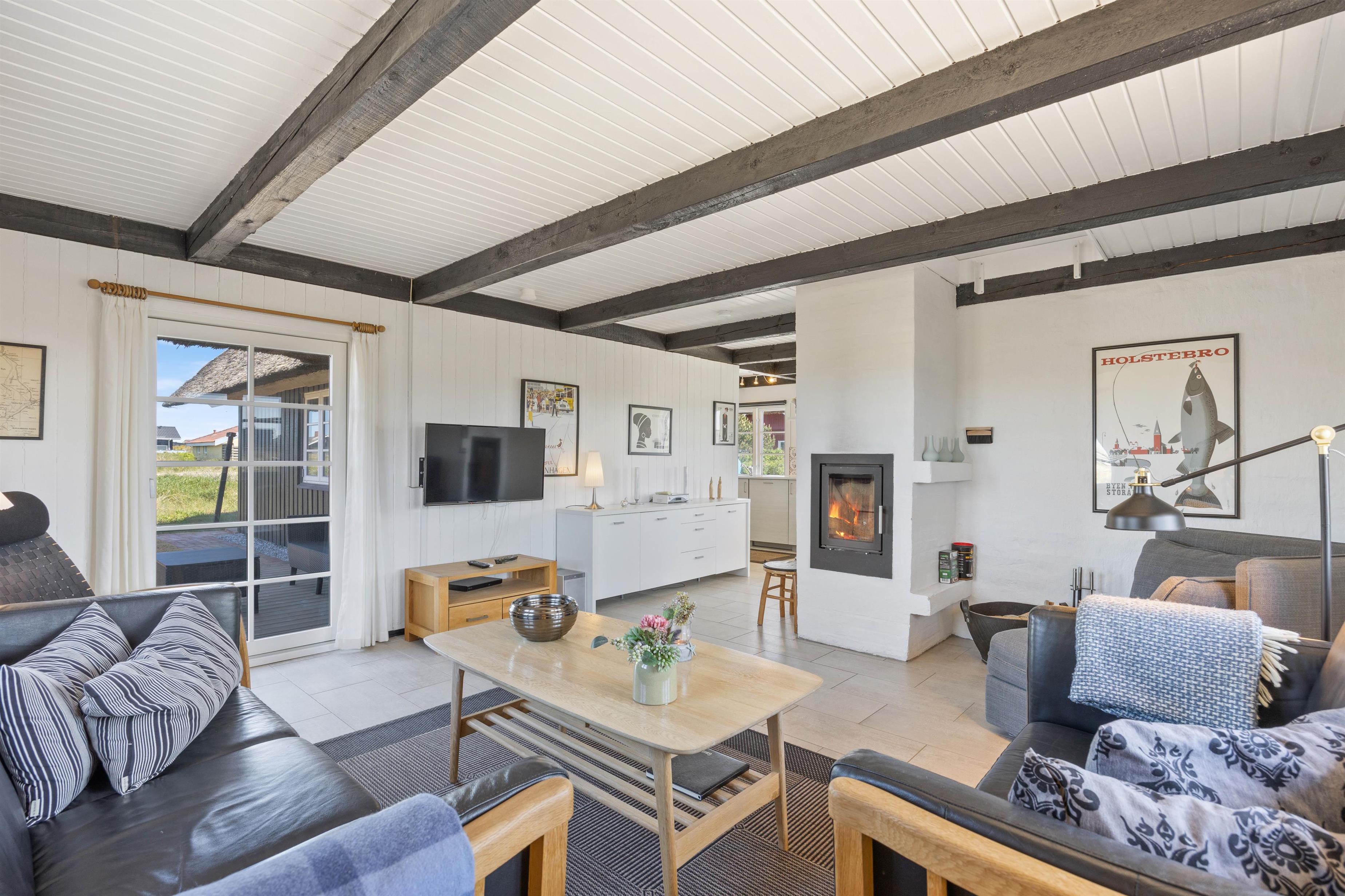 De lyse gulve, vægge og lofter og det fine lysindfald fra det brede vinduesparti giver en dejlig stemning i opholdsstuen. Her kan I trække jer tilbage med en god bog foran brændeovnen, eller I kan se en film sammen via Chromecast. Ved spisebordet kan I nyde dagens måltider i de charmerende omgivelser, eller I kan spille et brætspil. Det åbne køkken indeholder alt, hvad I behøver for at forkæle hinanden med lækre, hjemmelavede måltider, herunder også opvaskemaskine. Især lystfiskere vil glædes over den separate fryser på 100 l. Her kan nok være en fisk eller to.