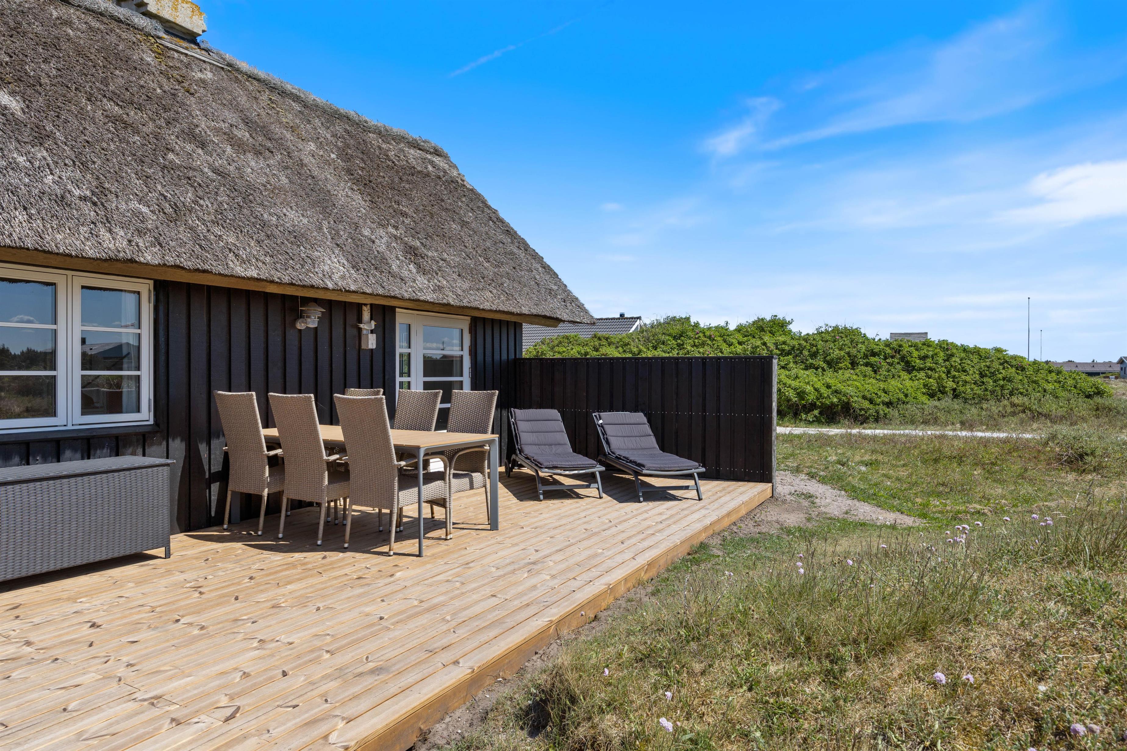 Det charmerende træsommerhus er flot og nænsomt renoveret. Den sorte træfacade står flot til stråtaget og de hvide sprossevinduer. På naturgrunden kan I følge med i fugle- og dyrelivet omkring jer. Den fine terrasse ligger på to sider af sommerhuset, så her vil I altid kunne finde en rolig krog. Slap af i de komfortable havemøbler, eller tag solbad i solvognene. Bliver solen for stærk, må I slå parasollen op.