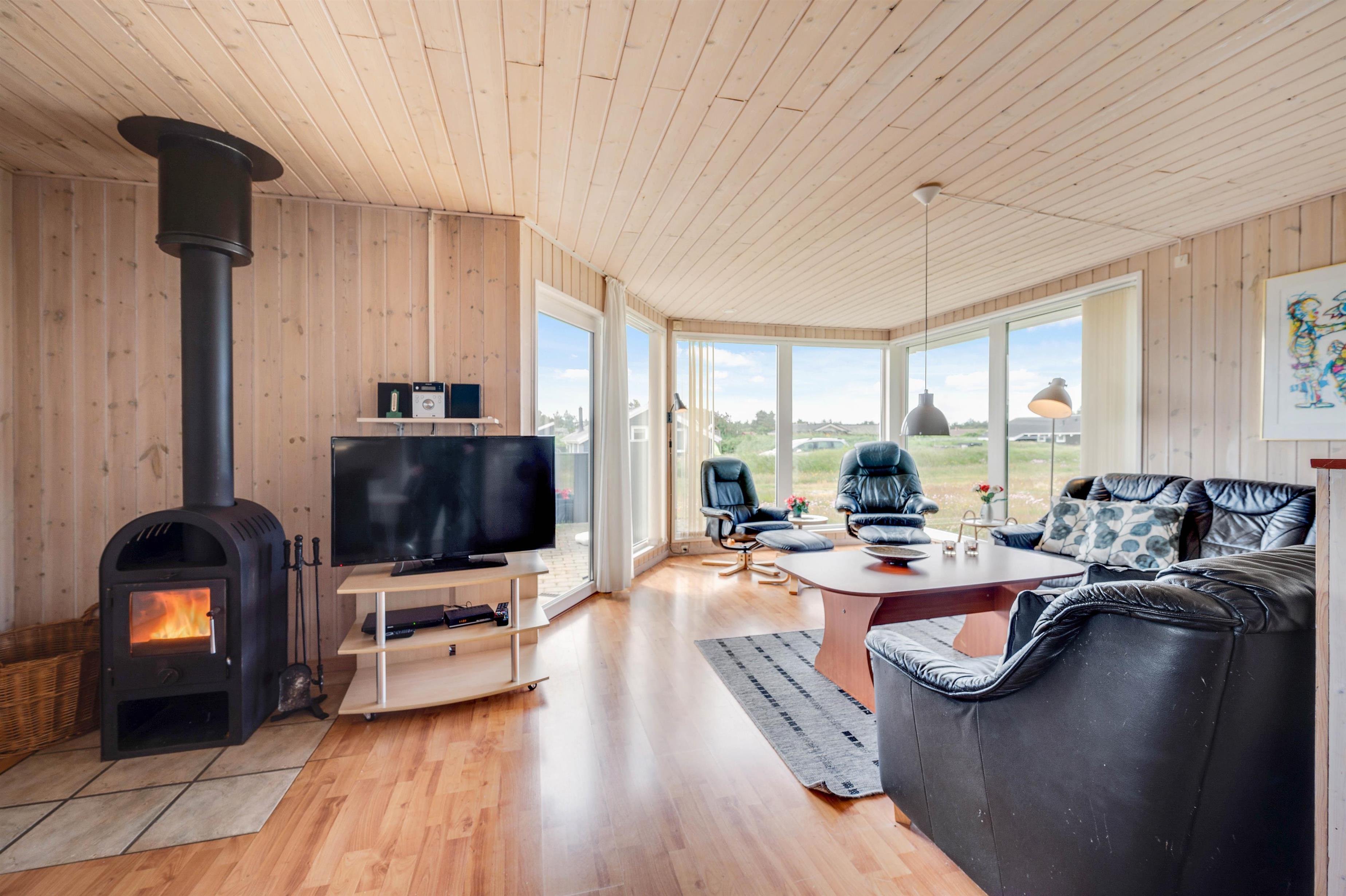 Den energibesparende varmepumpe sørger for et godt indeklima året rundt, og I kan også tænde op i brændeovnen, som både spreder varme og hyggelig feriestemning.
