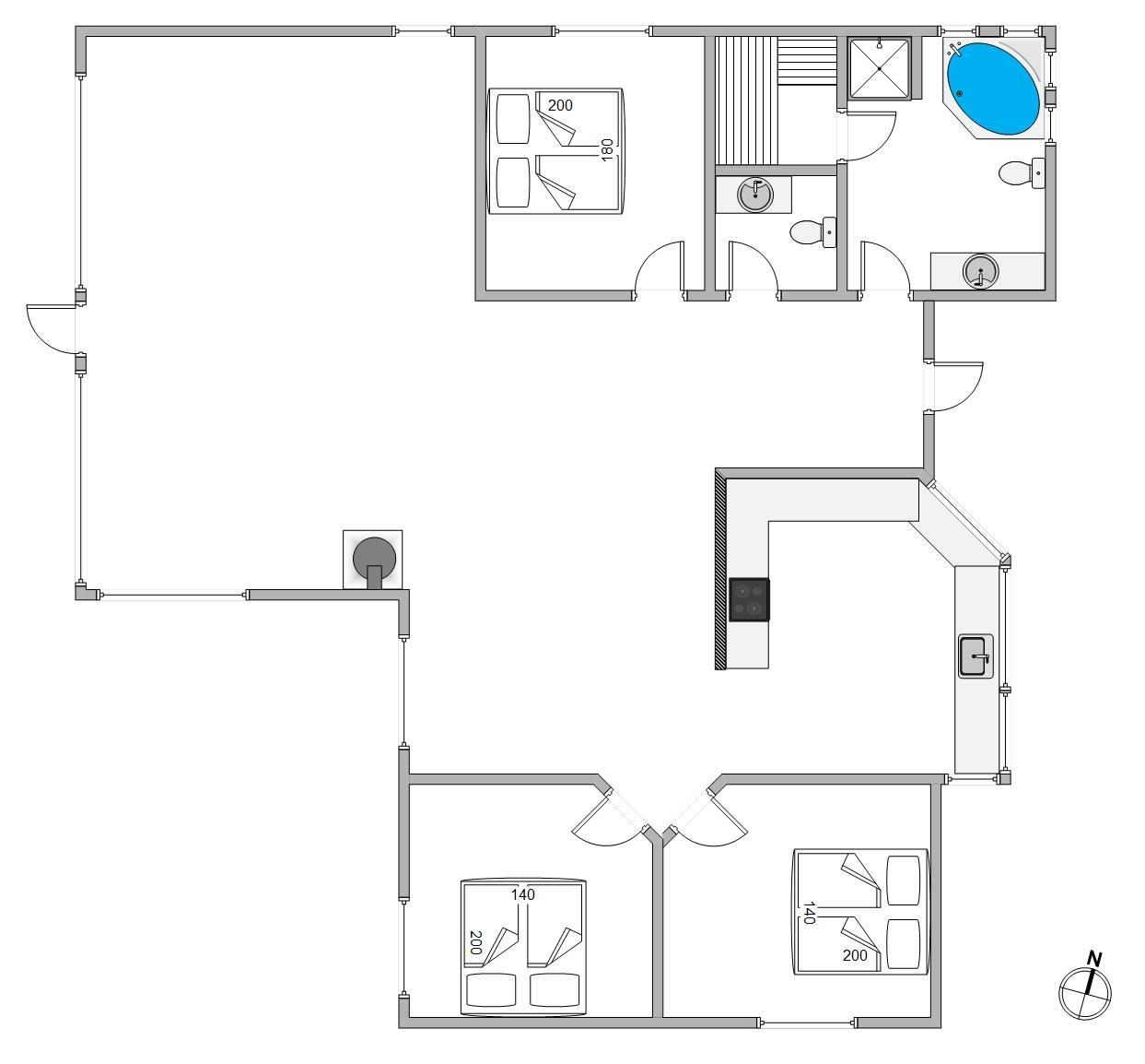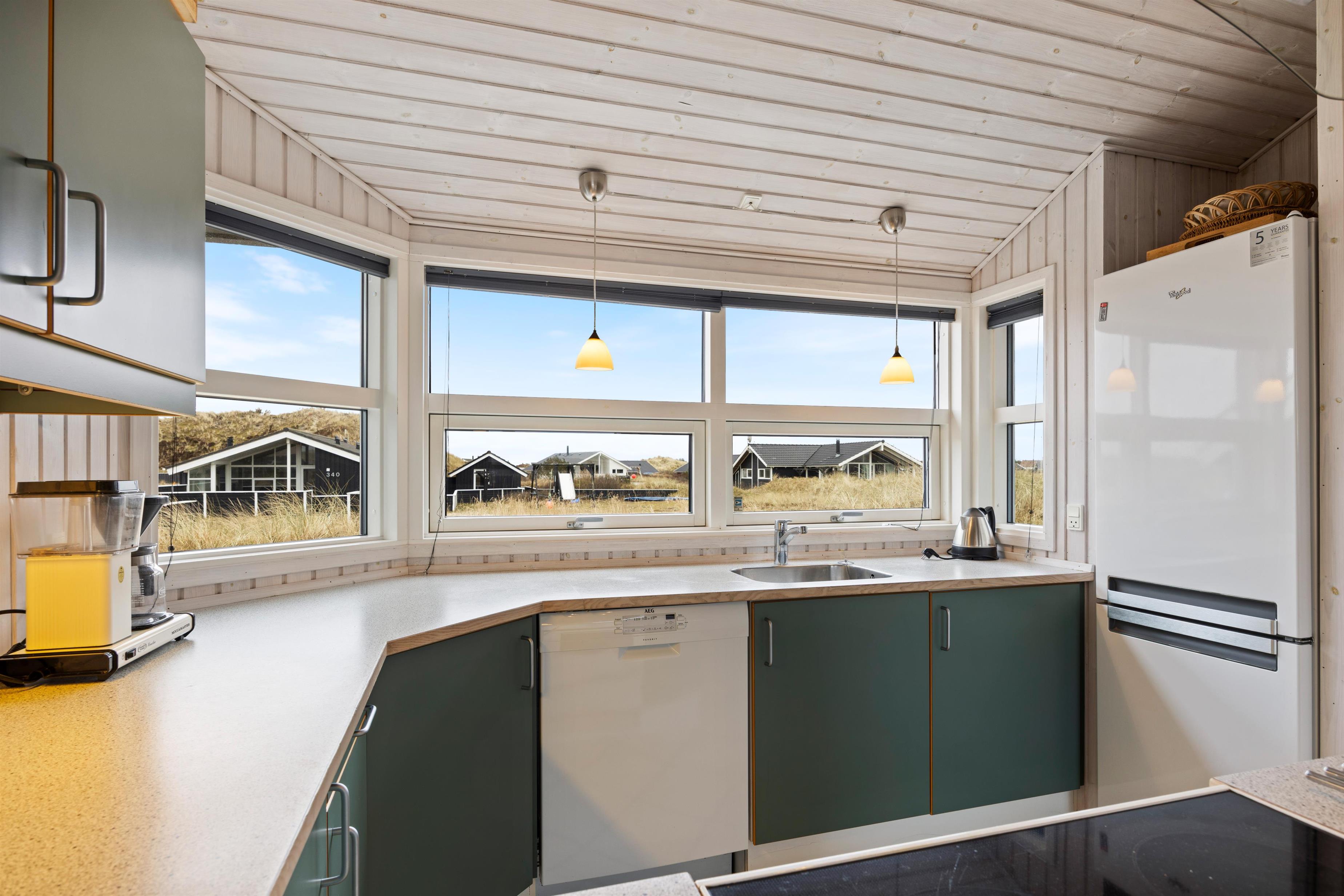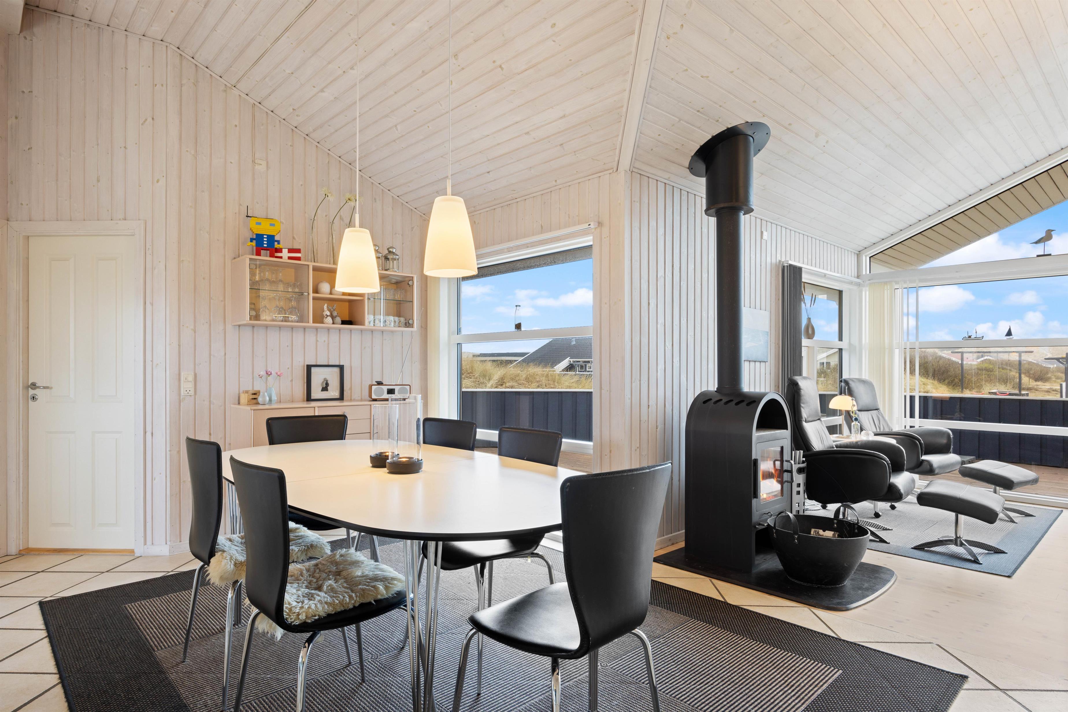 Her får I et virkelig lyst og smagfuldt indrettet feriehus til den vellykkede familieferie. Sommerhuset opvarmes af energibesparende varmepumpe og har et badeværesel, hvor I kan slappe af i sauna og spa.