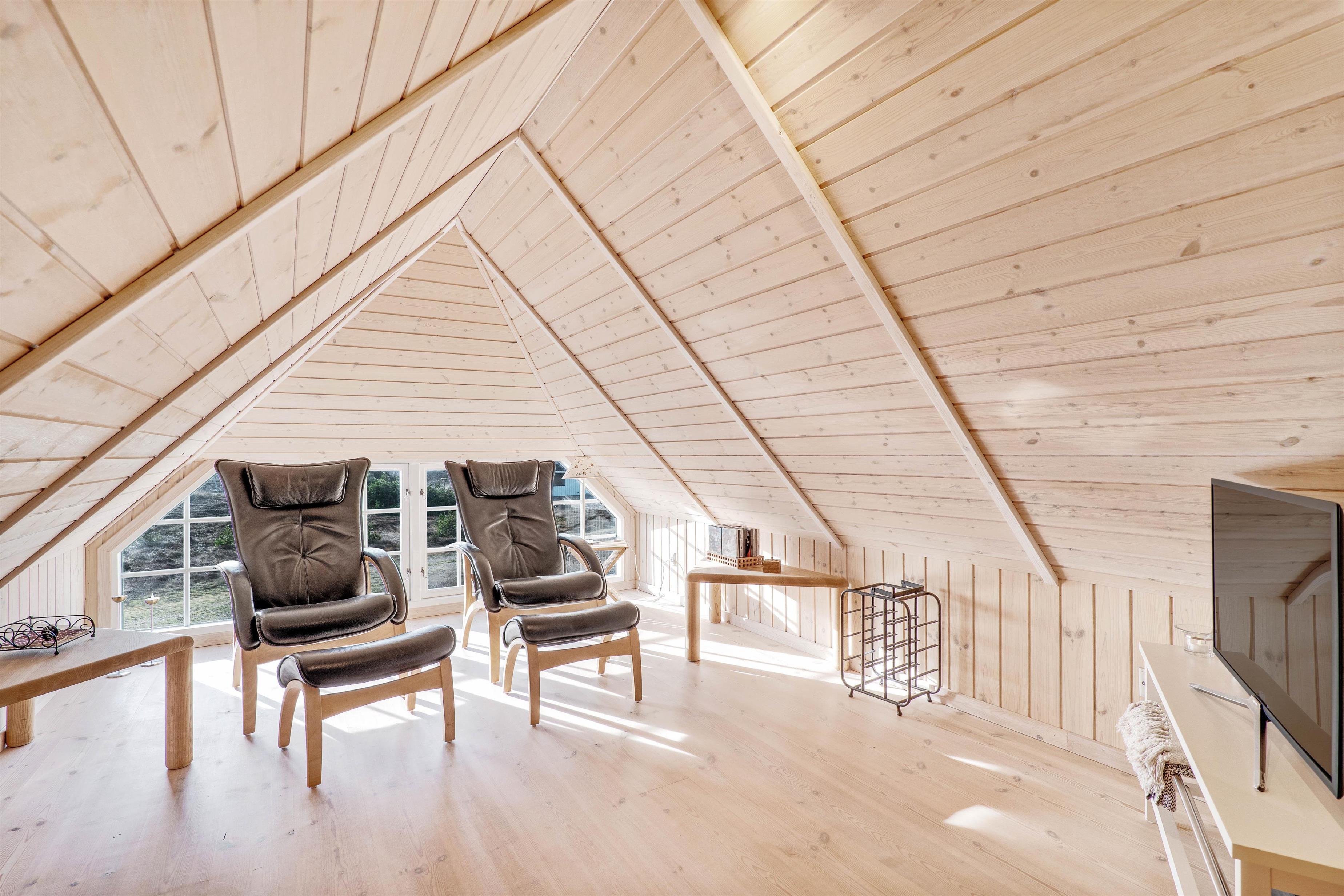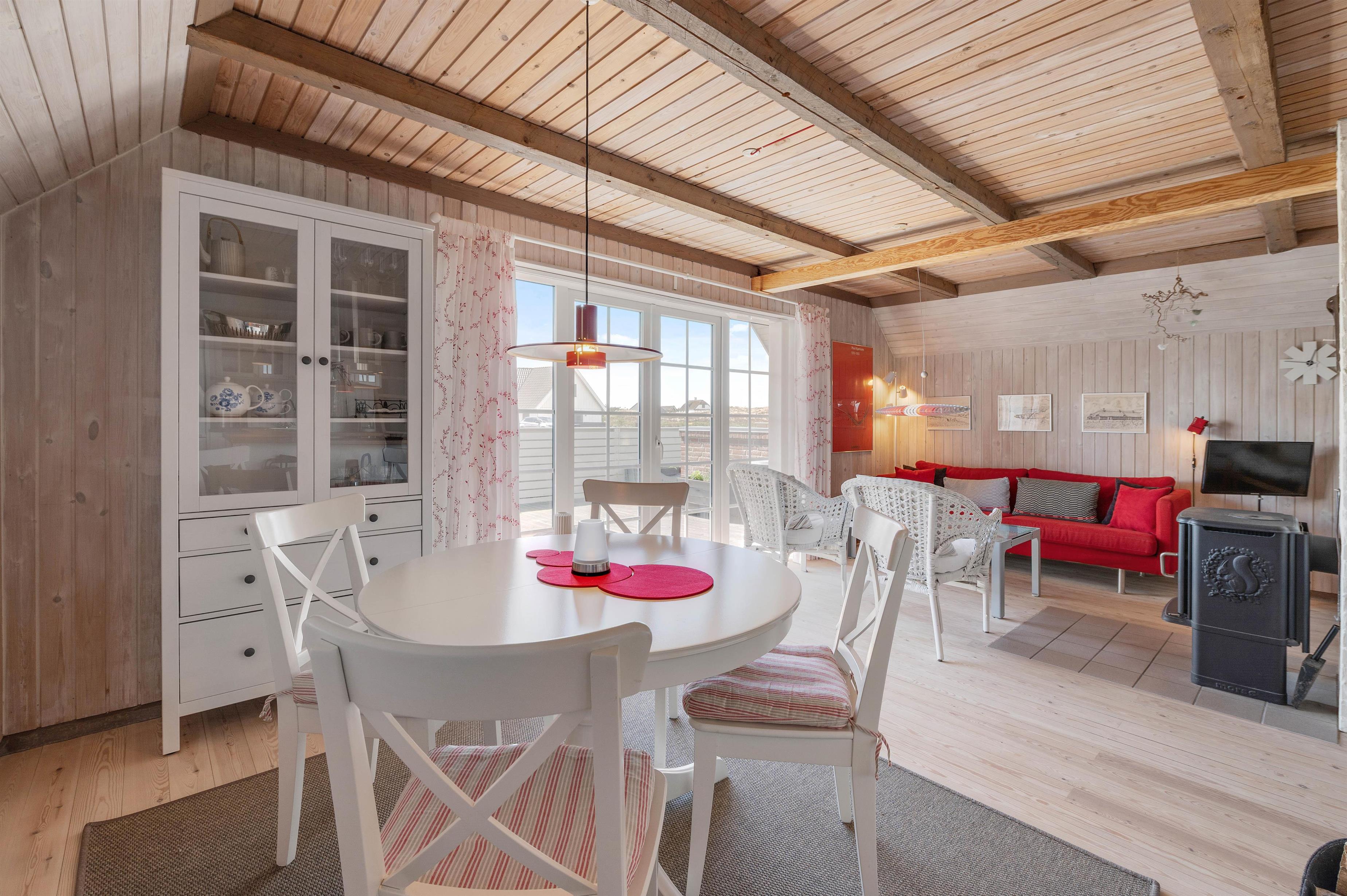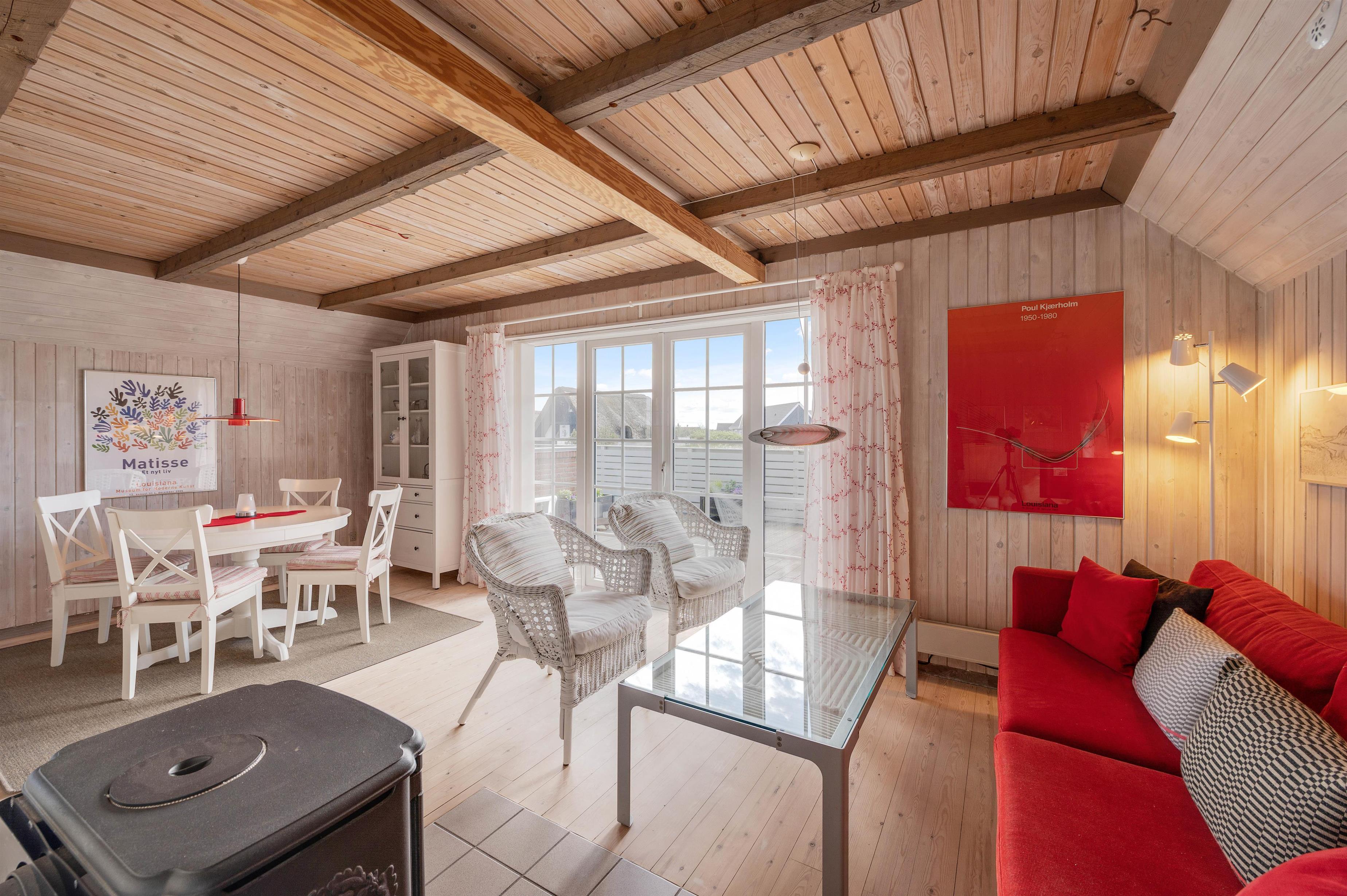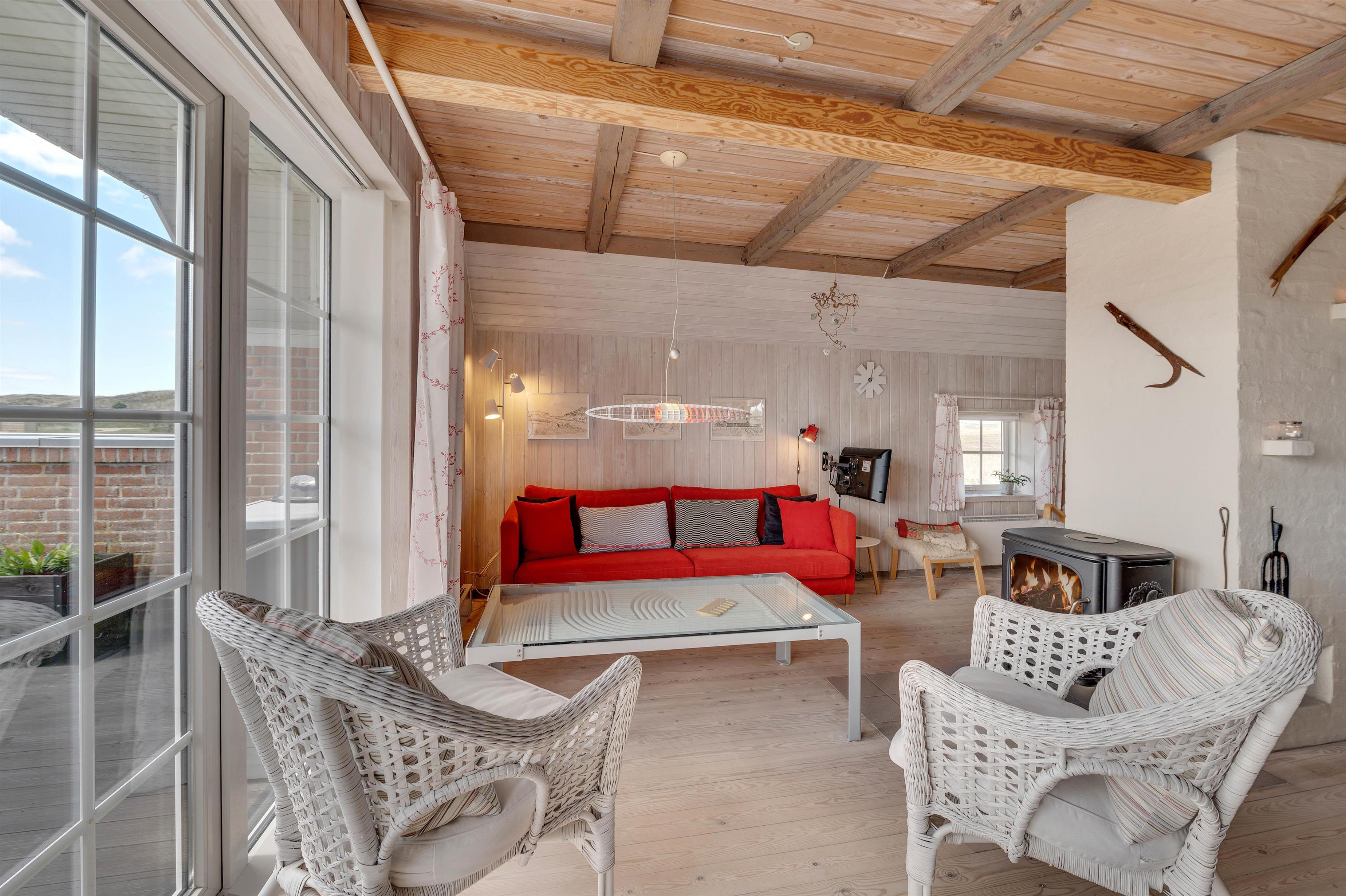 Det rustikke og hyggeligt indrettede opholdsrum indbyder, i kombination med velovervejede detaljer, til ren afslapning for hele familien. Her kan alle samles til hyggelige stunder, og som prikken over i´et sørger brændeovnen for at sprede både varme og ekstra feriestemning.
