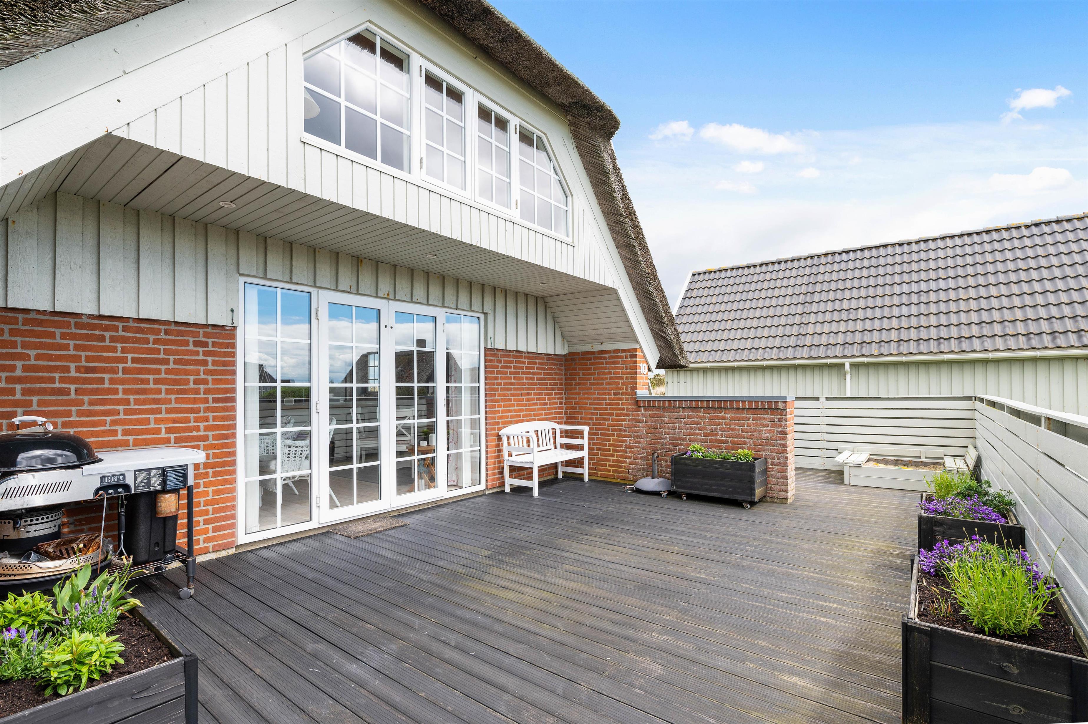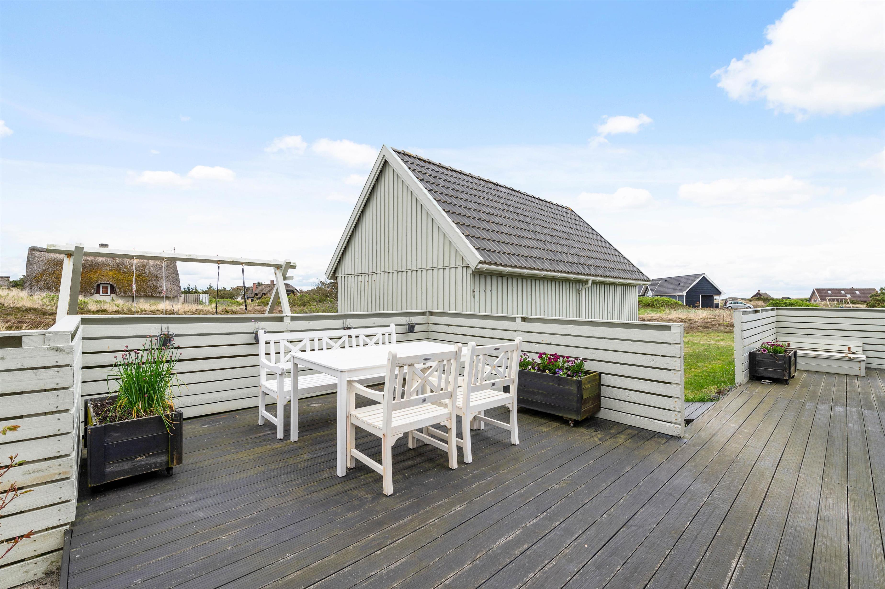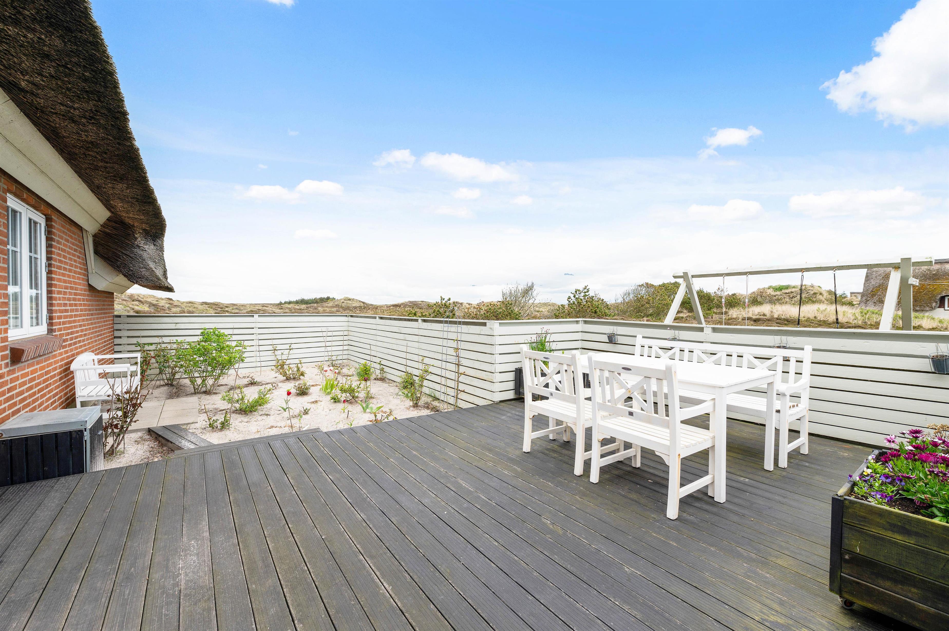 Fra opholdsstuen har I direkte udgang til den sydvendte træterrasse, som er afskærmet. Her kan hele familien samles til lækre grillmåltider med en fantastisk panoramaudsigt til det smukke klitlandskab. Terrassen strækker sig til østsiden af sommerhuset, hvor I har mulighed for at nyde solopgangen med en kop kaffe.