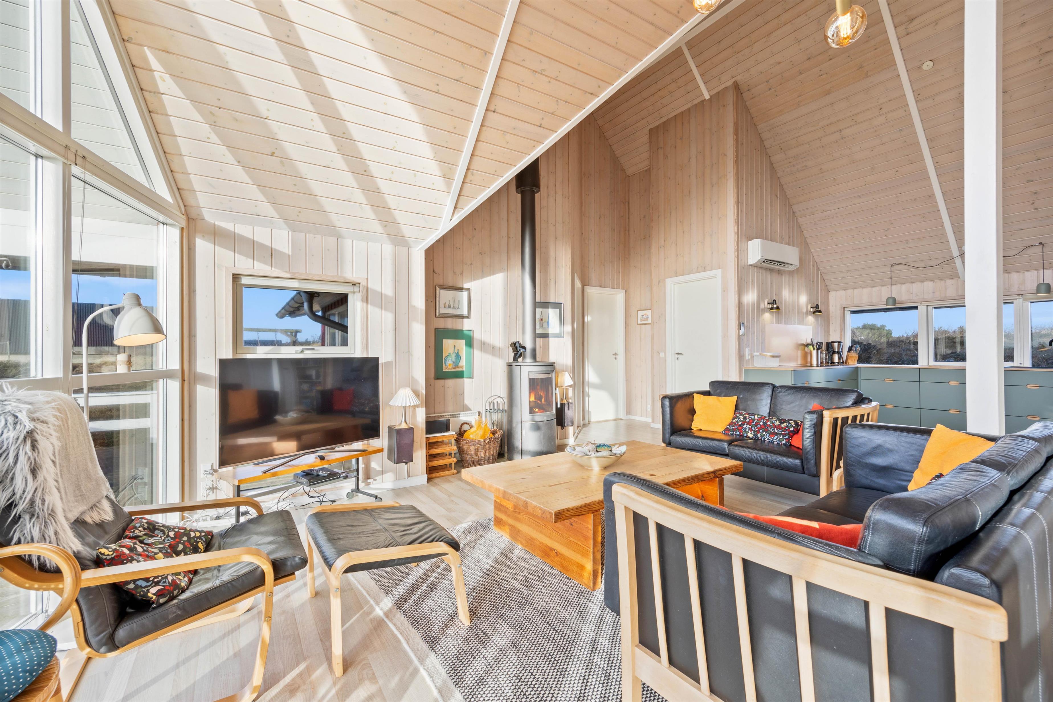 Fra den store stue og fra den sydvendte terrasse kan du nyde den smukke udsigt over heden til klitterne. Husets centrum; det store opholdsrum og stue er udstyret med fladskærm, store vinduespartier og er åbent til kip. Det giver et skønt rum, hvor naturen er en uundgåelig del af oplevelsen. Her kan I tænde op i brændeovnen og nyde hinandens samvær.