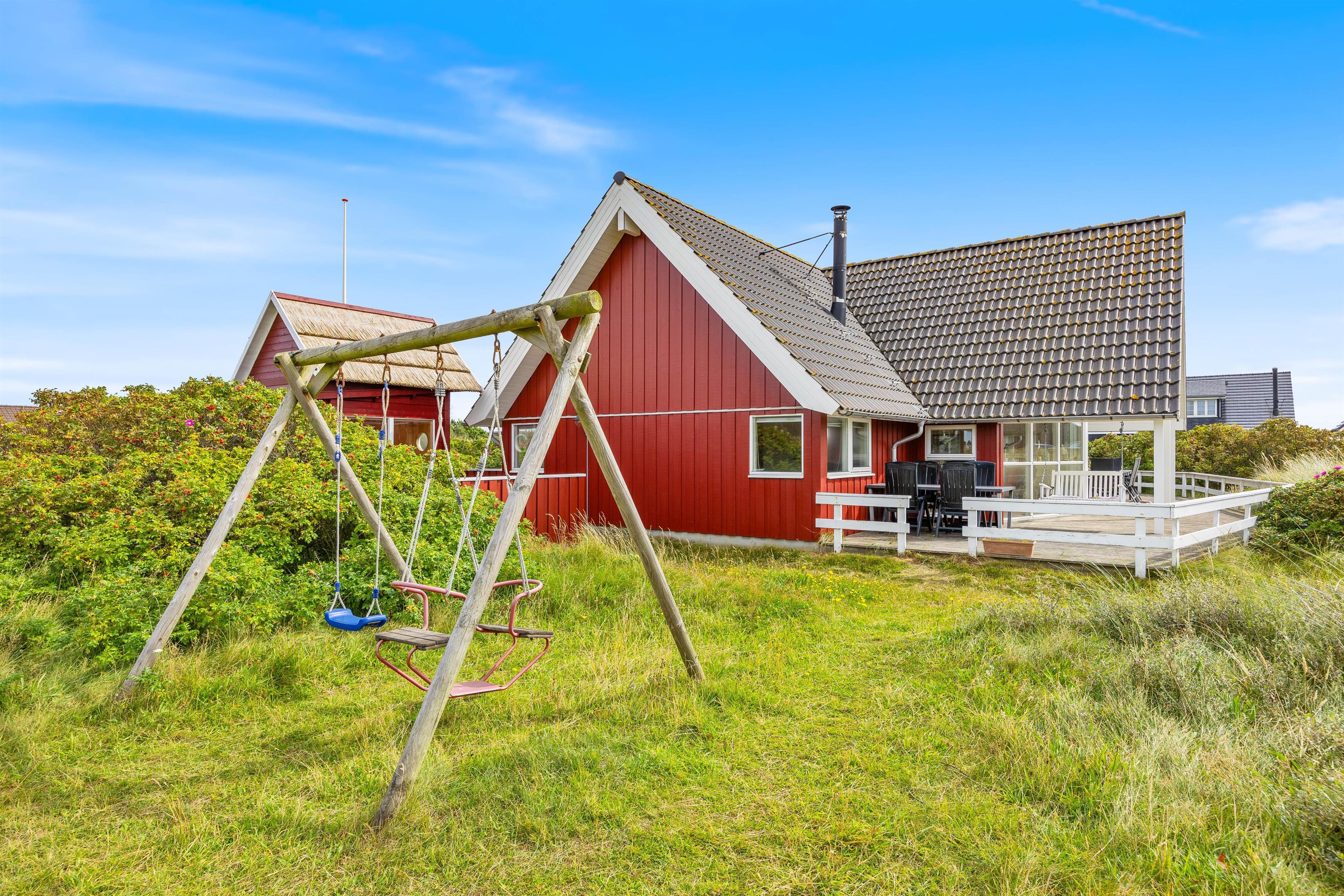 Slap af og lad batterierne op i et virkeligt dejligt sommerhus, som har den helt rigtige beliggenhed, hvis du elsker den barske vestjyske natur og søger fred og ro. Der er store hedeområder lige syd for sommerhuset og en kort travetur mod vest bringer dig til stranden og det brusende Vesterhav. Fra stuen er der udgang til den store træterrasse, hvor I kan tilbringe en masse timer i solen. Terrassen er delvis overdækket og afskærmet, så man kan finde læ. Slå eventuelt parasollen op og tilbered en lækker middag, som I kan nyde på terrassen i de behagelige havemøbler.