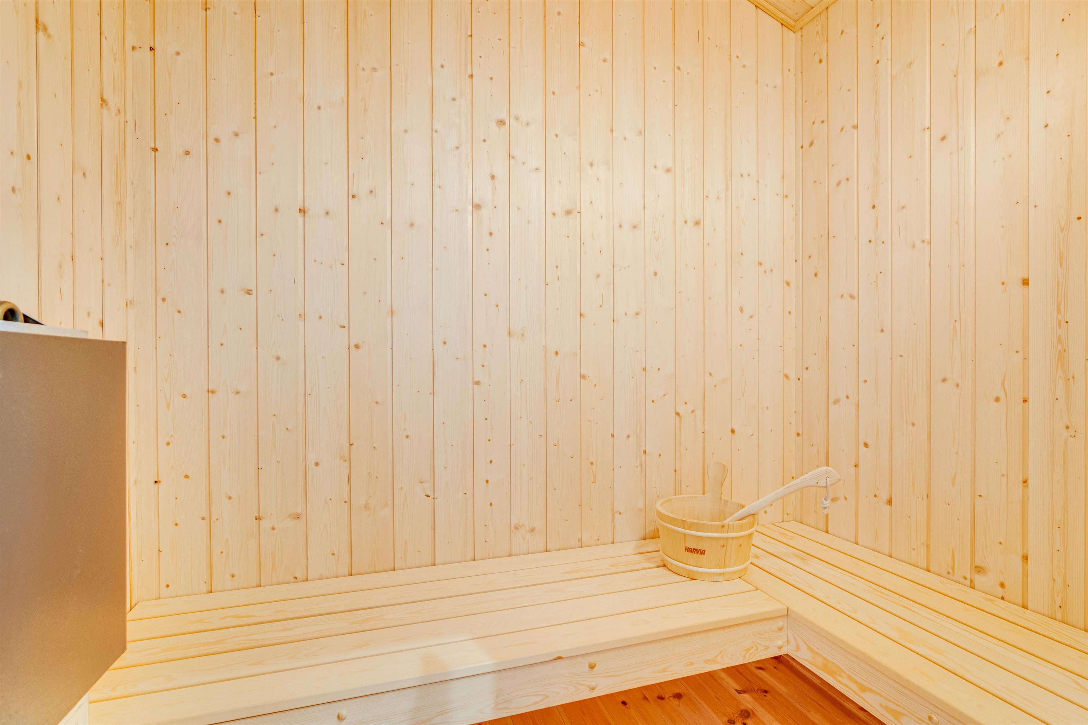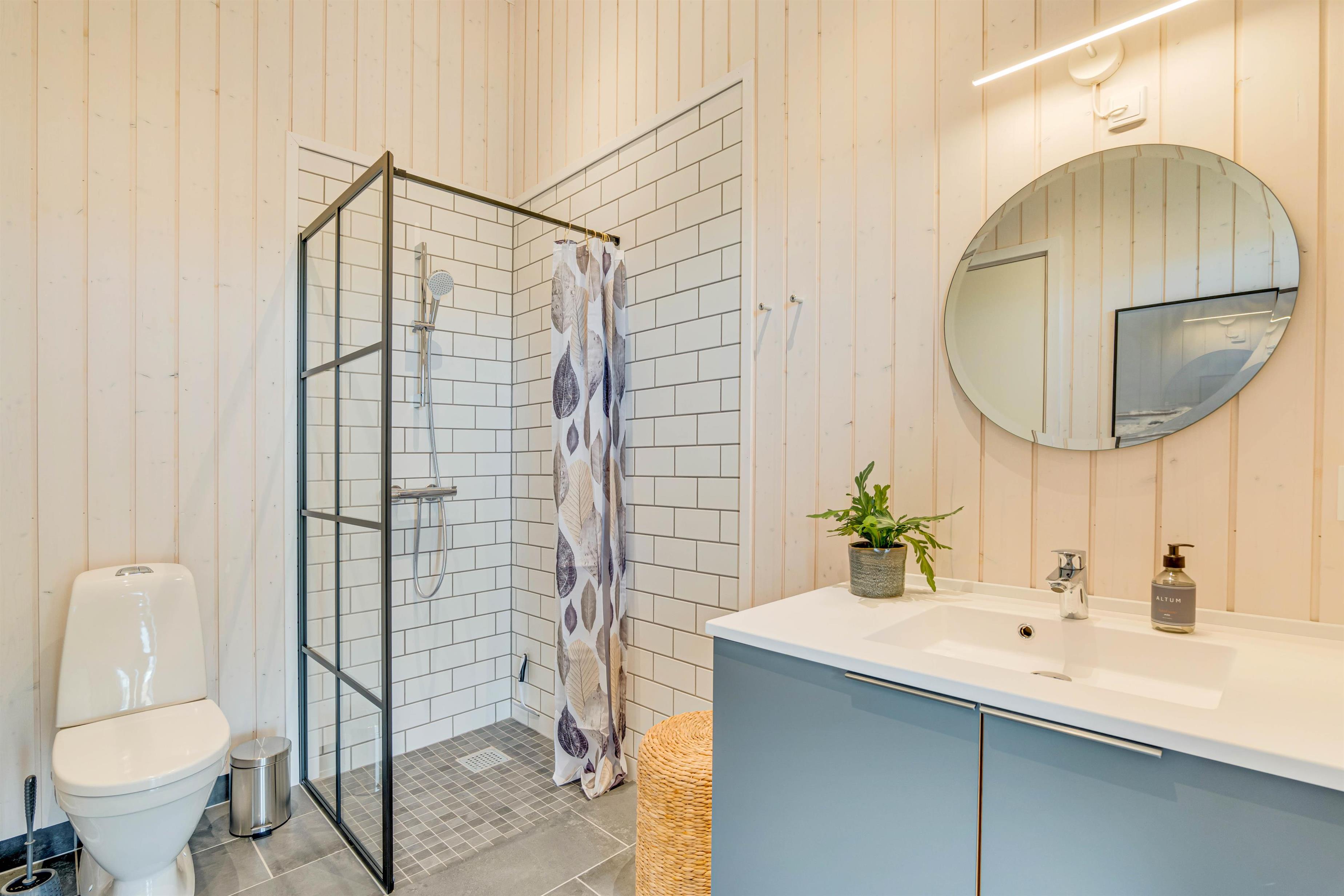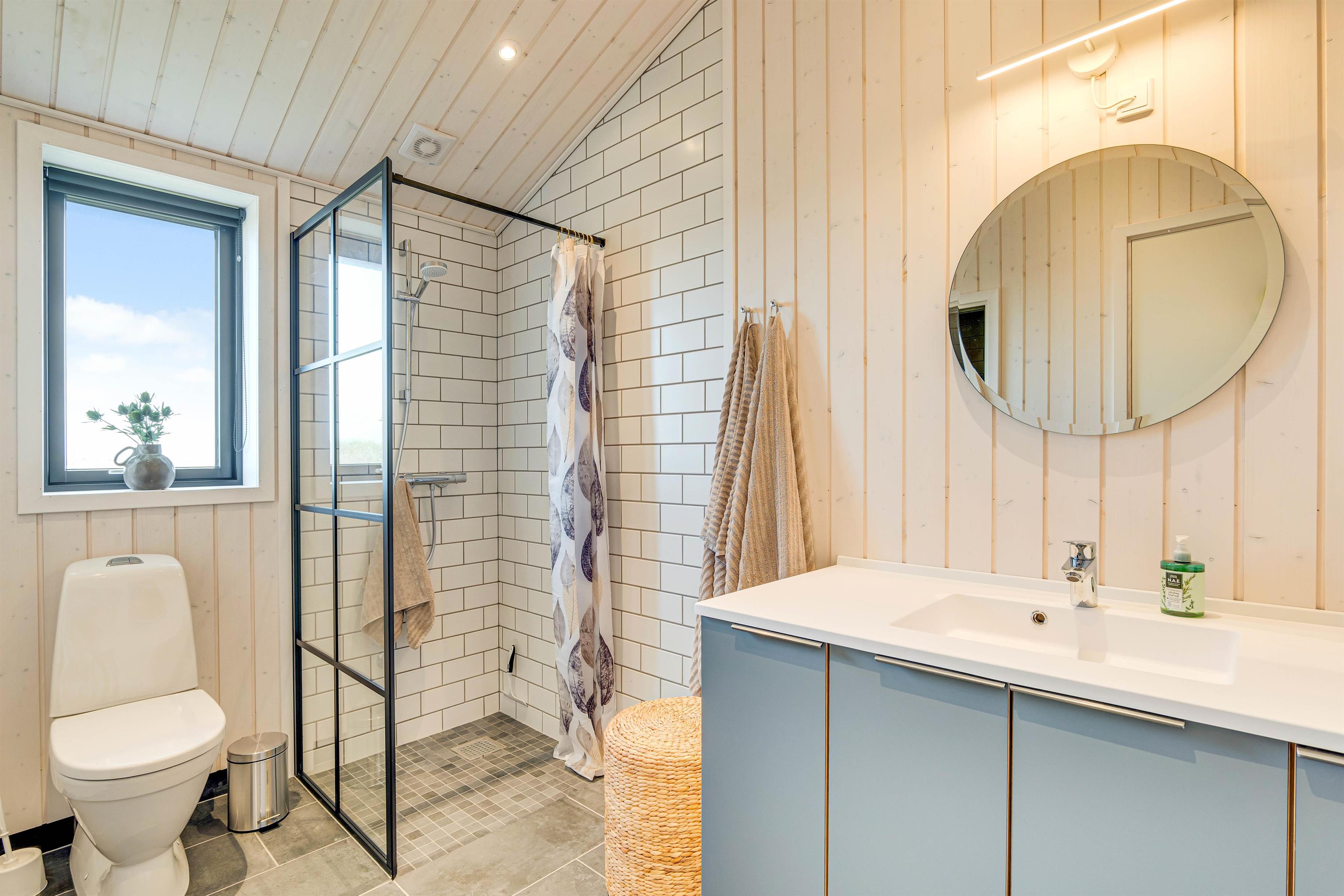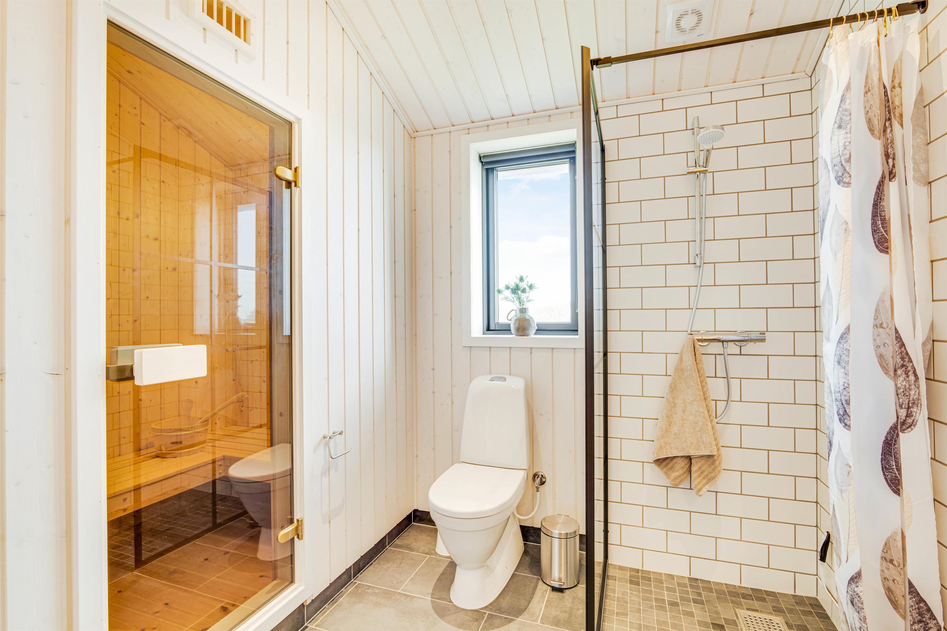 I sommerhuset er der desuden 2 badeværelser, begge med flisebelagt bruseniche og behagelig gulvvarme, som er dejligt at betræde på kolde morgener med de bare fødder. I det ene badeværelse er der direkte adgang til saunaen, hvor der er rigeligt med plads til jer.