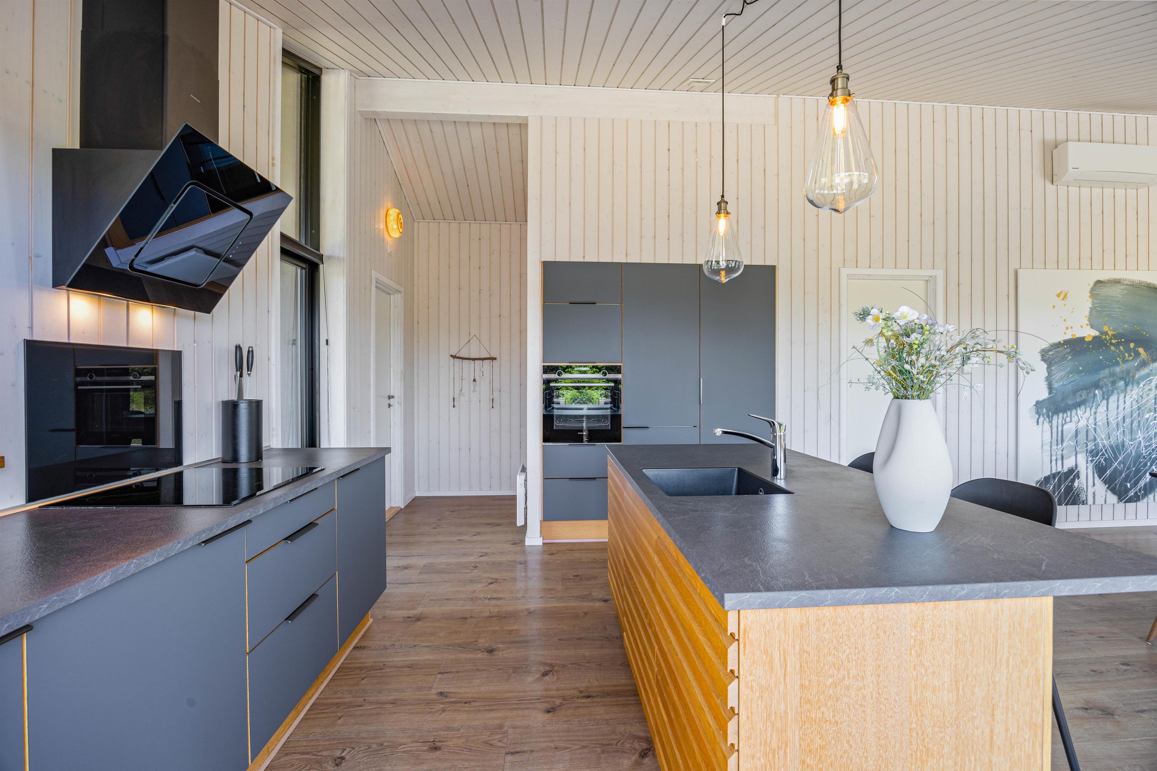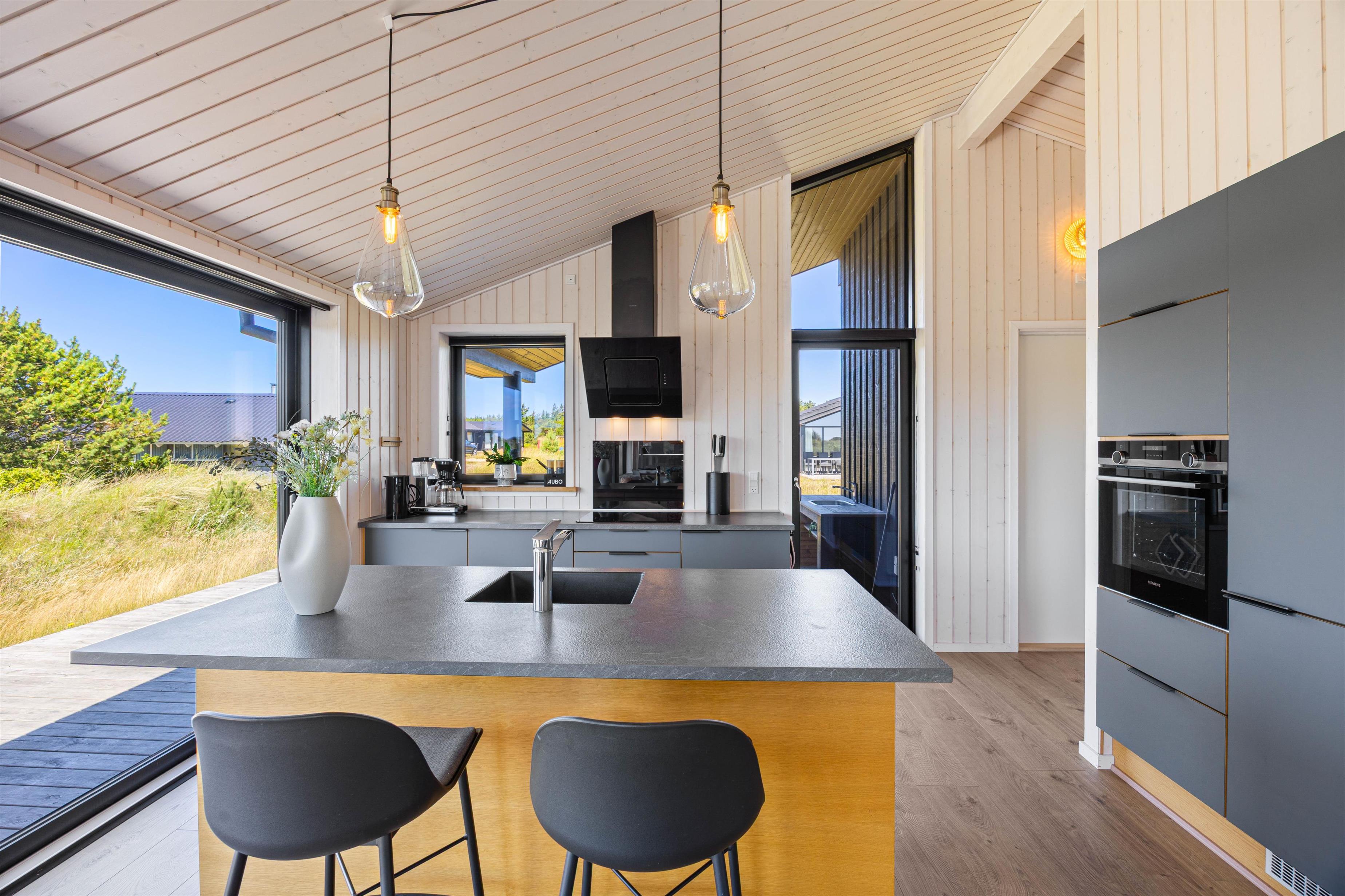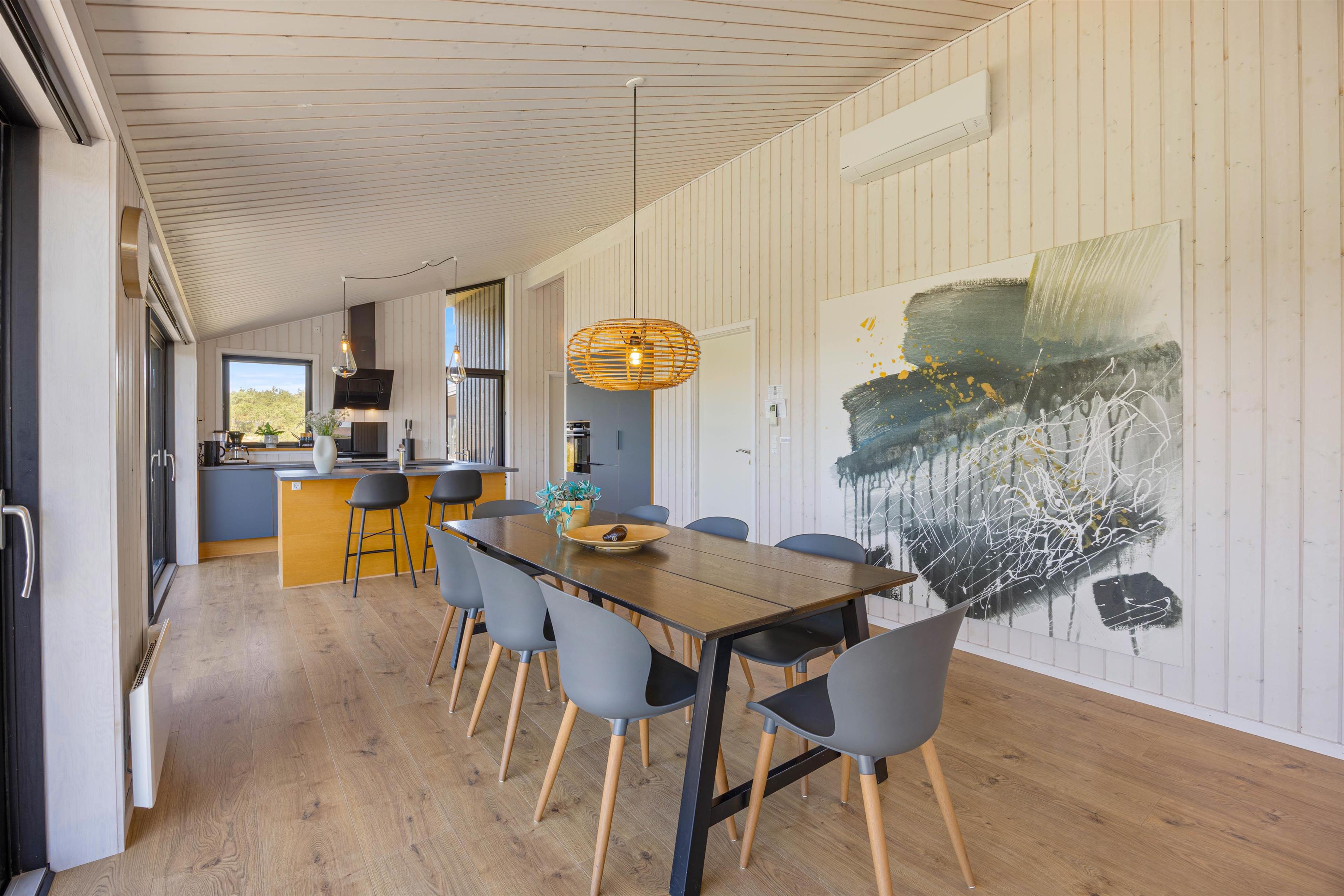 Sommerhuset er smagfuldt indrettet med farverige, behagelige og moderne møbler. Det åbne køkken indbyder til fælles madlavning, så måske familiens mindste vil hjælpe til med aftensmaden en af feriedagene? I køkkenet finder I desuden en højtaler med bluetooth. Fra køkkenet er der udgang til den store træbelagte terrasse med de grønne arealer omkring.