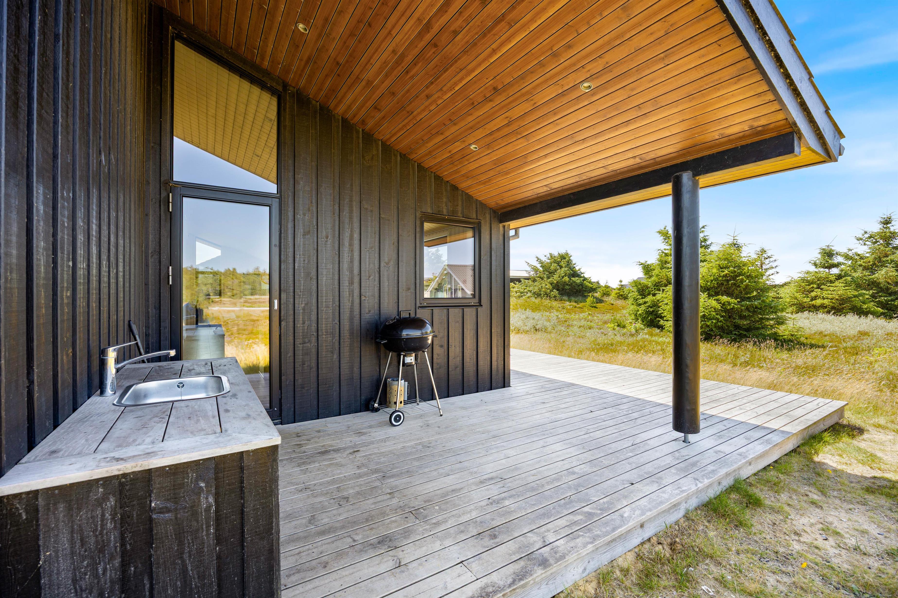 Dette sommerhus omkranses af en smuk træterrasse med direkte adgang til naturen. På terrassen finder I et udekøkken med rindende vand og bordplads. Her kan aftensmaden forberedes og efterfølgende tilberedes på kulgrillen, så der er lagt op til rigtig feriehygge på terrassen på en smuk, lun sommeraften.