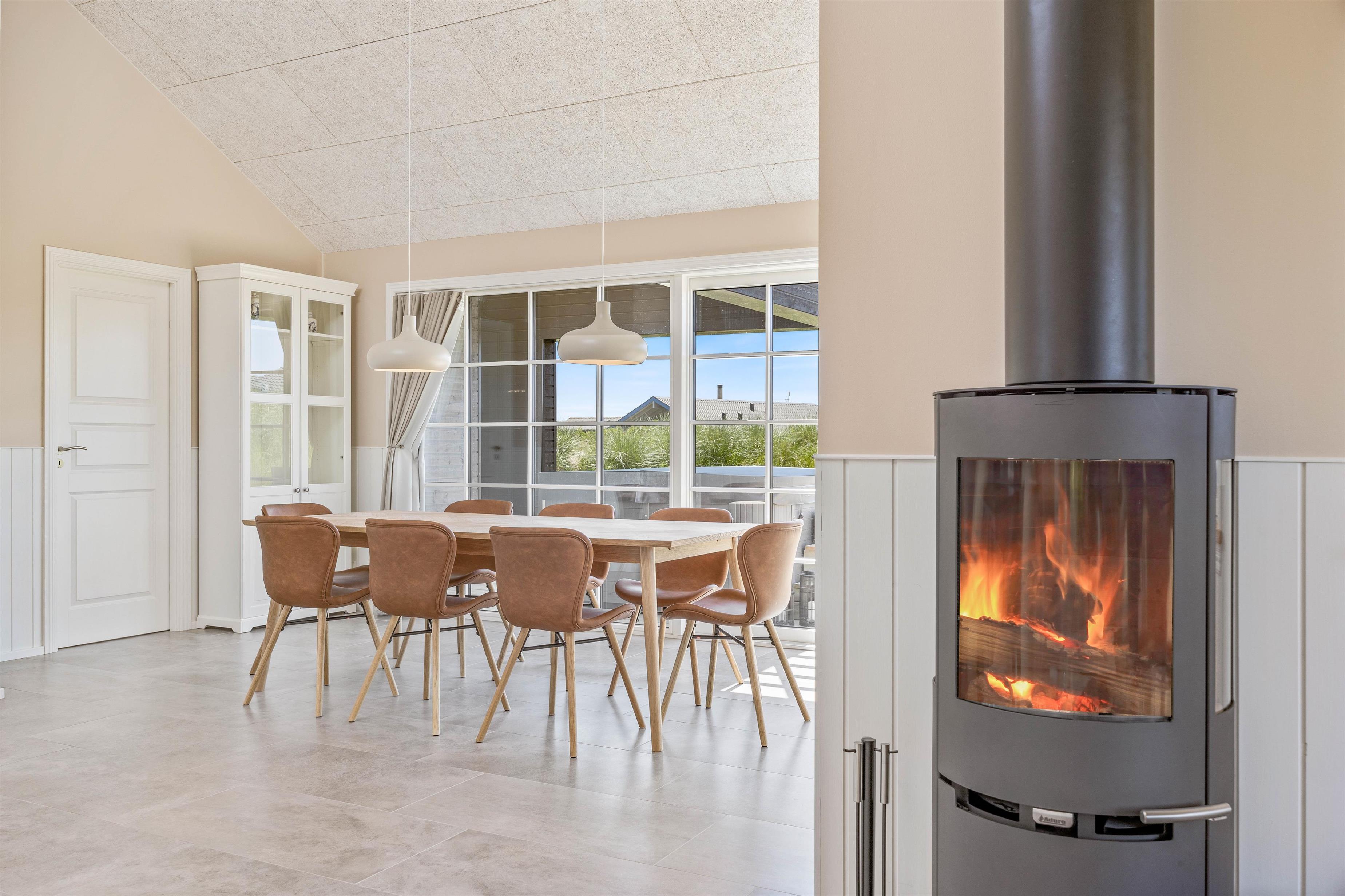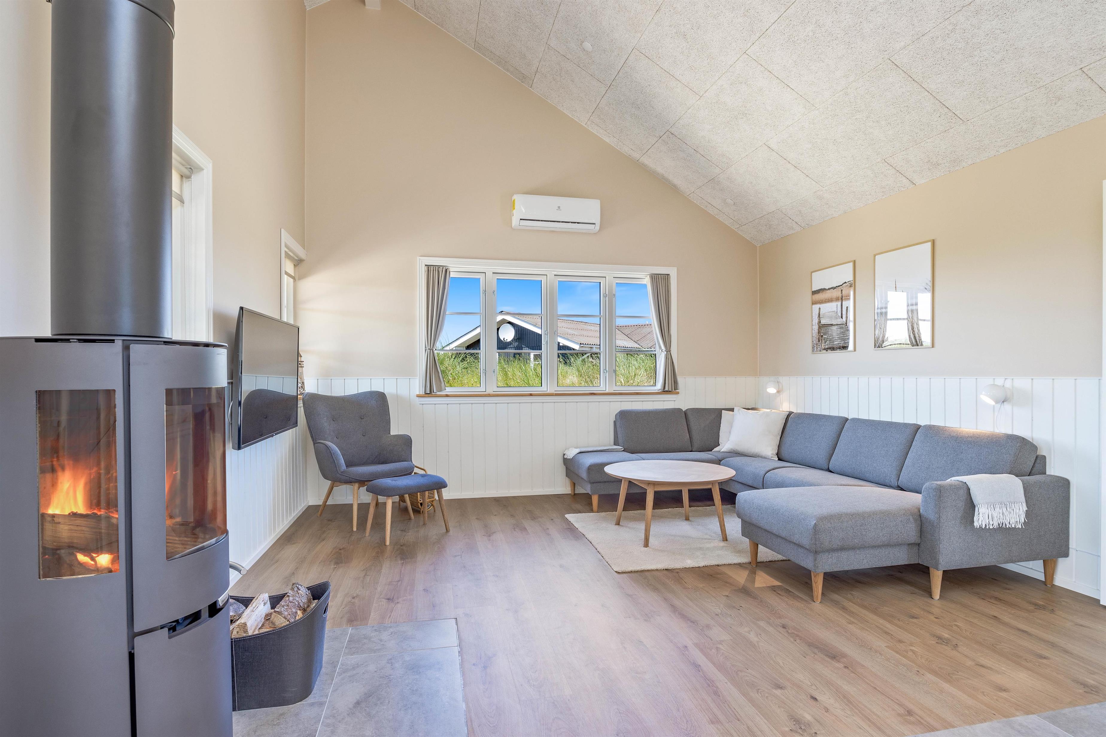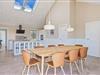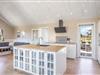 Køkkenet er stort og åbent med loft til kip og masser af lys. Op til feriehusets rummelige køkkenalrum finder I ”hyggekrogen” – stuen, der med den bløde sofagruppe, brændeovnen der knitrer, samt det fine trægulv er med til at skabe den helt rigtige sommerhusstemning.