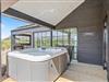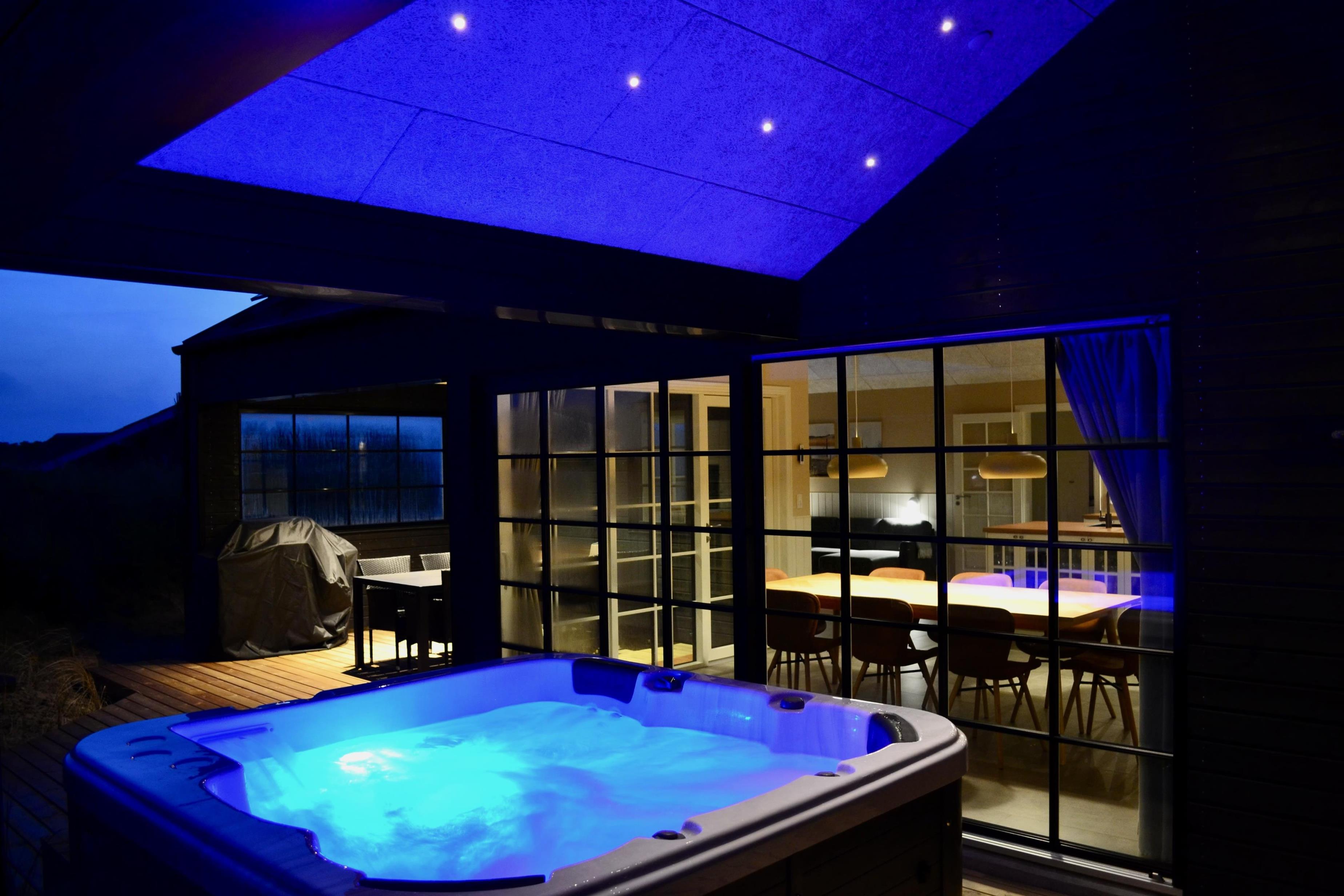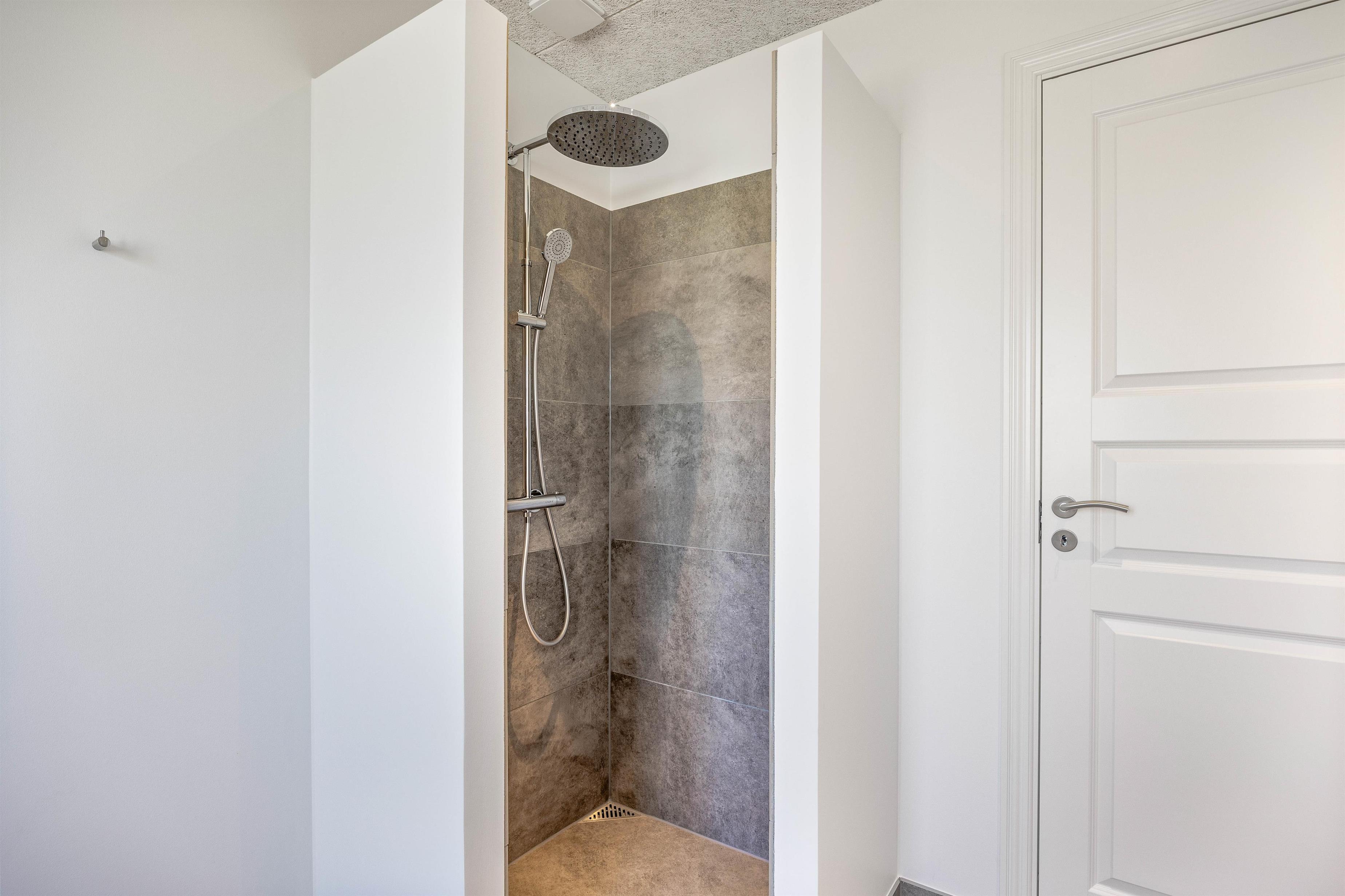På terrassen finder I liggestole og den store udespa med plads til 6 personer. Herfra har I adgang til den integrerede udebruser. Udebruseren kan benyttes fra april til november.