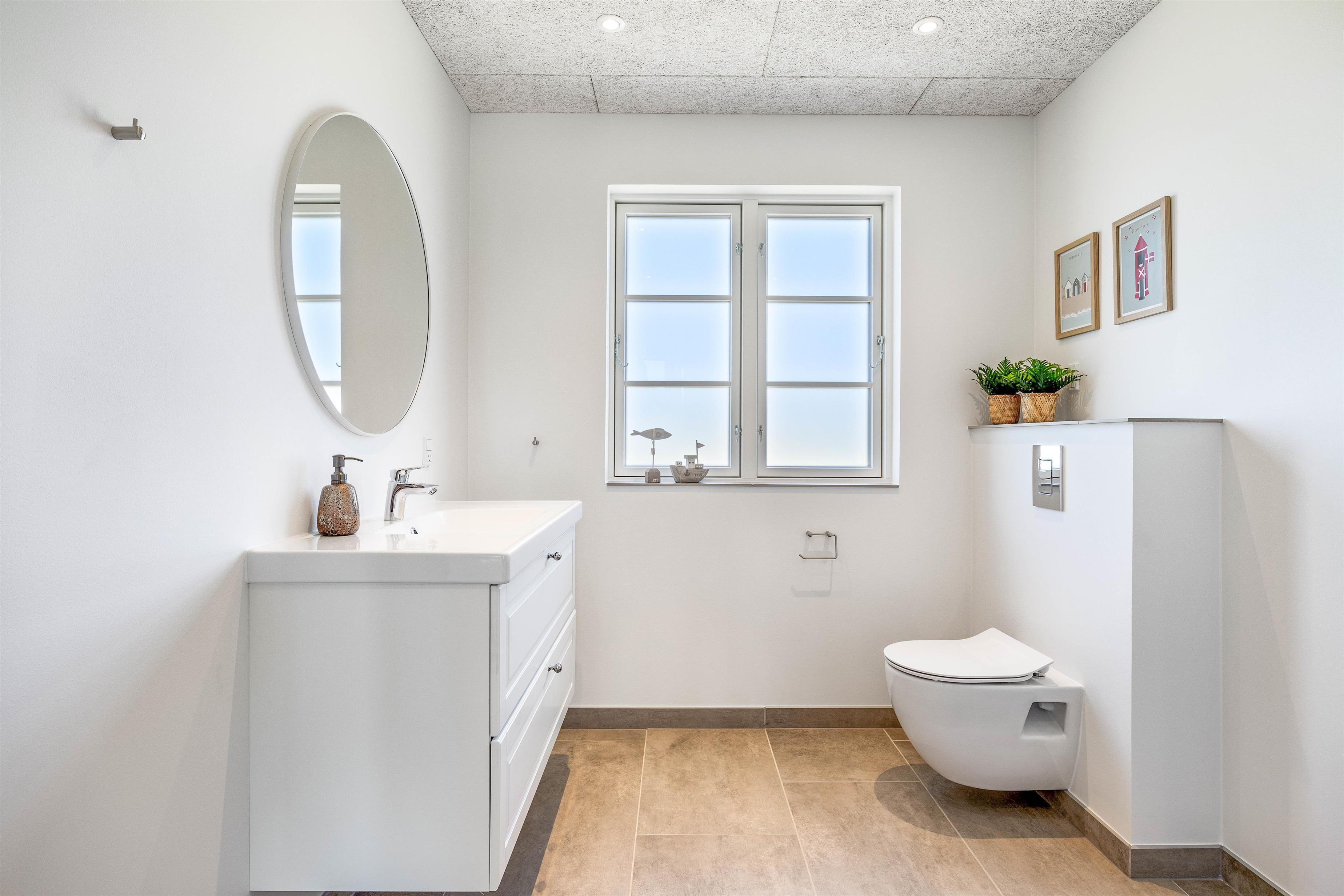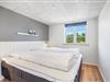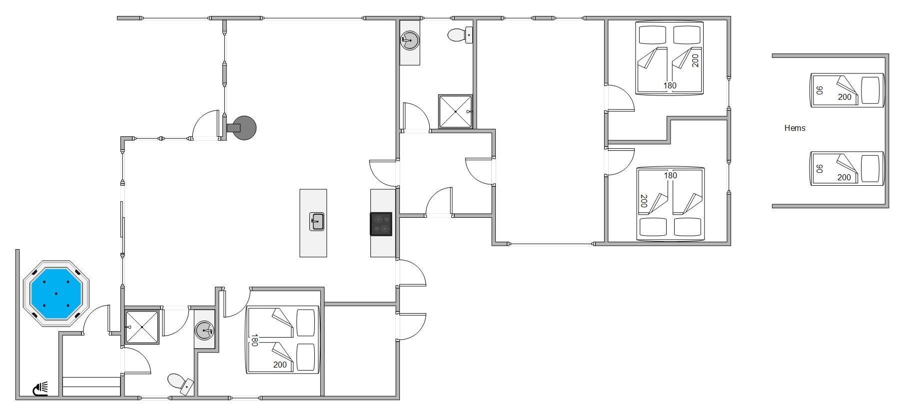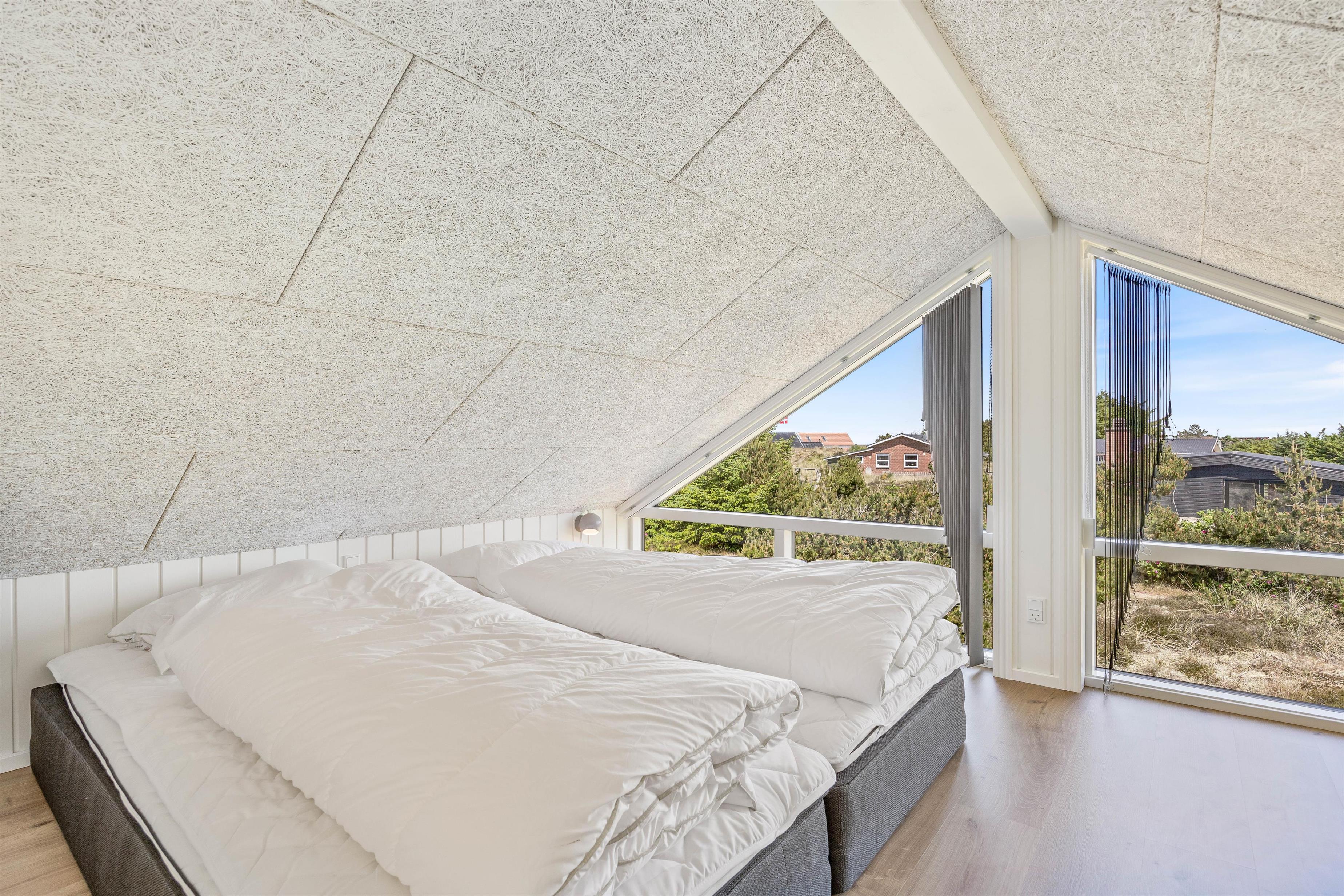 Der er 3 store værelser med dobbeltsenge og 2 badeværelser, hvoraf det ene har adgang til sauna samt udgang til den store terrasse med udespaen mod vest. Ligeledes findes en dejlig stor hems med 2 soverpladser. Der er tænkt på hver en detalje igennem hele feriehuset og ved behov kan i tænde for de energibesparende varmepumper.