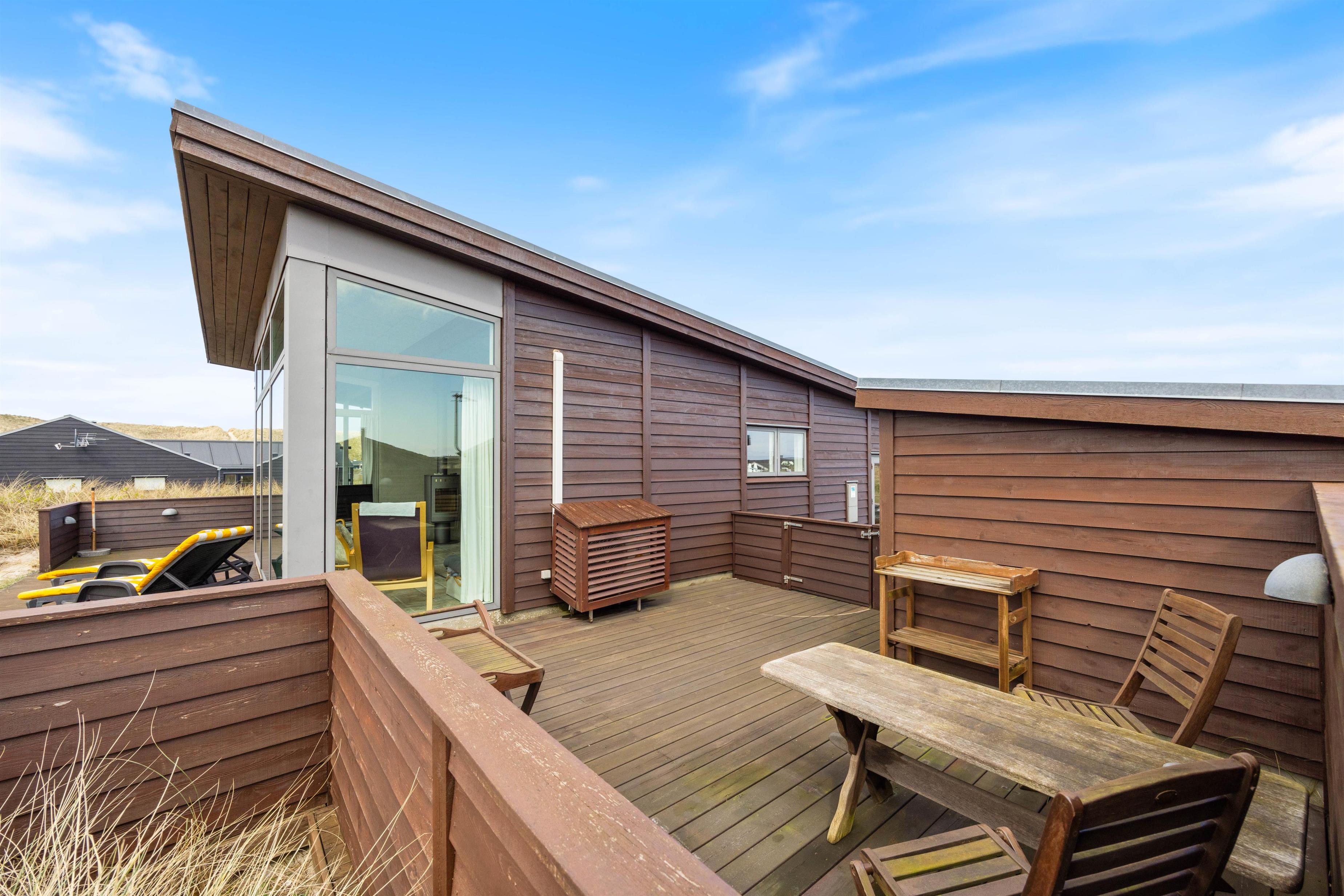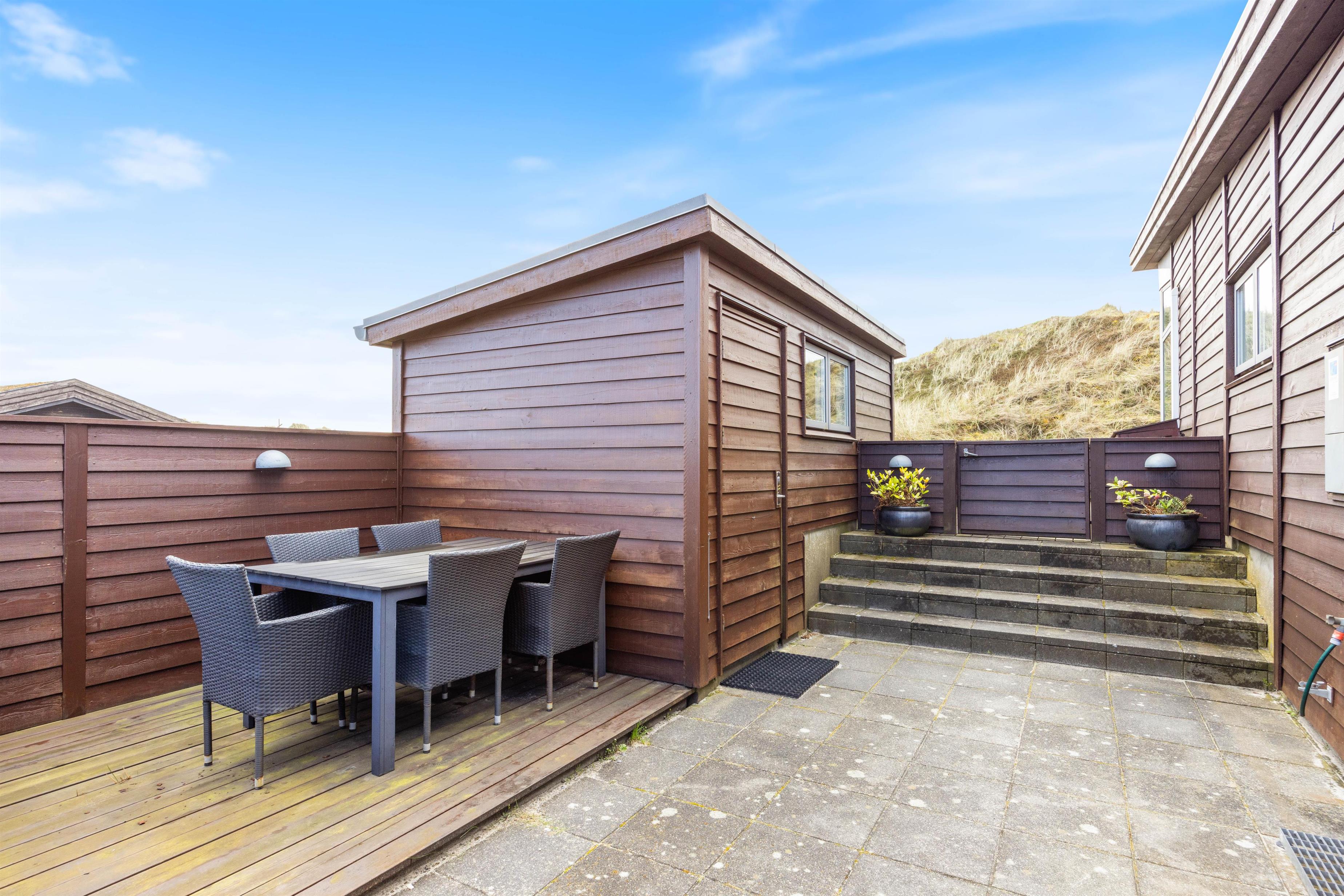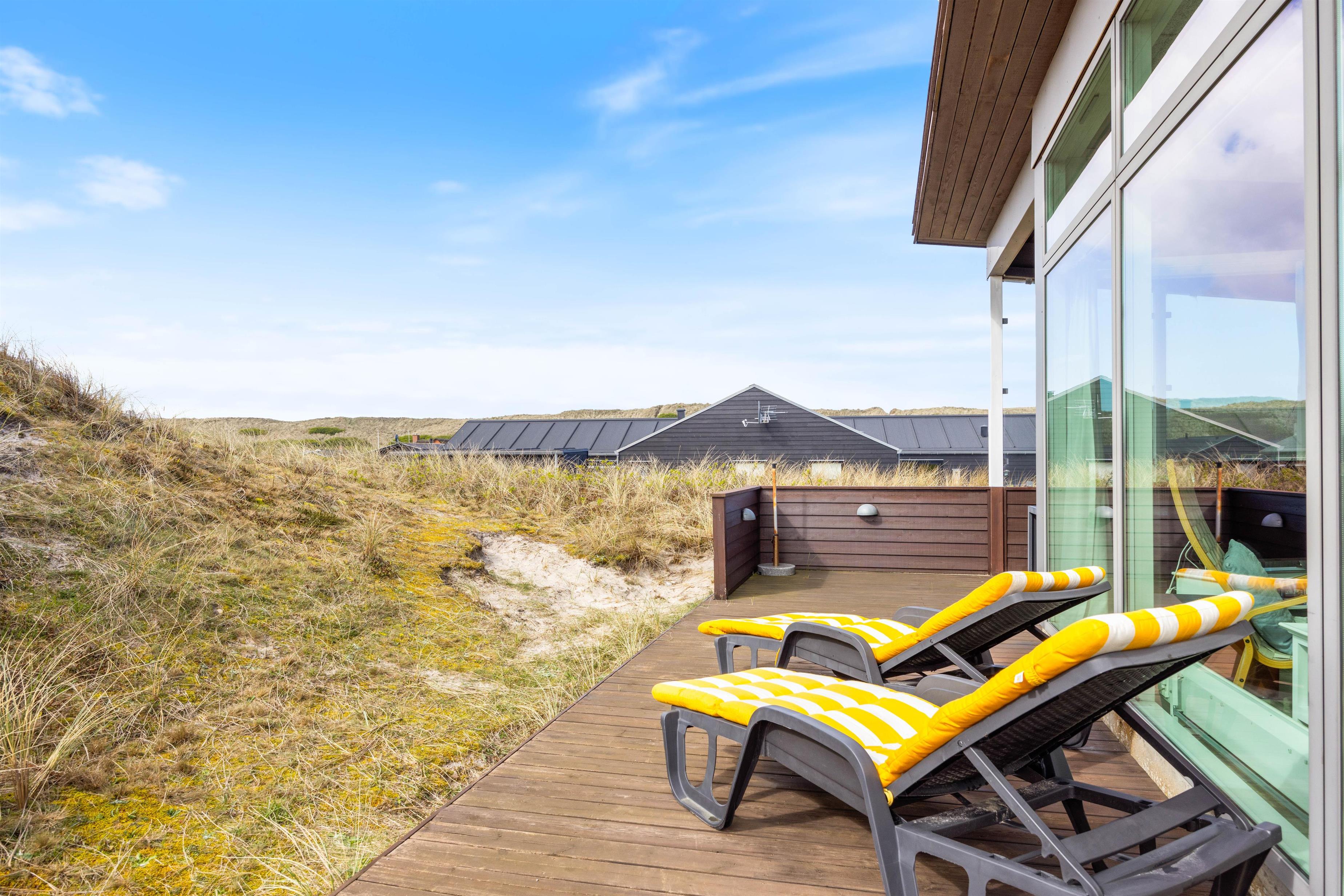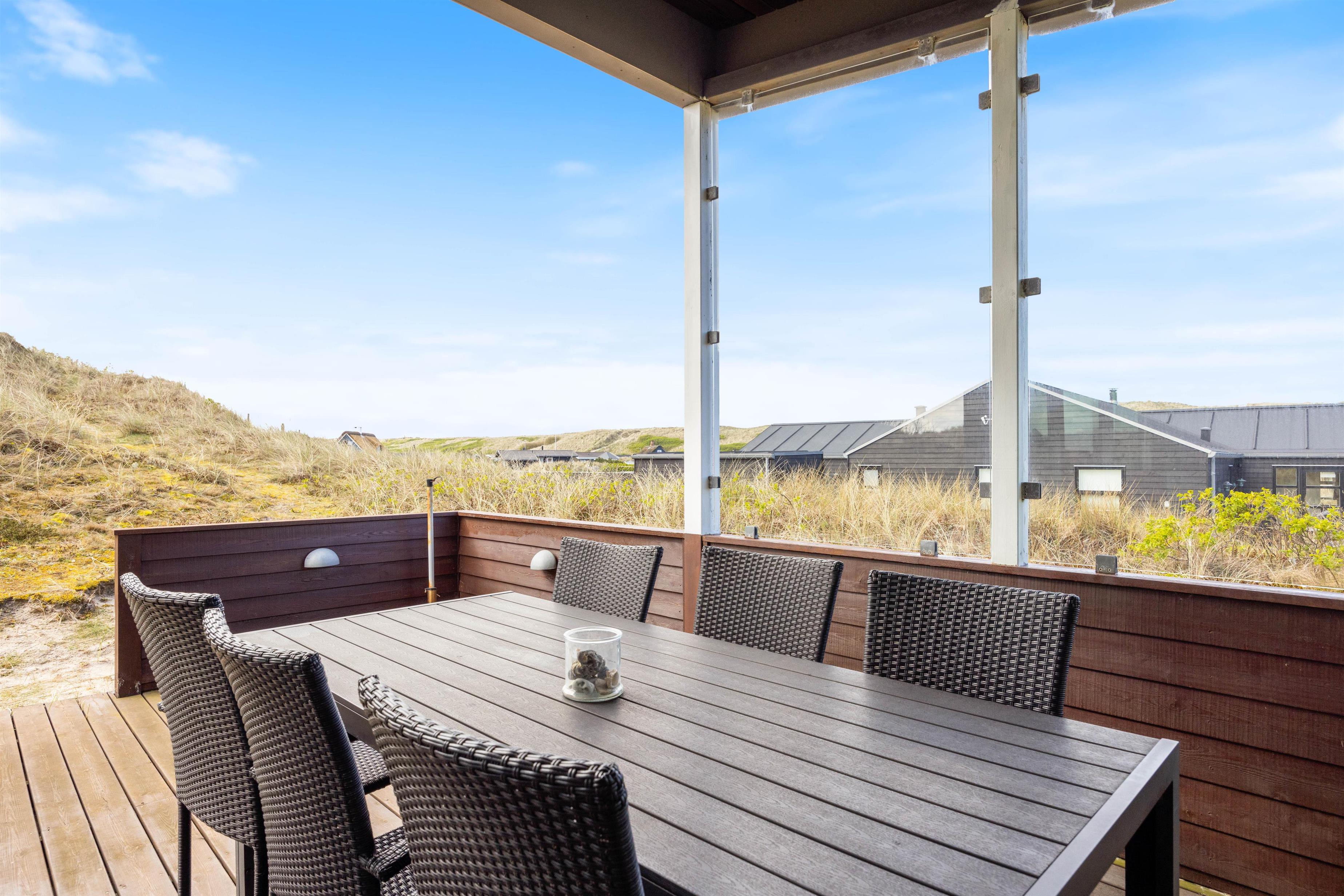 Omkring feriehuset har du nogle dejlige terrasser, der indbyder til afslapning, solbadning og grillhygge hele dagen lang. Og fra terrasserne kan du også nyde den smukke udsigt – ikke kun over naturgrunden, men også til klitterne.