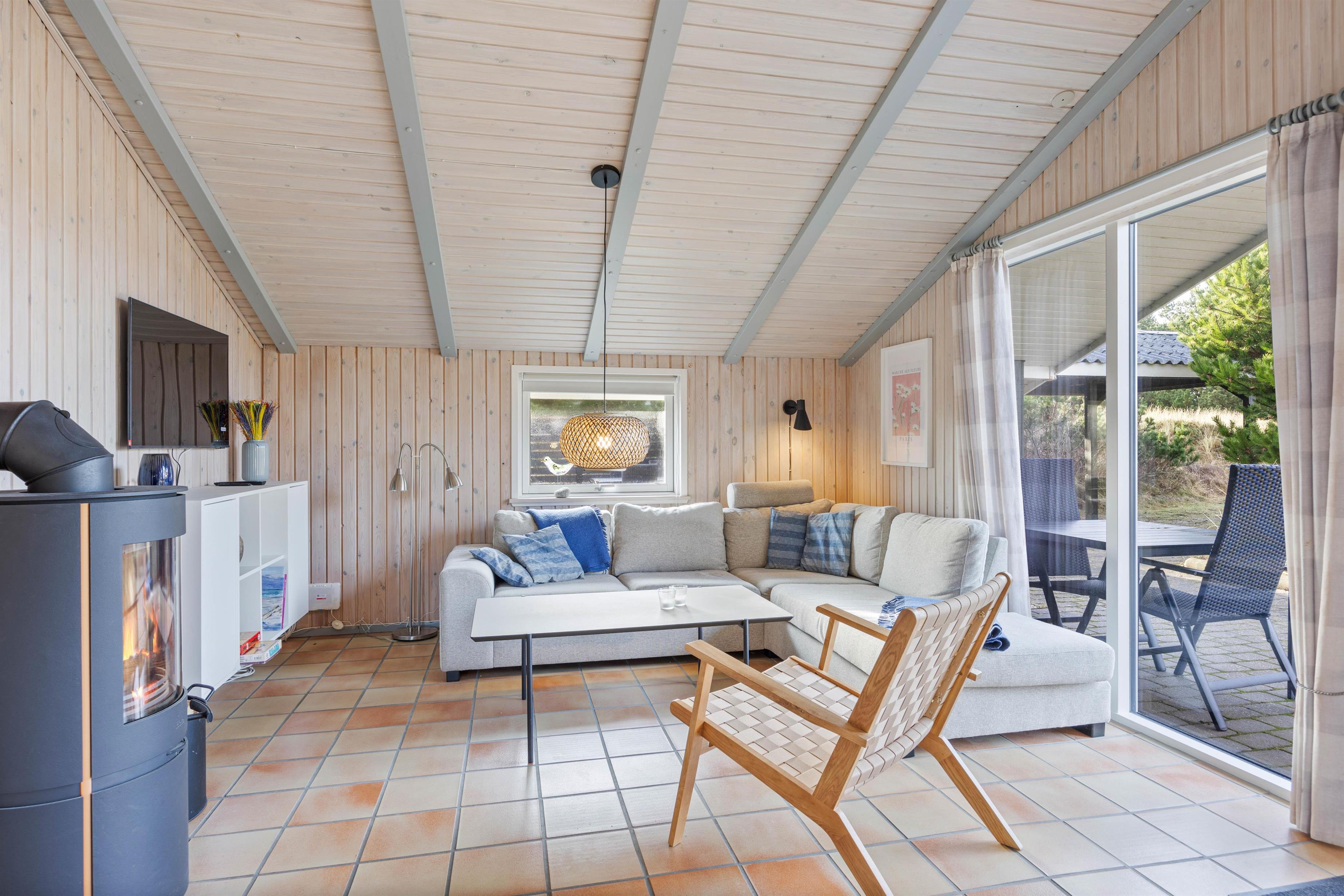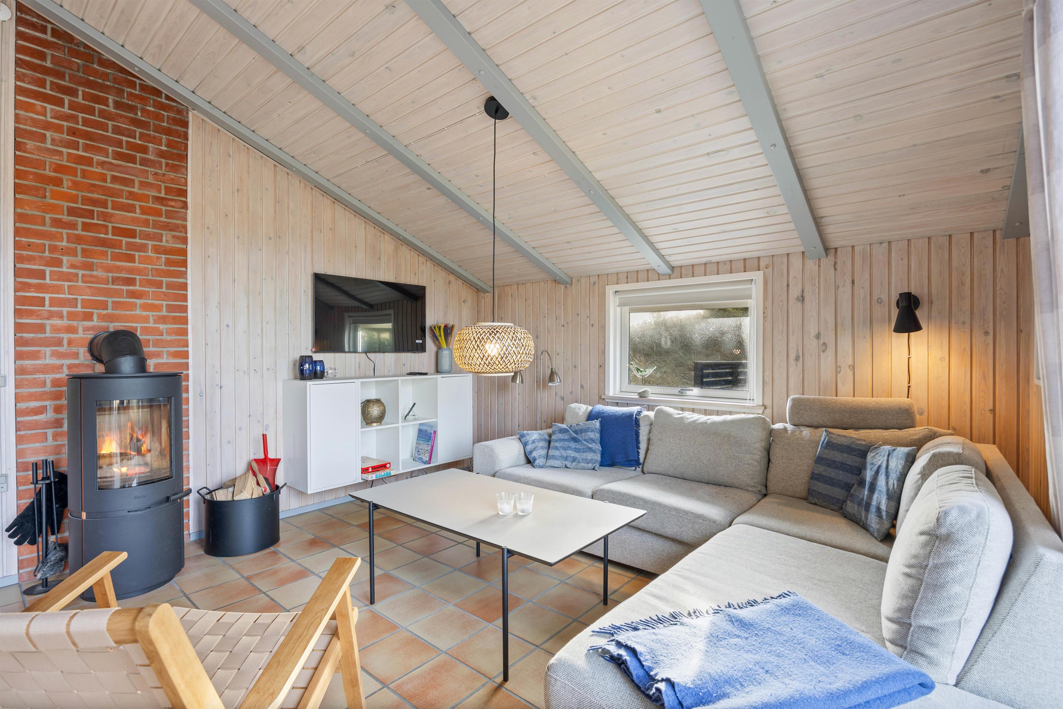 Dette skønne sommerhus på Bjerregårdsvej 163 byder jer velkommen med ægte sommerhusstemning. Stuen emmer af hygge og indbyder med komfortable møbler til afslapning for hele familien. Tag din yndlingsbog og en lækker kop kaffe og gør det behageligt foran den knitrende brændeovn. Sommerhuset har desuden en energibesparende varmepumpe, som kan bruges til opvarmning.