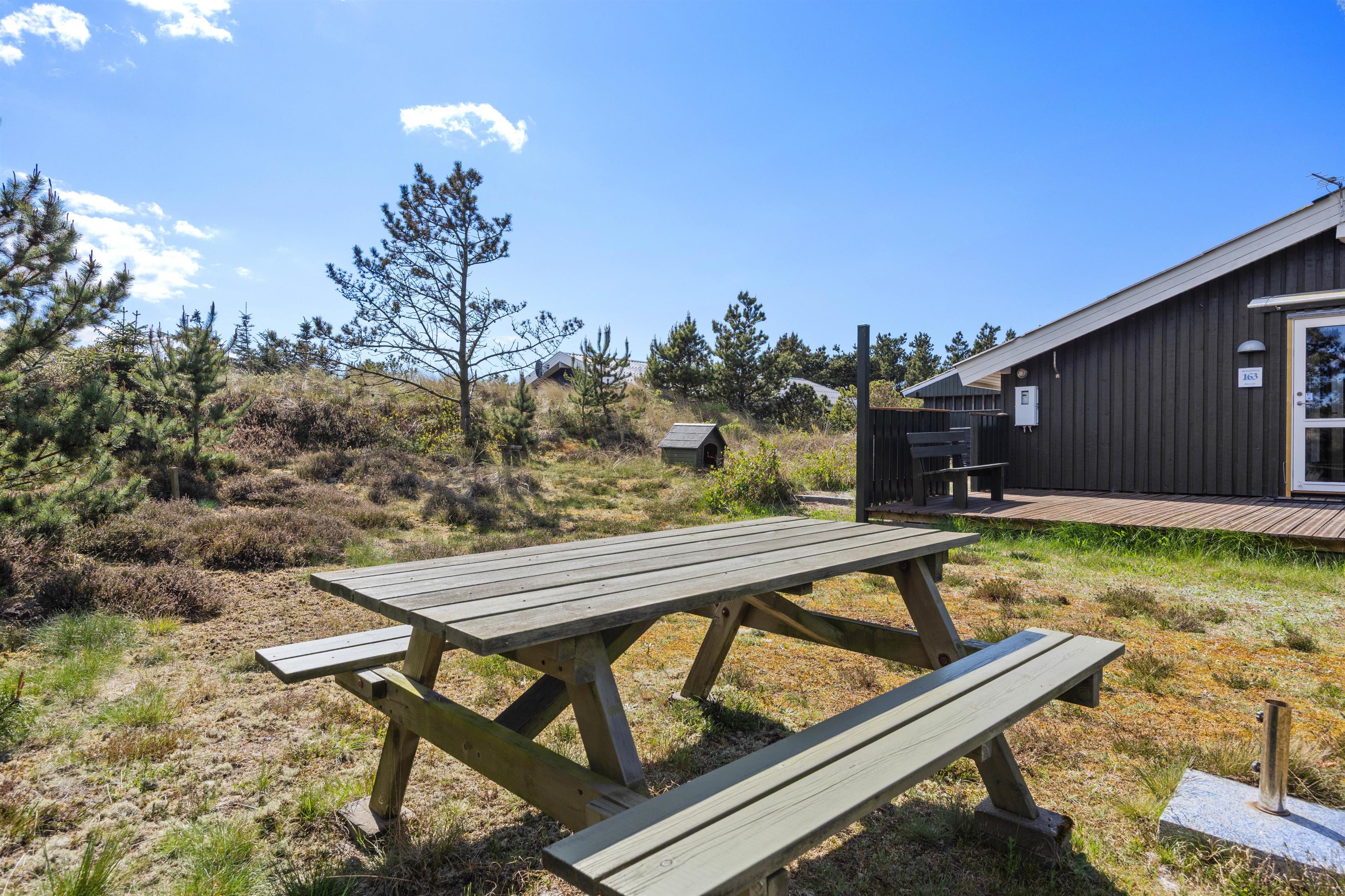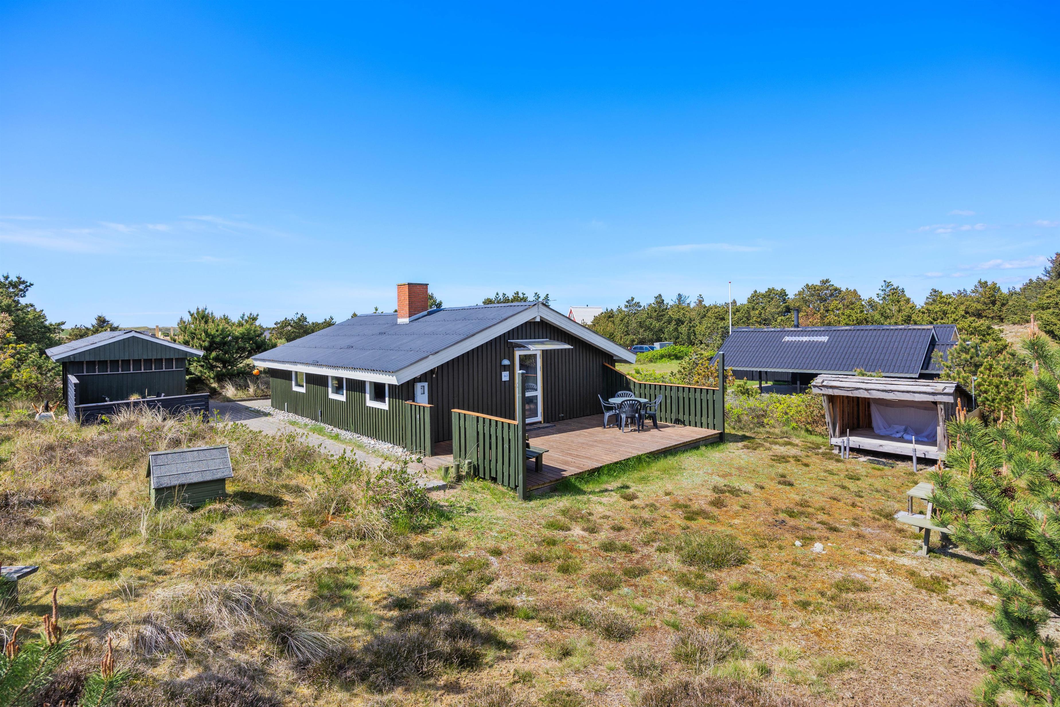 Er du på udkig efter et charmerende sommerhus ved Vestkysten, hvor både du, din familie og jeres hund kan nyde en afslappende ferie? Så er dette hyggelige sommerhus på Bjerregårdsvej 163 helt sikkert noget for jer. Med 71 m² er der plads til op til 5 gæster og jeres firbenede ven. Brændeovnen, den hyggelige indretning og den delvist overdækkede terrasse skaber de perfekte rammer for en afslappet ferie. Som et ekstra plus har sommerhuset også et shelter, så I kan sove udendørs og vågne op til fuglenes kvidren.