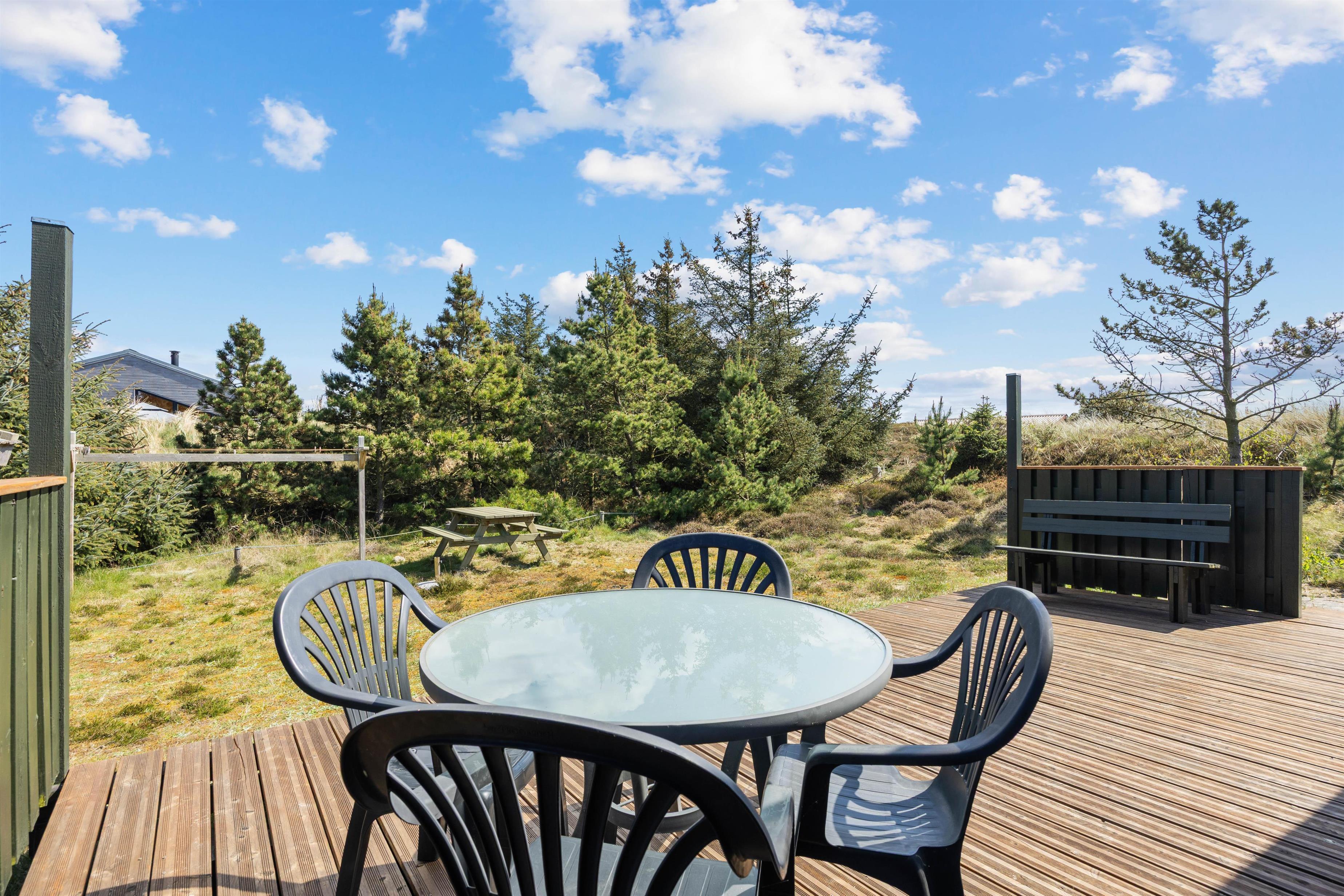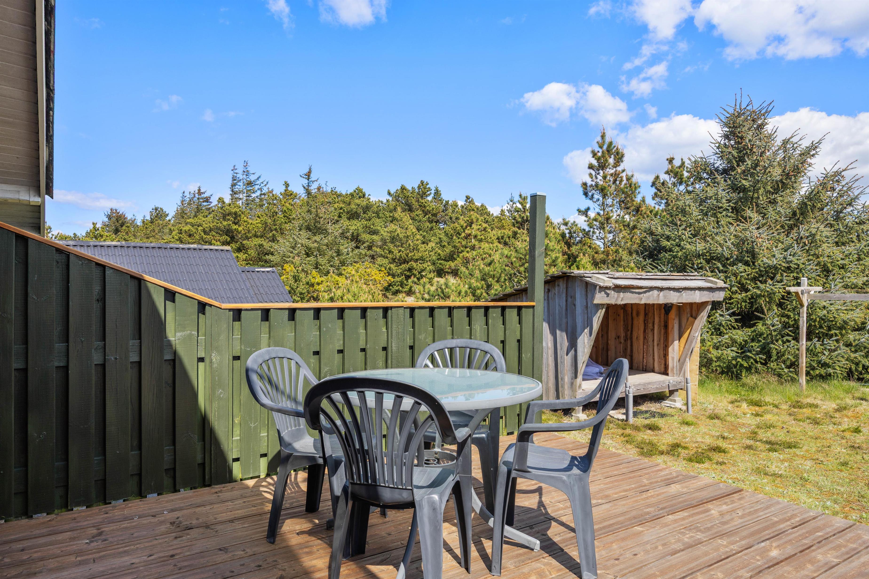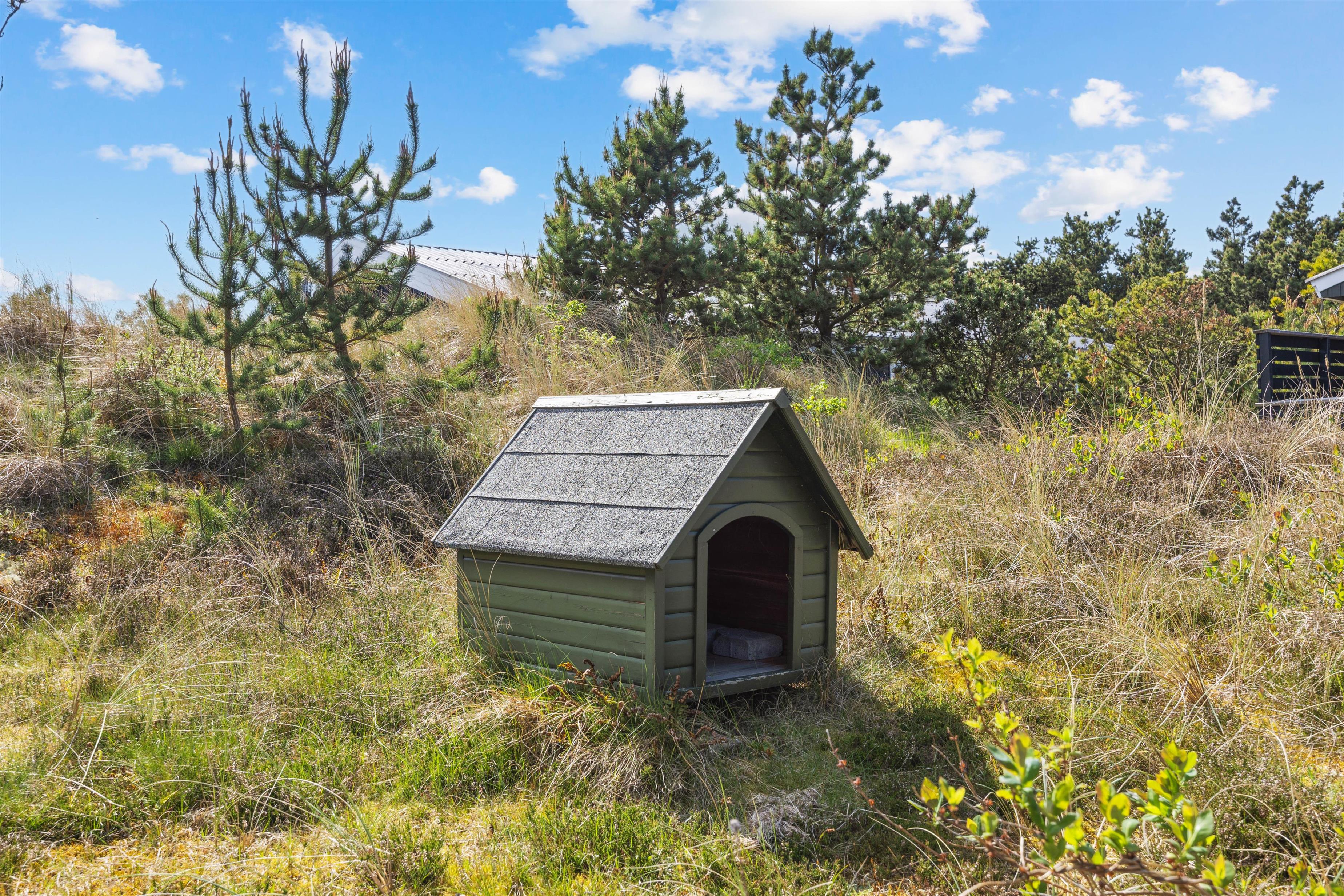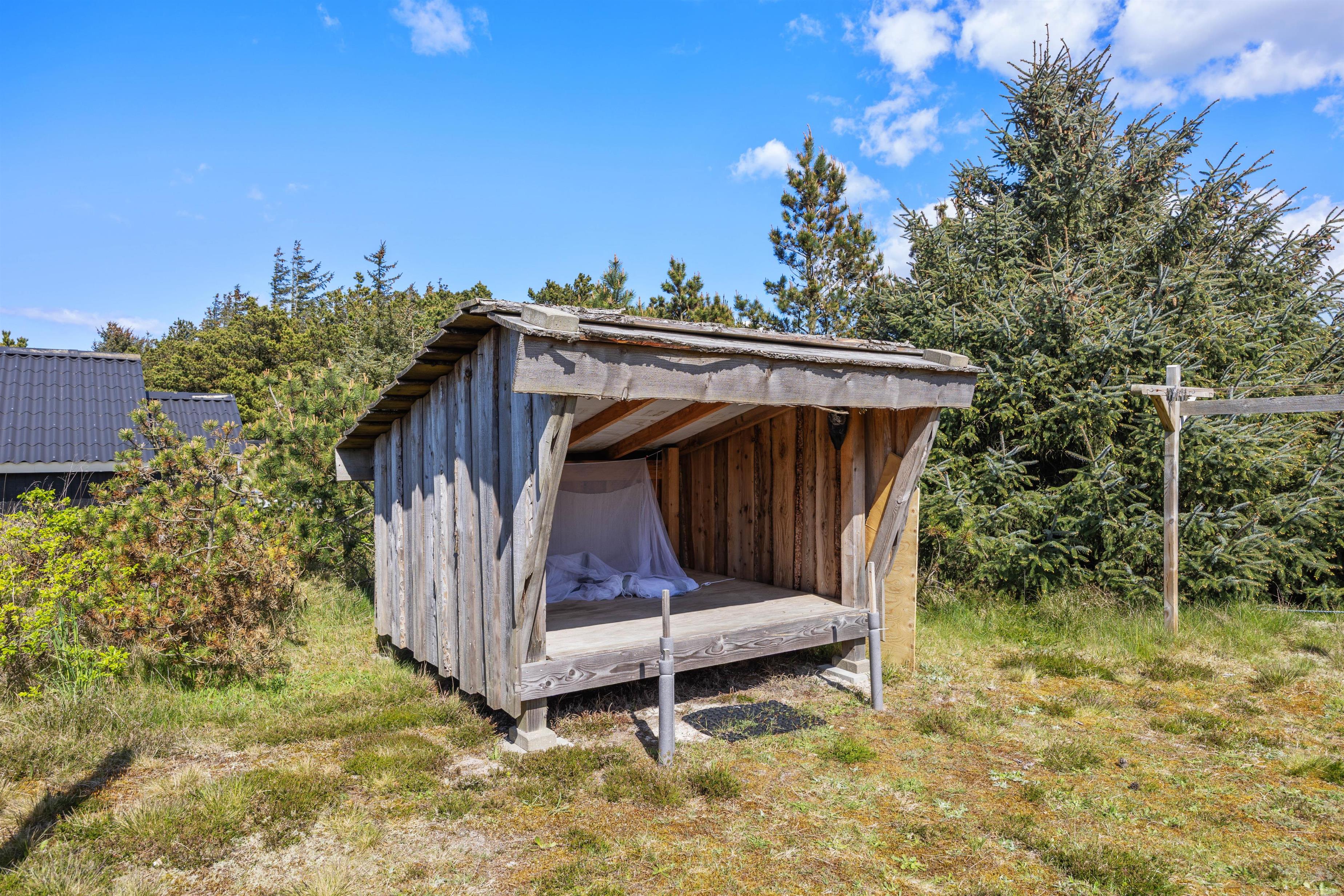 Sommerhuset er beliggende på en ca. 1200 m² stor naturgrund med shelter. Den delvist afskærmede og overdækkede terrasse er indrettet med havemøbler og liggestole, så I kan slappe af i både sol og skygge. Der er også en grill til rådighed, så I kan tilberede lækre måltider under åben himmel. Til natten har nogle af jer måske lyst til at sove i sommerhusets shelter? Der er liggeunderlag til jeres rådighed, så I kan nyde en god nats søvn i den friske luft.