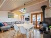 Det naturlige centrum i sommerhuset er opholdsrummet med både køkken, stue og spiseplads. Slap af i sofaen med en god bog og en kop varm kakao på en kølig efterårsdag, imens ilden knitrer lystigt i brændeovnen.
