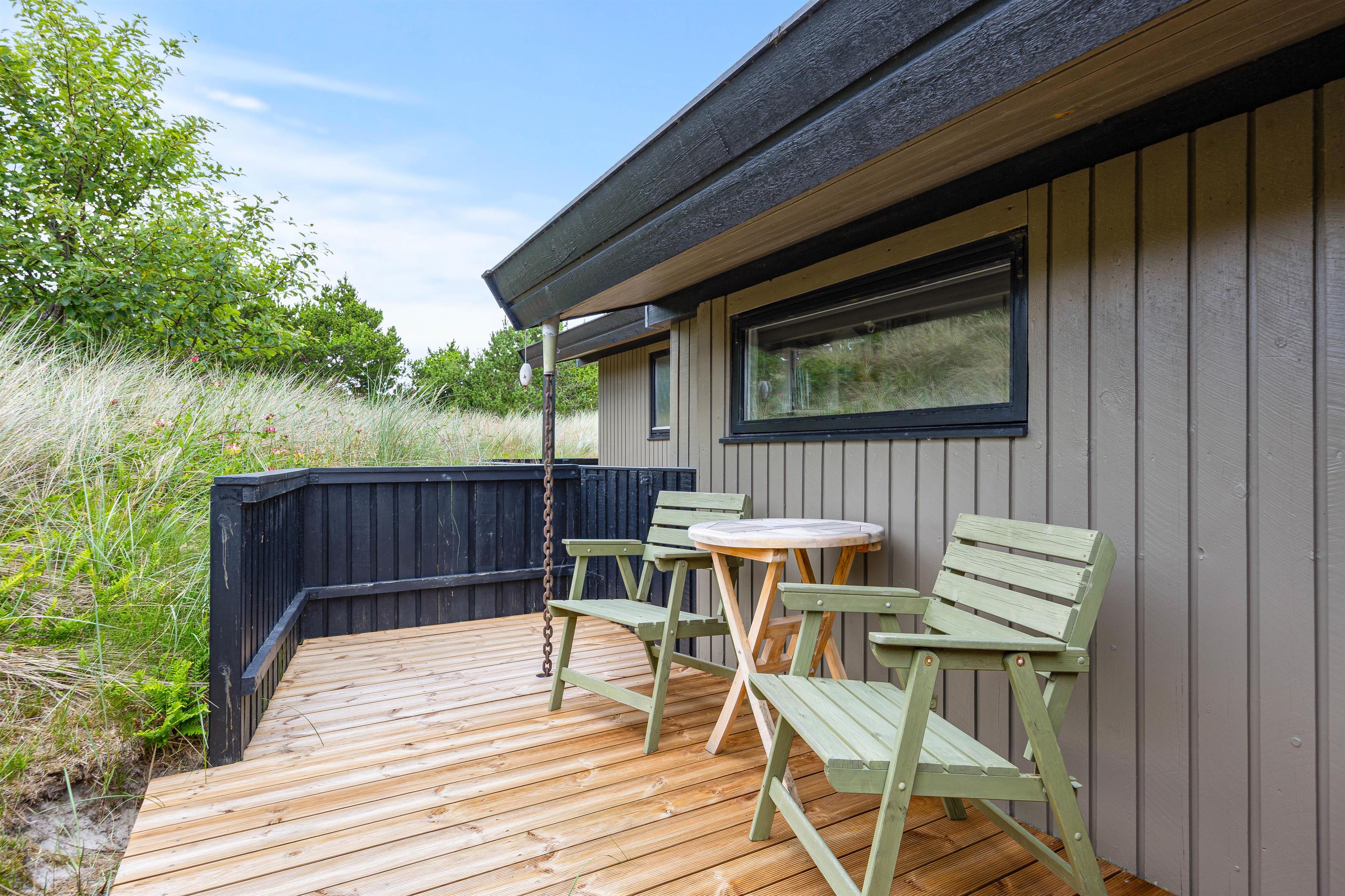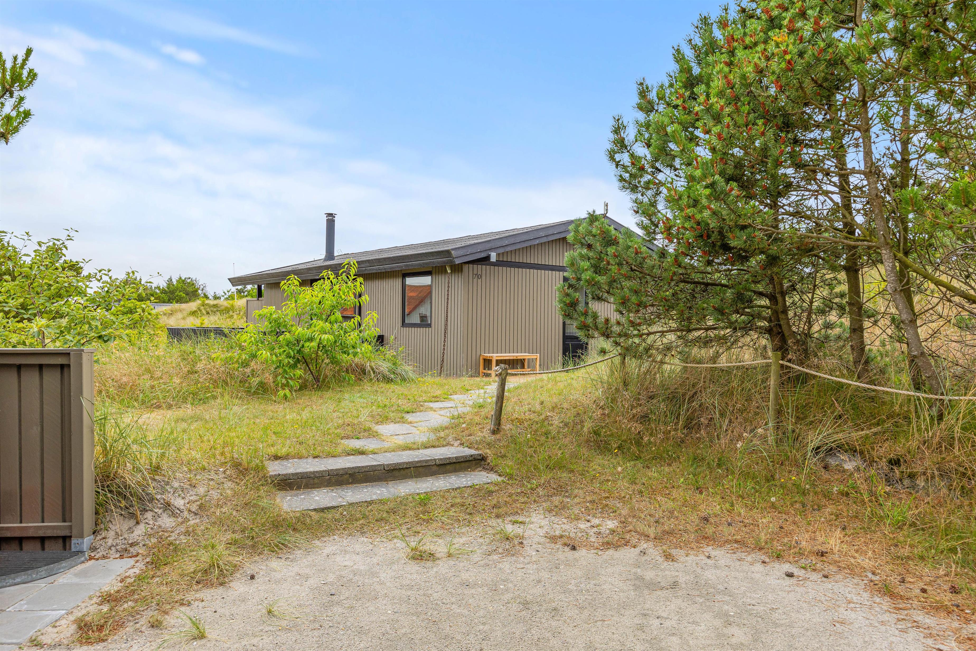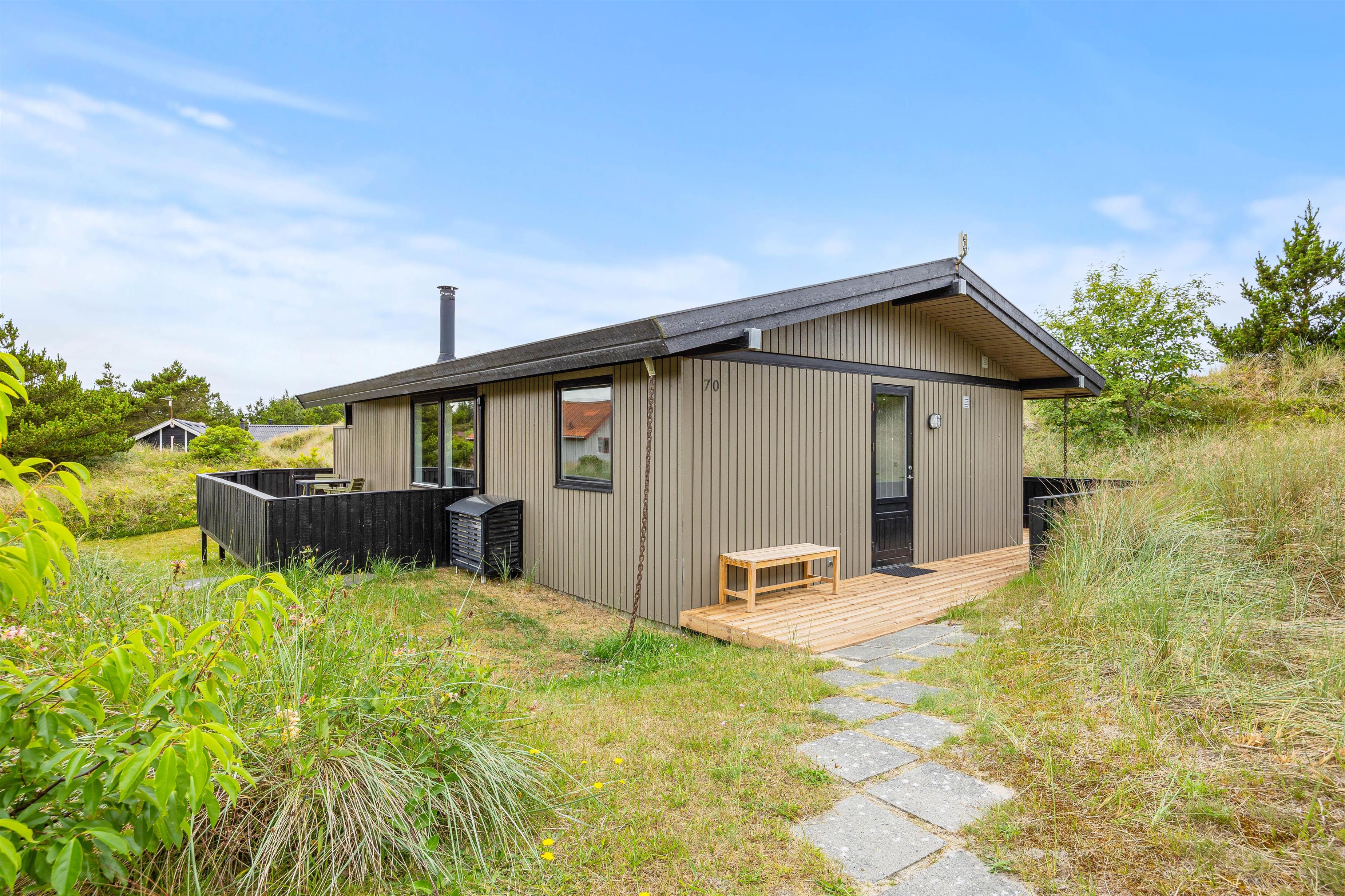 Bjerregårdsvej 70 er beliggende på en smuk naturgrund omgivet af hede og klitterne. Sommerhuset er højt beliggende, så I rigtig kan nyde udsigten fra terrassen. På den lukkede terrasse venter behagelige havemøbler og liggestole på jer, og her kan I både solbade eller finde en plads i skyggen under parasollen. Her kan I sætte jer godt til rette med lidt koldt at drikke.