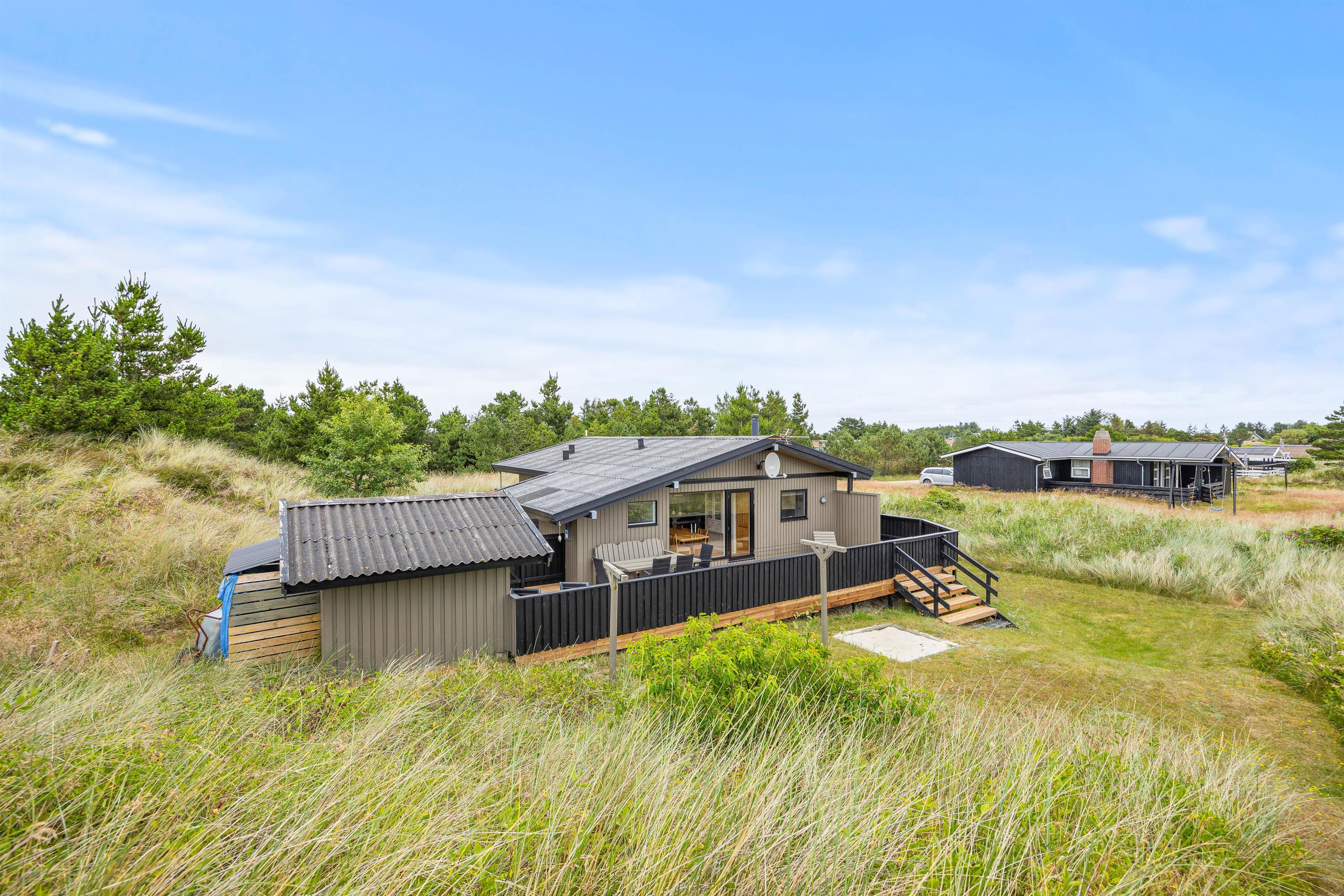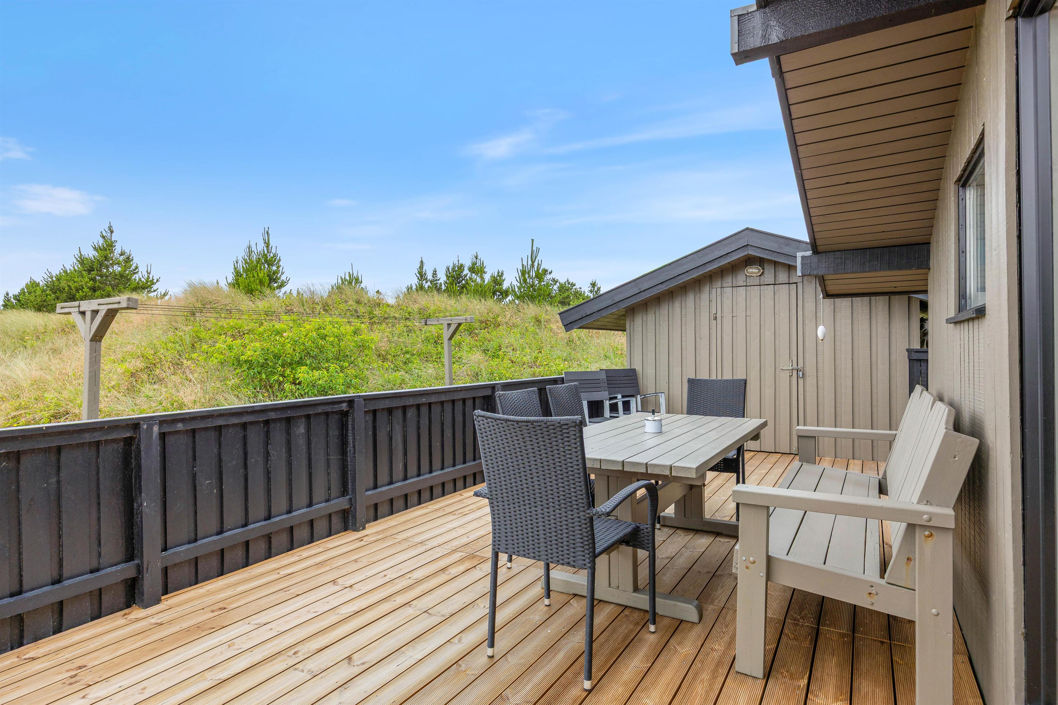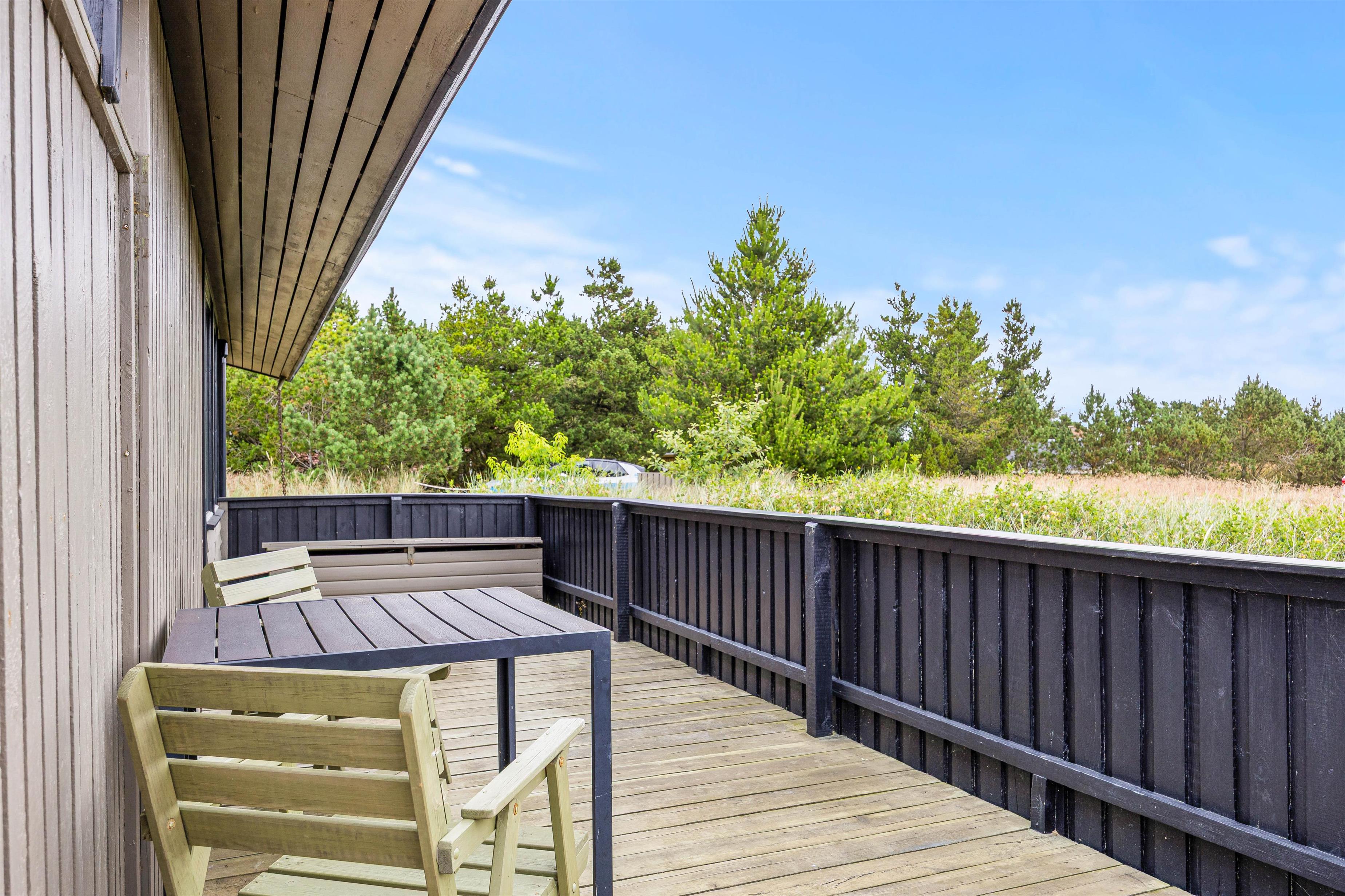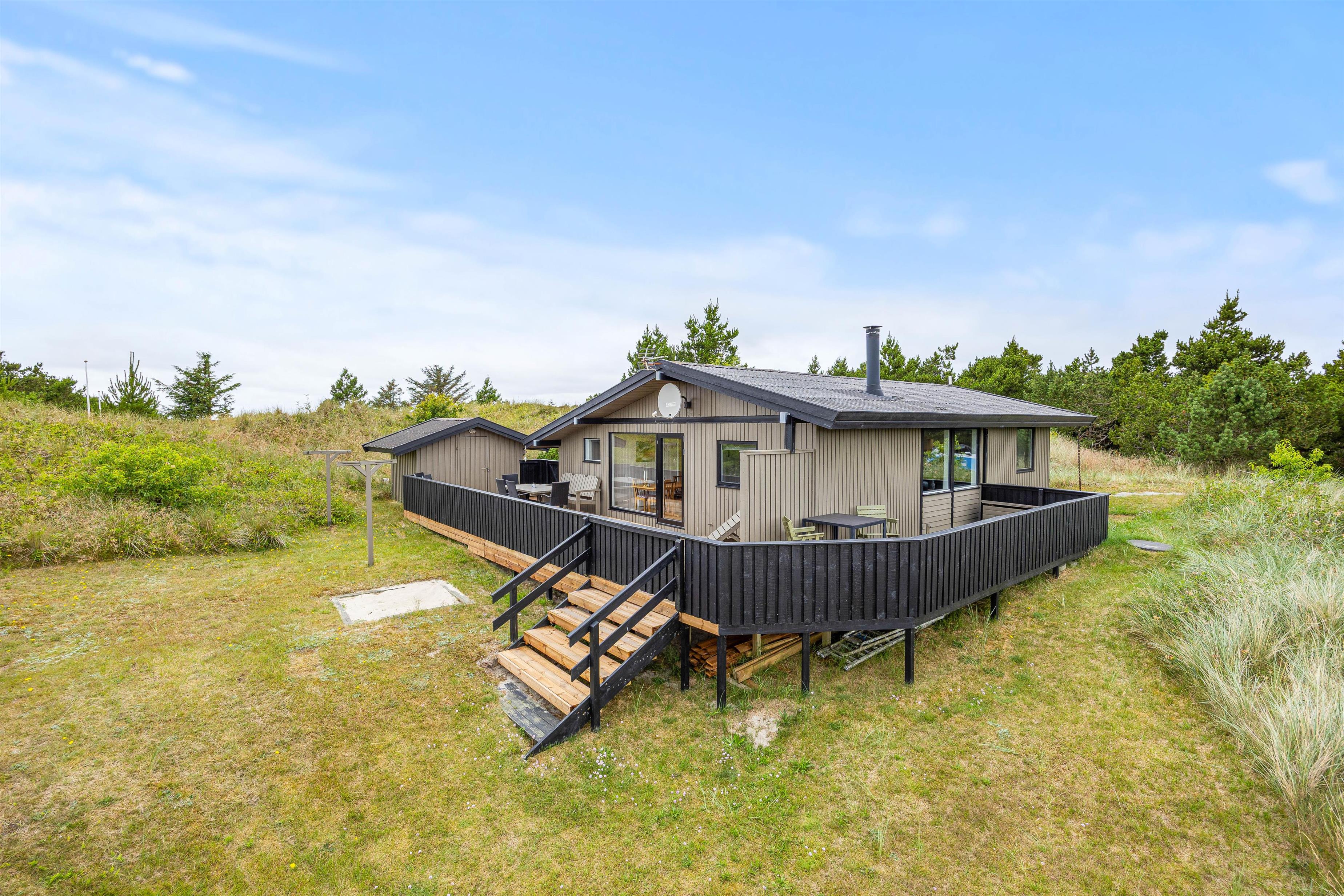 Bjerregårdsvej 70 er beliggende på en smuk naturgrund omgivet af hede og klitterne. Sommerhuset er højt beliggende, så I rigtig kan nyde udsigten fra terrassen. På den lukkede terrasse venter behagelige havemøbler og liggestole på jer, og her kan I både solbade eller finde en plads i skyggen under parasollen. Her kan I sætte jer godt til rette med lidt koldt at drikke.