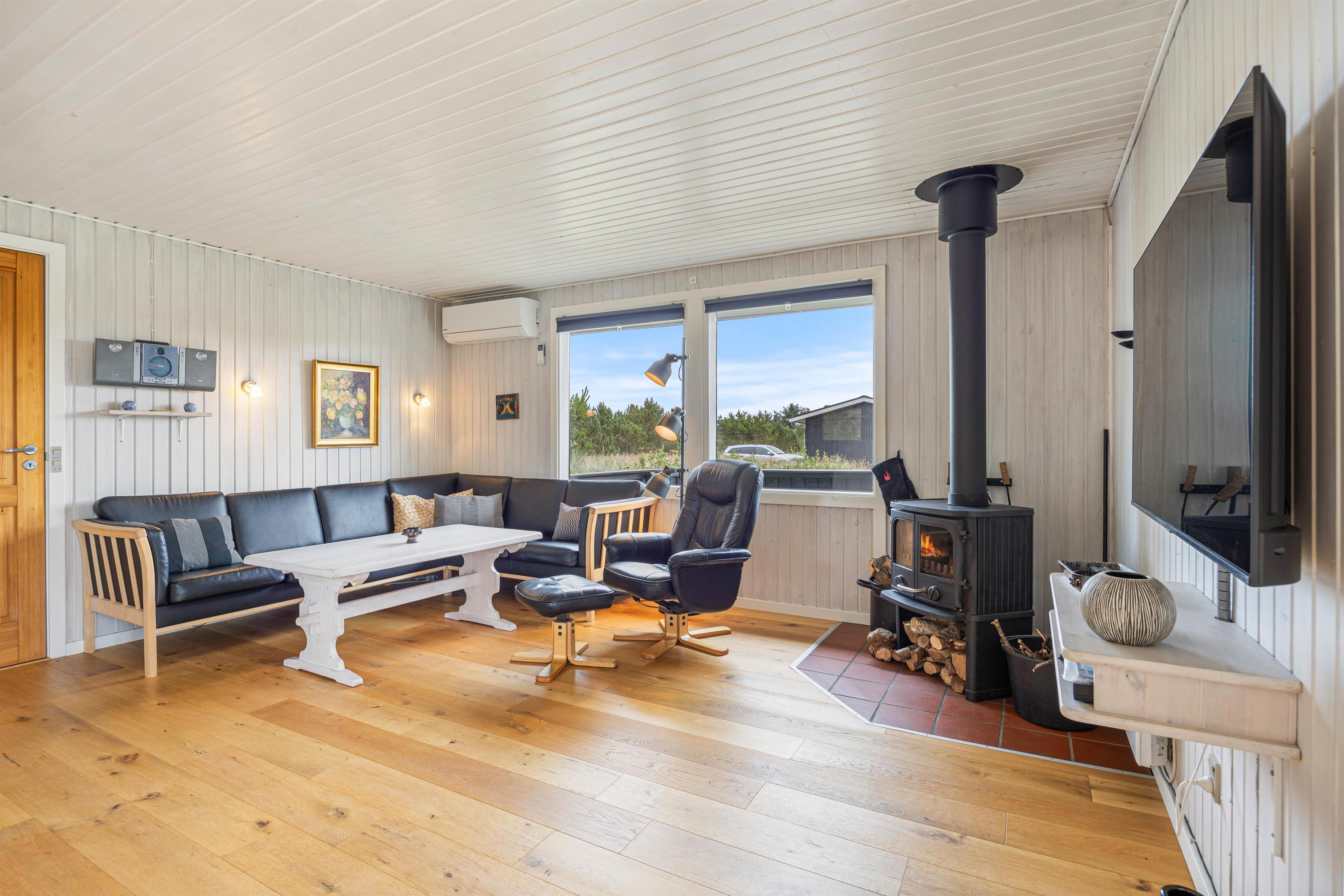 På de køligere aftener kan I med fordel tænde op i brændeovnen, som spreder varme og glæde. Slå benene op i sofaen, der indbyder til hyggeligt samvær og gode samtaler. I alrummet kan I også holde temperaturen behagelig med den energibesparende varmepumpe.