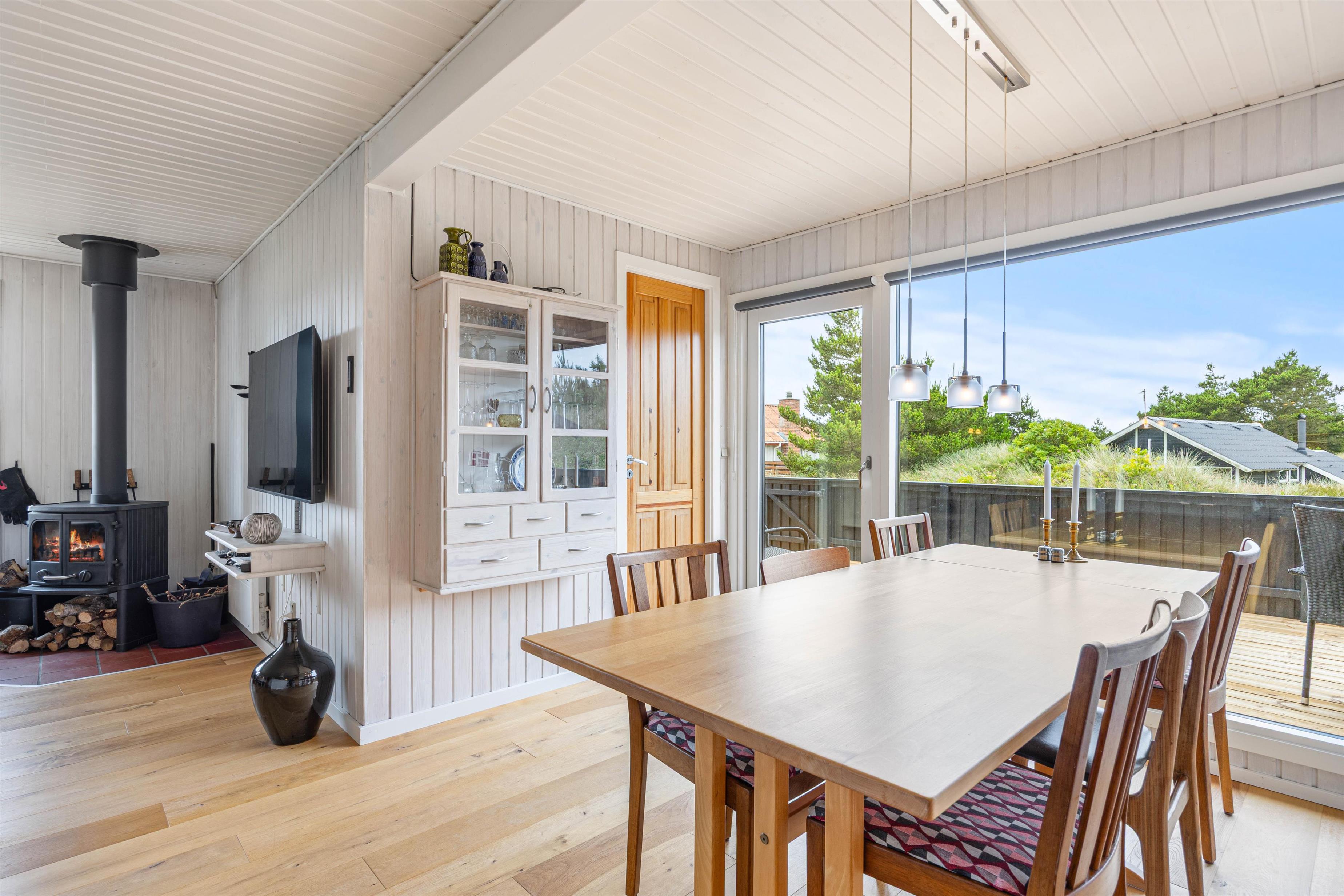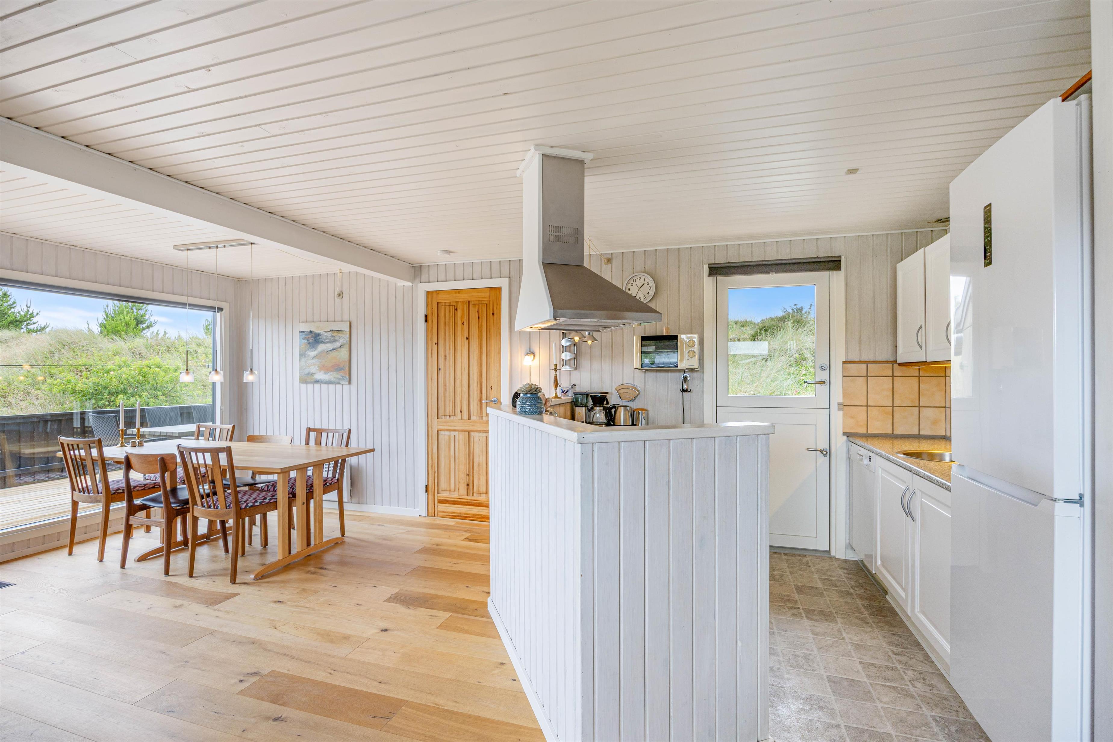 Det funktionelle sommerhus byder på en dejlig stue i åben forbindelse med køkken, og dette rum vil bestemt blive samlingspunktet. Her er rummeligt og de store vinduer omkring spisebordet bidrager med en masse naturligt lys. Saml jer omkring et brætspil og nyd efterfølgende et lækkert måltid lige her. Her kan I også lade børnene sidde og tegne, mens der bliver lavet mad i det velfungerende køkken.