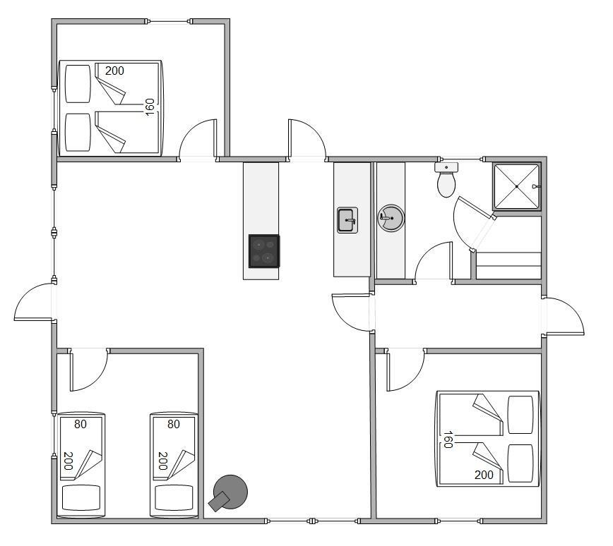 Sommerhuset har tre gode soverum, som er placeret i hvert sit hjørne. På to af værelserne er der gulvtæppe. Et værelse har to enkeltsenge og de andre to en dobbeltseng, 160x200cm.